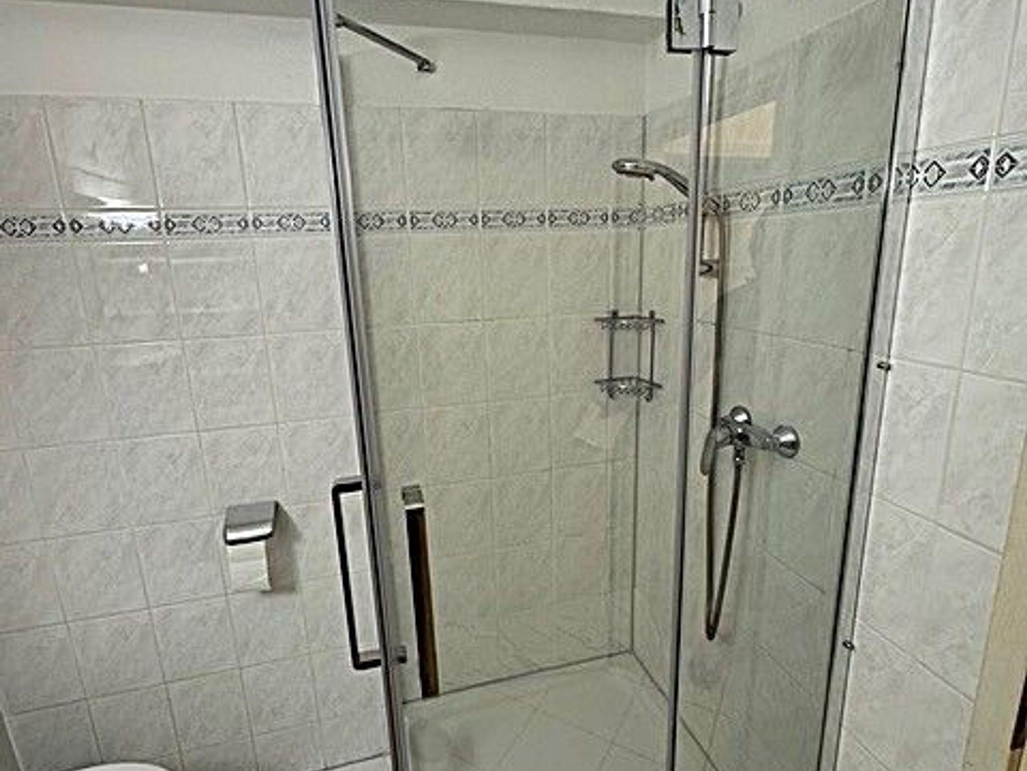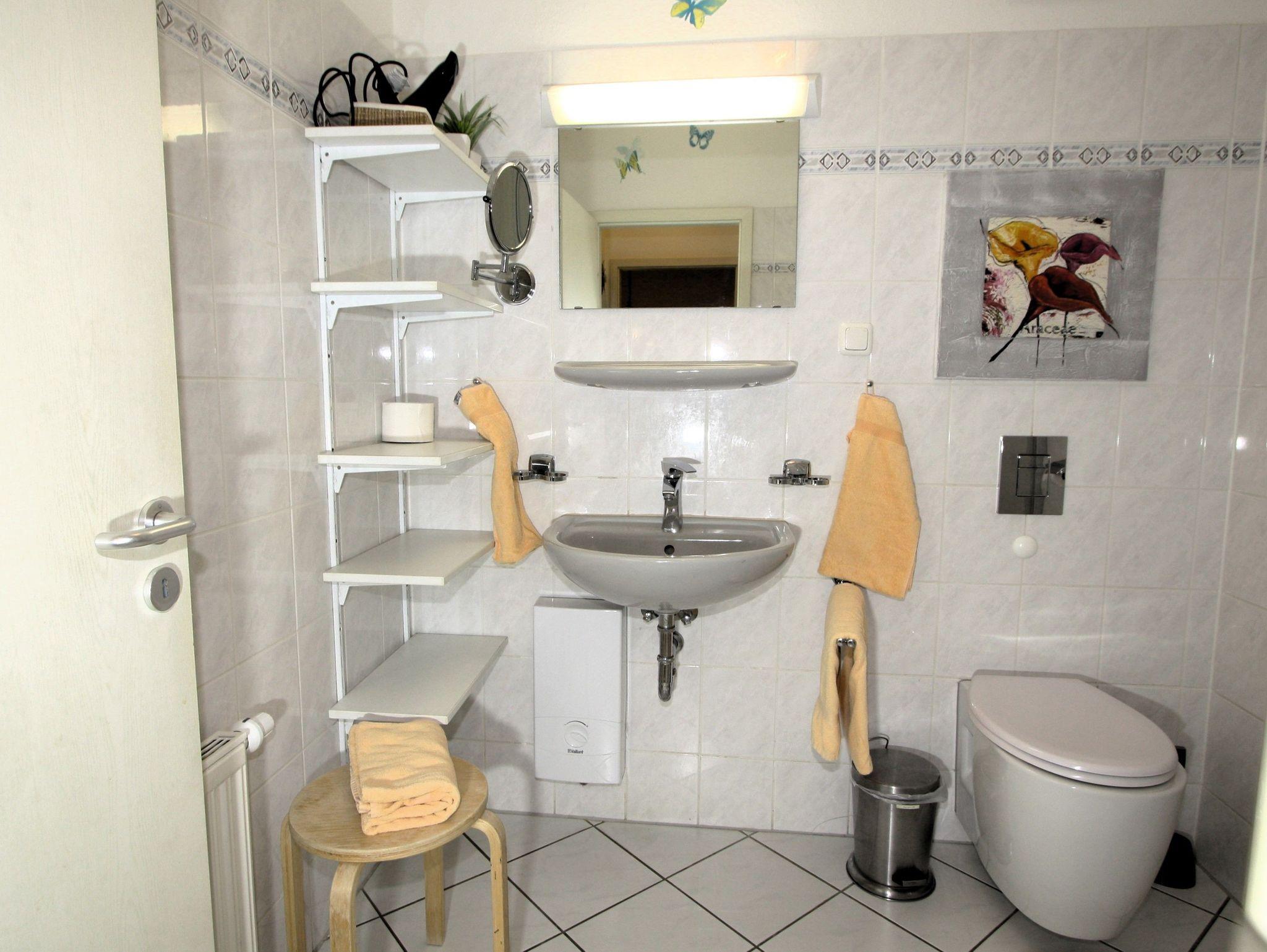 Das Bad mit Dusche und dem um 5 cm über Standartmaß erhöhten WC ist über den Flur von jedem Zimmer separat zugänglich.