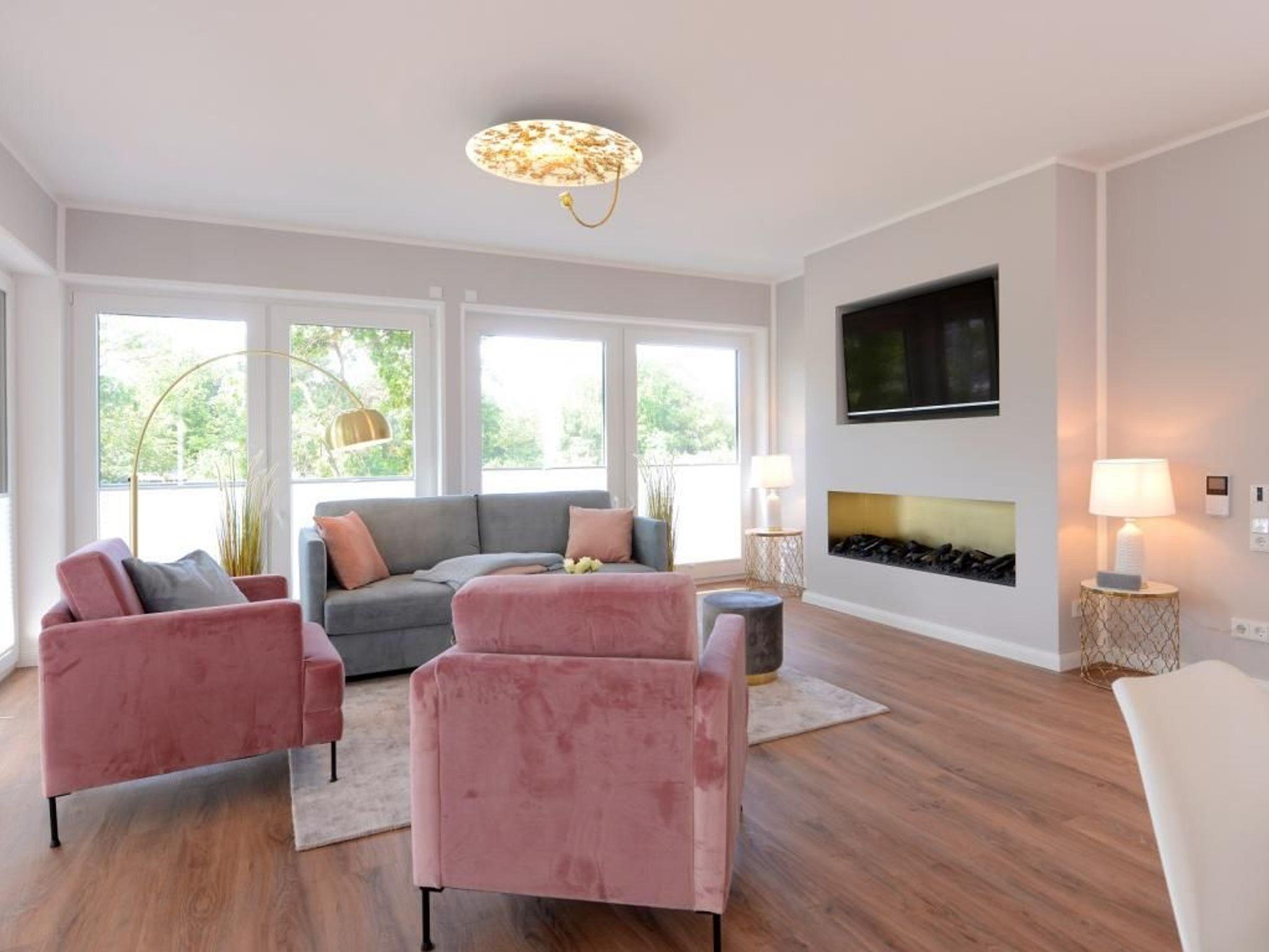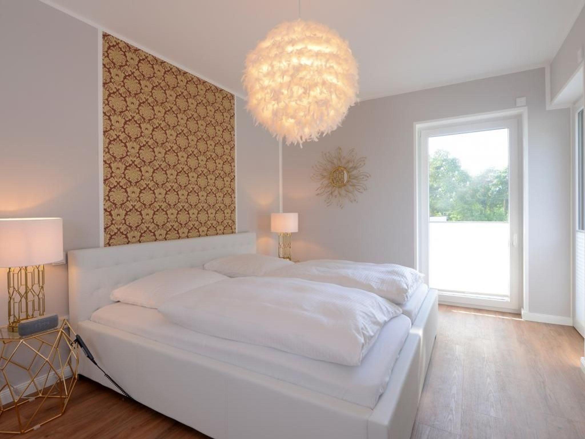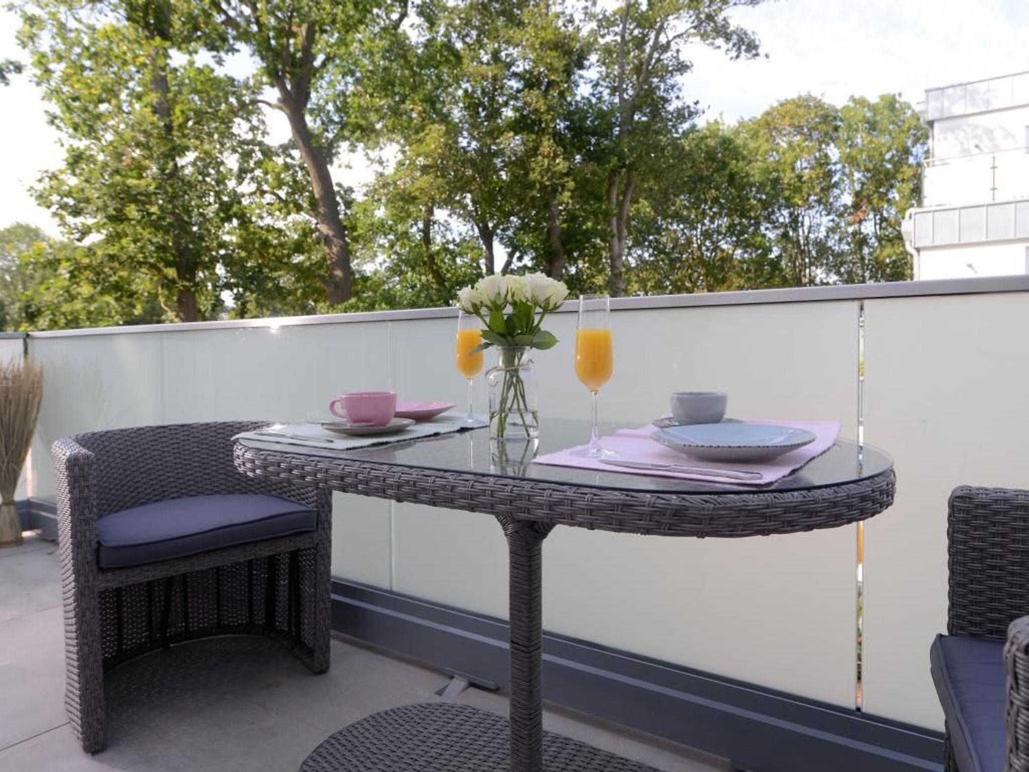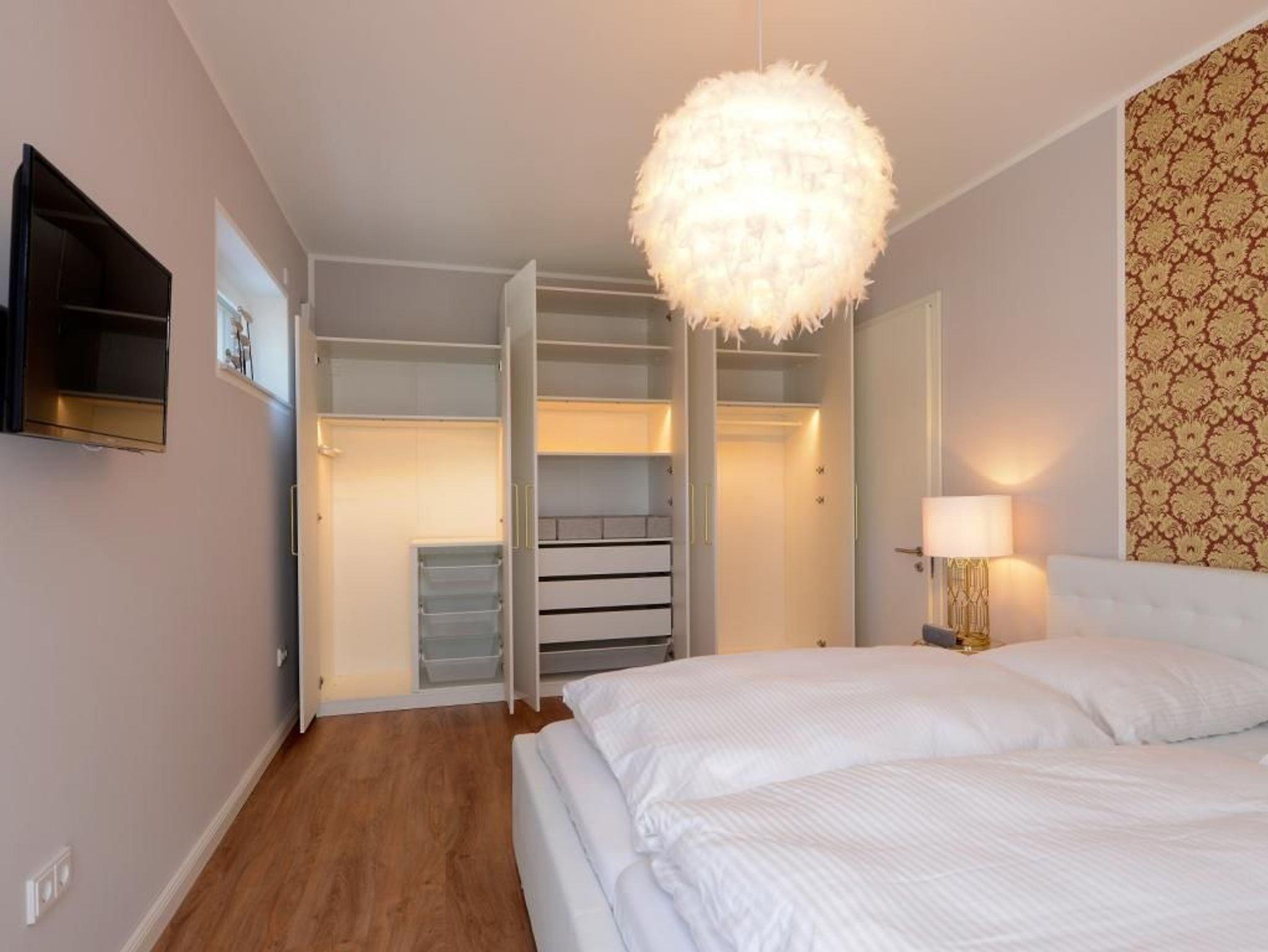 Dieses rollstuhlgerechte, modern eingerichtete 2- Zimmer- Appartement befindet sich im 1. Obergeschoss der Villa. Großzügige 70 m² bieten bis zu 4 Gästen ein bezauberndes Wohnambiente für Ihren Traumurlaub. Sie erreichen das rollstuhlgerechte Appartement bequem über einen Lift. Es empfängt Sie ein lichtdurchfluteter Wohn- und Essbereich. Bodentiefe Fensterfronten lassen die sorgfältig ausgewählte Einrichtung erstrahlen. Hier befindet sich der Zugang zum hübsch möblierten, nordöstlich gelegenen Balkon, welcher durch einen Sichtschutz Ihre Privatsphäre wahrt. Das geschmackvolle Sofa-Ensemble lädt zum Relaxen ein. Mit Blick auf den großen Elektrokamin lassen Sie Ihre Seele baumeln. Das stylische Funktionssofa lässt sich mühelos in ein bequemes Doppelbett verwandeln. Ein Flachbild- TV sowie kostenfreies WLAN sorgen für Unterhaltung. Die integrierte, technisch sehr hochwertig ausgestattete Küchenzeile mit Geschirrspüler, Kühlschrank mit Gefrierfunktion, Backofen, Mikrowelle, Cerankochfeld und vielem mehr lässt keine Wünsche offen. Der große Esstisch für 4 Personen lädt zu geselligen Abenden und einem gemeinsamen Frühstück ein. Für eine erholsame Nachtruhe nach erlebnisreichen Tagen ist ebenfalls gesorgt: das charmant eingerichtete Schlafzimmer mit höhenverstellbarem Doppelbett lässt Sie ins Land der Träume gleiten. Erwachen Sie hier mit Meeresrauschen und erhaschen Sie einen Blick auf das Meer. Der beleuchtete Kleiderschrank mit ausreichend Stauraum sowie ein weiteres TV- Gerät runden die Einrichtung ab. Das moderne Tageslichtbad mit ebenerdiger Wellnessdusche und Duschsitz, unterfahrbarem Waschtisch sowie WC mit Haltegriffen ist rollstuhlgerecht eingerichtet.