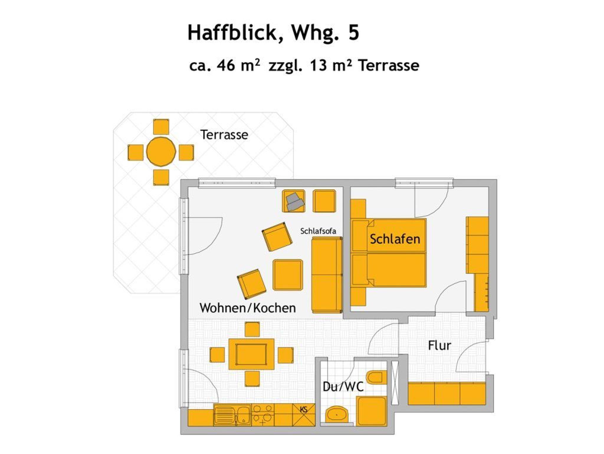 Die Residenz Haffblick ist eine zentral, dennoch ruhig gelegene Appartementanlage bestehend aus vier Häusern mit jeweils 17 Wohneinheiten. In nur 200 Meter befindet sich der Ostseestrand. Das Ortszentrum ist in wenigen Schritten erreicht. Die beliebte Ferienanlage liegt gleichzeitig nah zum Naturschutzgebiet an den Haffwiesen auch nah dem Tarnewitzer Urwald. Ganzjährig bietet der hauseigene Wellnessbereich Sauna sowie Infrarot-Wärmekabinen gegen Gebühr. Ein Fitnessraum steht kostenfrei zur Verfügung. Ebenfalls kostenlos sind WLAN sowie Sky Programme Fußball Bundesliga -Sport- Cinema- Disney. Jeder der Wohneinheiten ist individuell ausgestattet, komfortabel möbliert und verfügt über Terrasse oder Balkon, teilweise zwei Balkone. Zudem gibt es auf dem Grundstück Pavillons mit Blick auf die Pferdewiesen. In jedem der Häuser befinden sich Waschmaschine und Wäschetrockner mit Münzeinwurf. Zugehörig ist ein PKW -Außenstellplatz pro Ferienwohnung. Teilweise sind Haustiere gestattet. Gäste der Residenz Haffblick verbringen einen entspannten Aufenthalt und genießen gleichzeitig die nahe Lage zu vielen Annehmlichkeiten des Ostseebades. Restaurants sowie Cafe´s und Geschäfte sind in Kürze erreicht. Die hier beschriebene 2-Zimmer Erdgeschoss Wohnung Haffblick 5 mit Terrasse, bietet eine Wohnfläche von 54qm und ist für eine Belegung mit maximal 4 Personen ausgerichtet. Die gemütliche Möblierung lädt zum Wohlfühlen ein. Ein separates Schlafzimmer mit Doppelbett, sowie zwei weitere Schlafgelegenheiten im Wohnraum sind vorhanden. Zugehörig ist ein Duschbad. Bitte beachten Sie, dass es sich um eine Wohnung für Nichtraucher handelt. Haustiere sind gegen eine Gebühr in Höhe von 8 Euro/ Tag gestattet