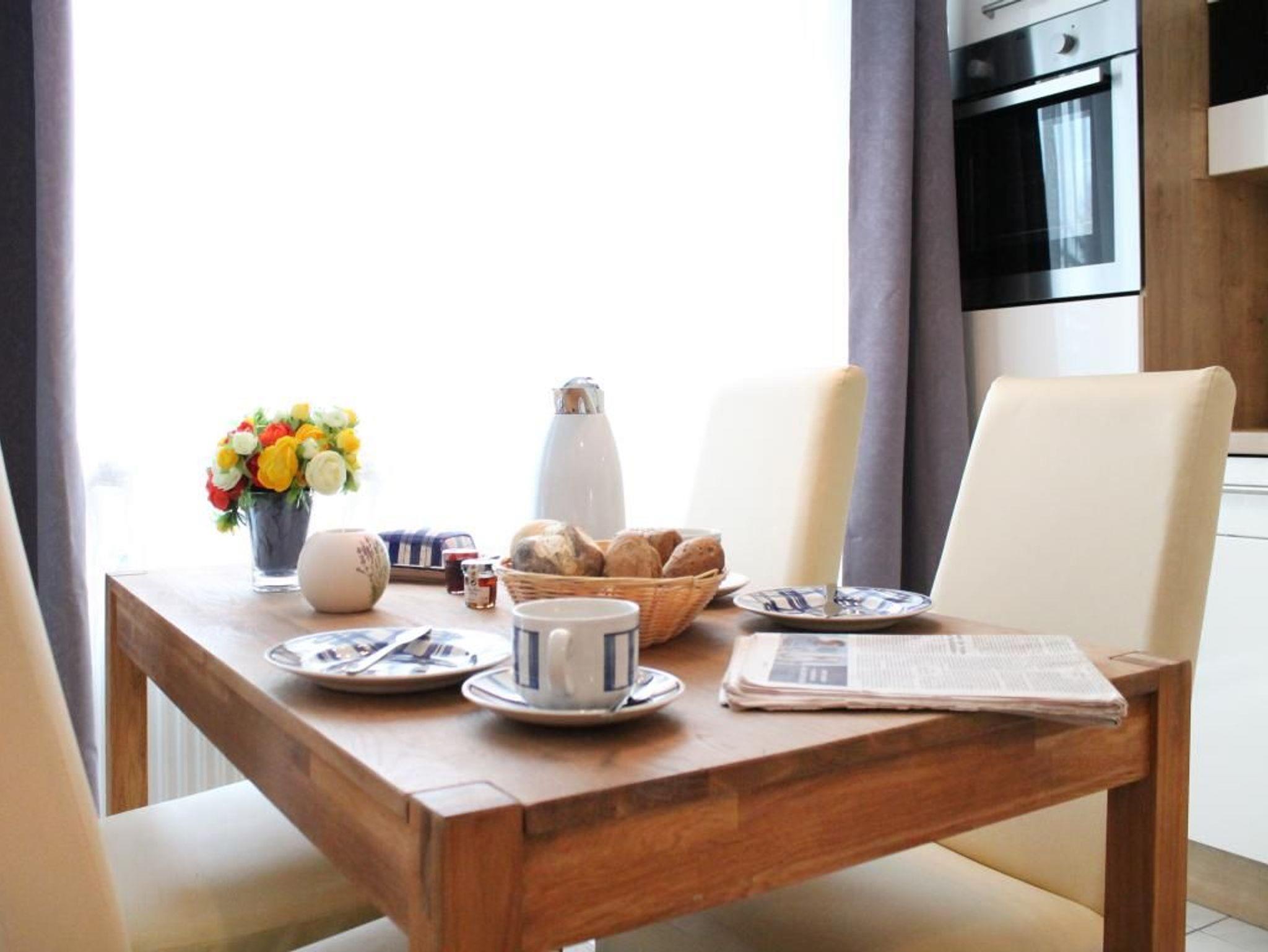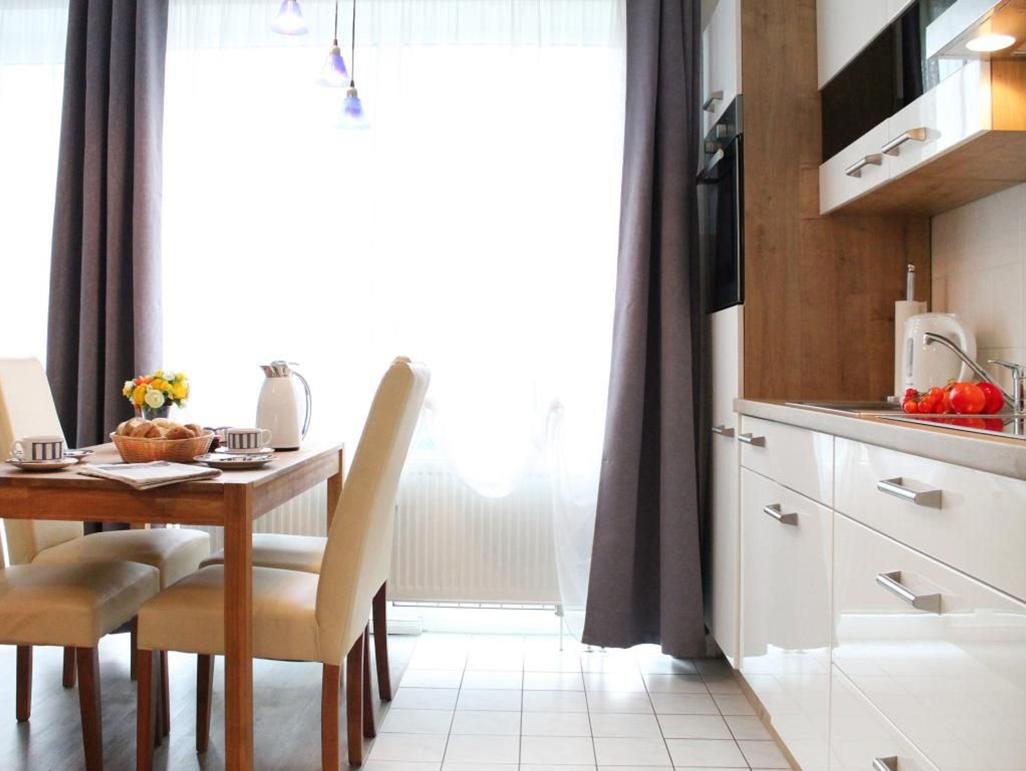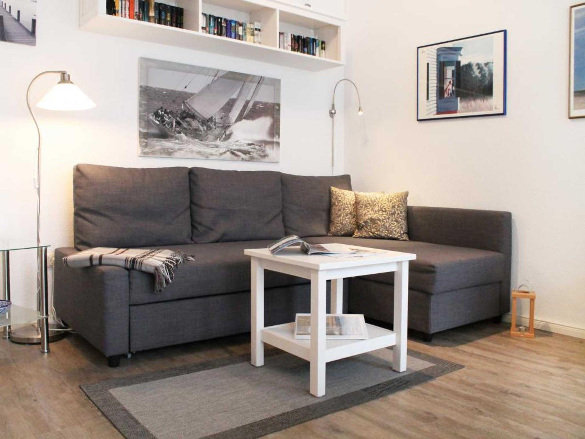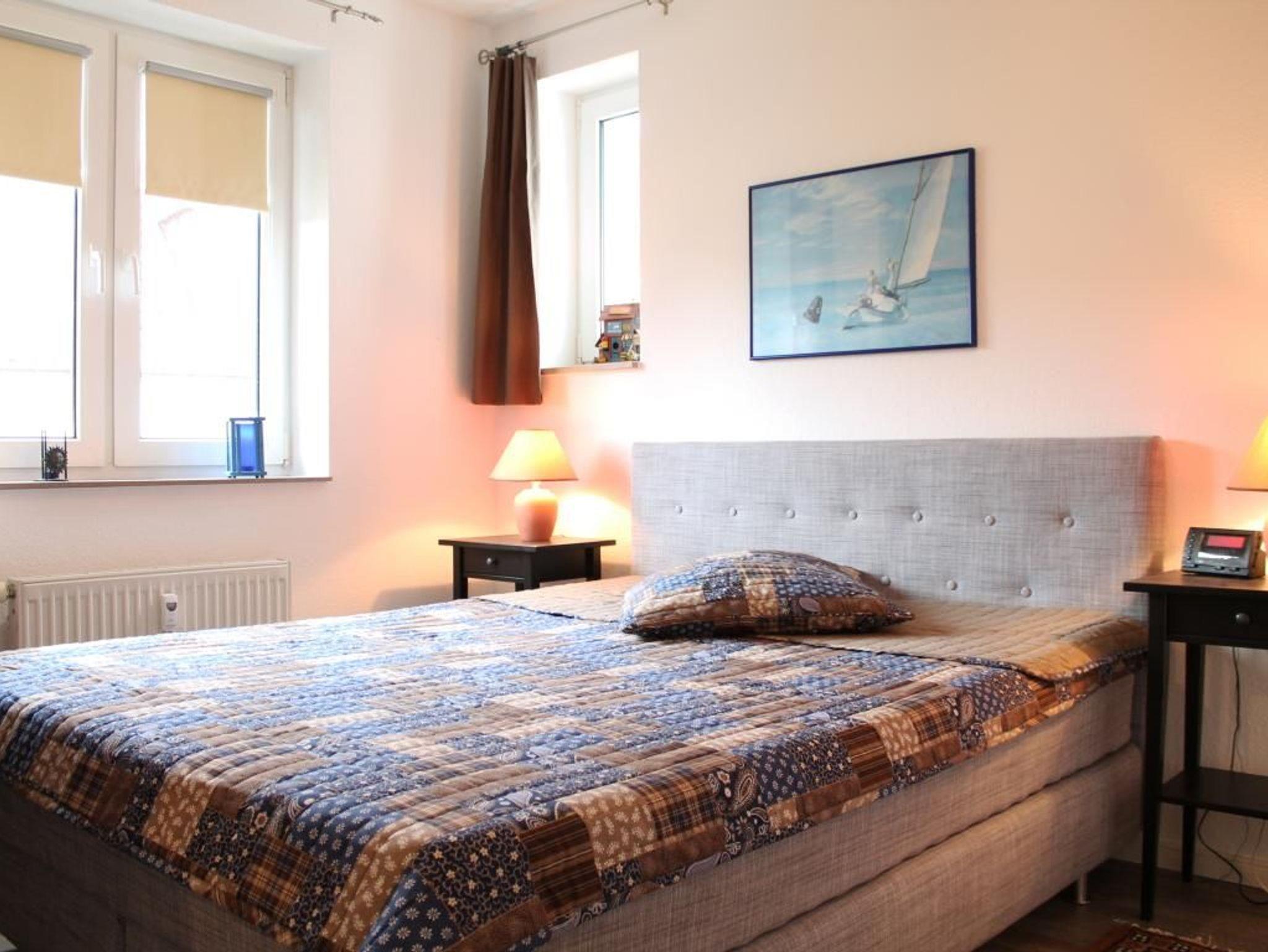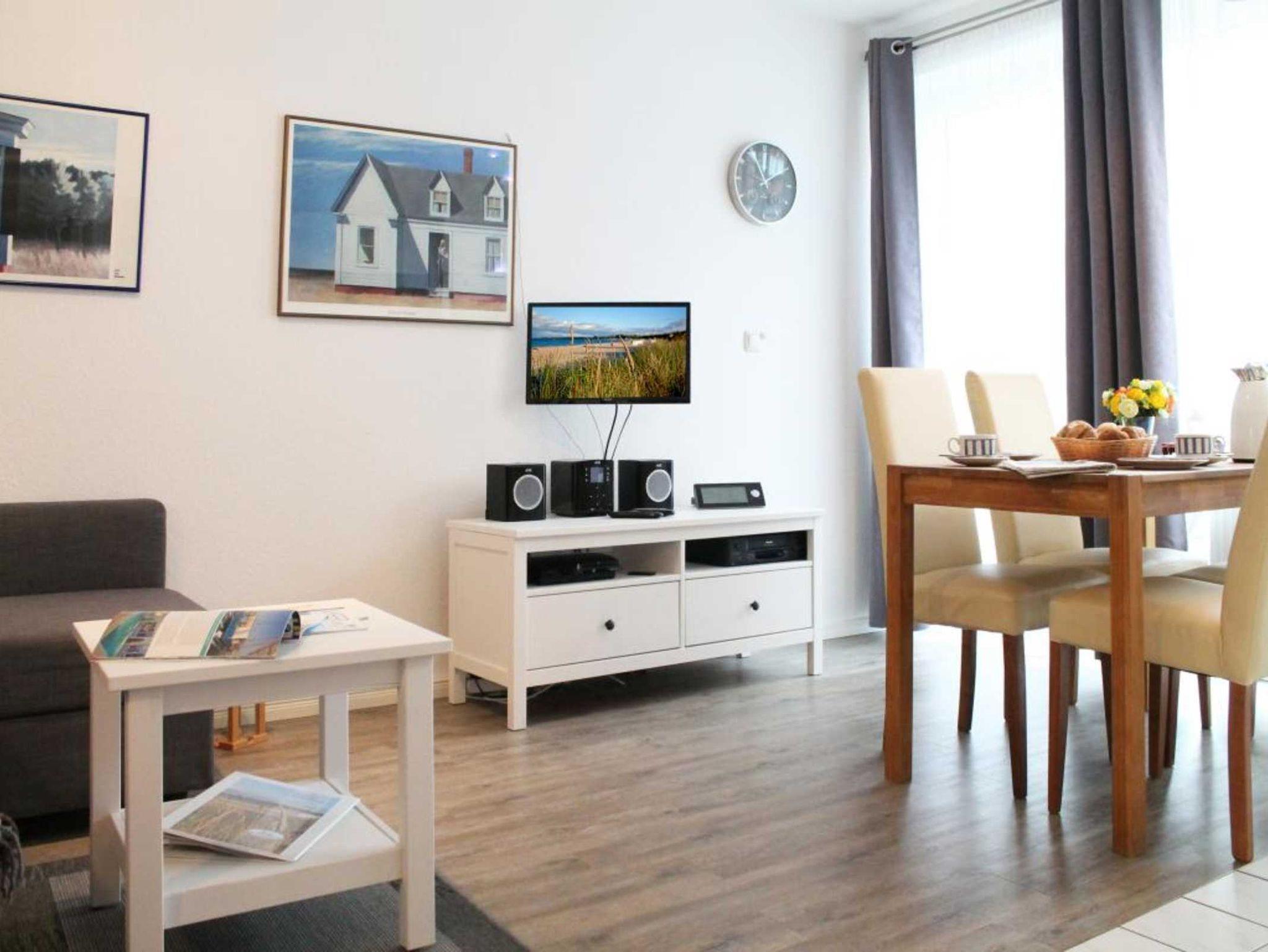 Die modern komfortabel möblierte 2-Zimmerwohnung befindet sich im 1. OG und besitzt eine Wohnfläche von 36qm. Eine Belegung ist mit bis zu 4 Personen möglich. Der geschmackvoll eingerichtete Wohn-Essbereich ist mit einem Sofa, welches sich in ein Schlafsofa mit zwei weiteren Schlafgelegenheiten umwandeln lässt- und mit einem Esstisch ausgestattet. Ebenso sind Fernseher, Musikanlage und gebührenfreies WLAN vorhanden. In der offenen Wohnküche können Sie Ihre Urlaubsmahlzeiten zubereiten mit: Herd, Backofen, Dunstabzug, Kühlschrank mit integriertem Gefrierfach, Spülmaschine usw. Ihre Mahlzeiten nehmen Sie am Esstisch zu sich, oder Sie machen es sich auf dem saisonal möblierten West- Balkon gemütlich. Das Appartement verfügt über ein separates Schlafzimmer mit Doppelbett 1,60m x 2,00m, Kleiderschrank. Das innenliegende Badezimmer besitzt eine Dusche, Waschtisch, Fön und WC. Im Haus können Waschmaschine sowie Wäschetrockner geben Gebühr gemeinschaftlich genutzt werden. Für Ihren PKW steht ein Außen - Stellplatz zur Verfügung. Haustiere sind nicht gestattet. Nichtraucher.