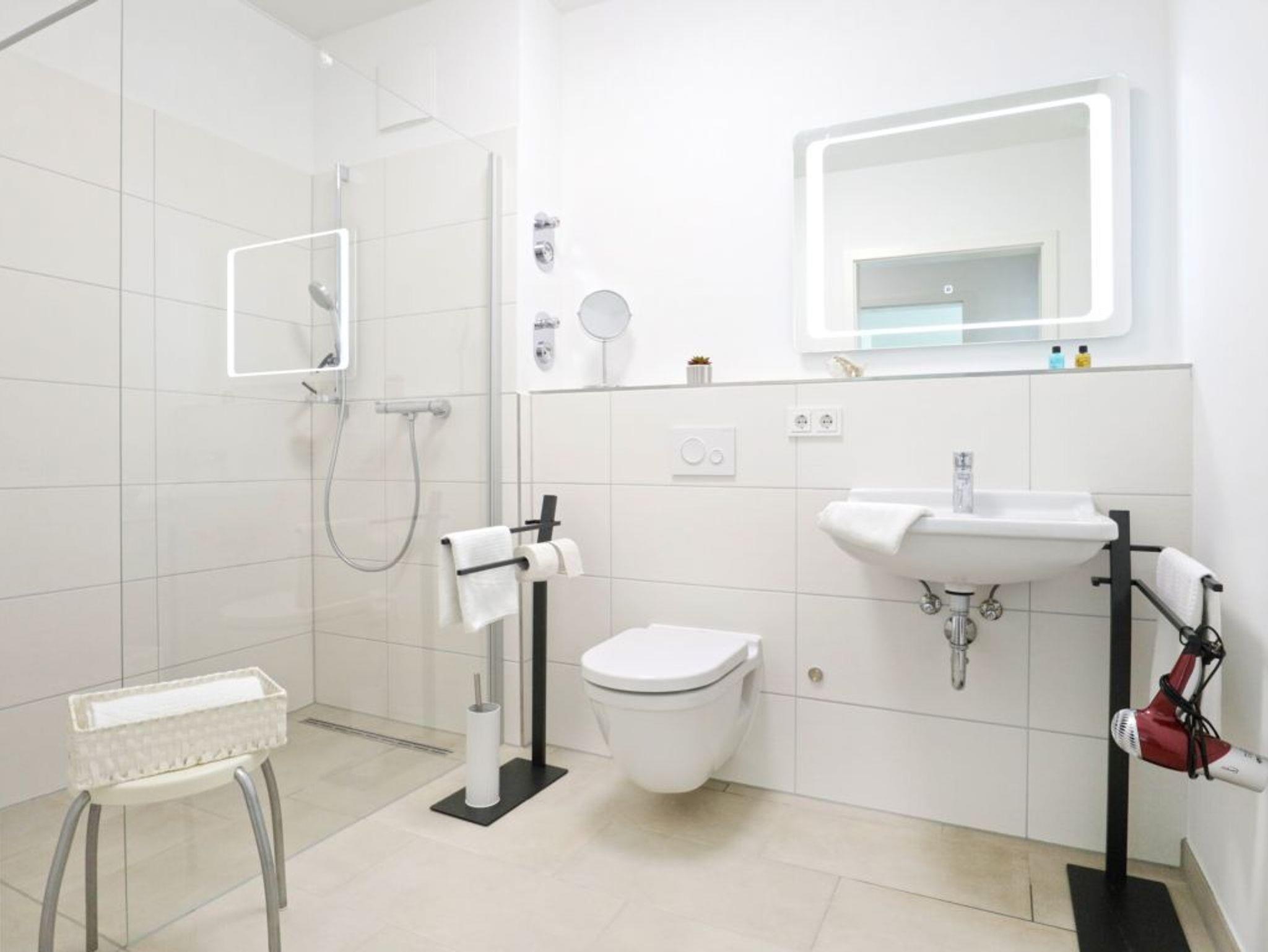 Die Ferienwohnung -Weiße Villen 13- ist eine gehoben möblierte 2 Zimmerwohnung, die sich auch für einen barrierefreien Urlaub anbietet. Von der saisonal möblierten Terrasse schauen Sie teilweise auf die herrlichen Salzwiesen. Eine Belegung der Ferienwohnung ist mit bis zu 3 Personen möglich. Es empfängt Sie ein heller Wohn-/Essbereich, der mit bodentiefen Fenstern angenehmes Tageslicht in die Räume strahlen lässt. Der Designboden in Holzdielenoptik wirkt edel und lädt zum Wohlfühlen ein. Die im Wohnbereich stehende Couch kann leicht zu einem Schlafsofa (Liegefläche 175 x 120 cm). Ein Flachbild - TV sowie kostenfreier Internetzugang über Glasfaseranschluss sind ebenso vorhanden. Für Gäste, die sich eigenständig mit Mahlzeiten versorgen möchten, bietet die integrierte Wohnküche beste Bedingungen. Die vollständige Ausstattung umfasst einen Herd, Backofen, Mikrowelle, Geschirrspüler, Kühlschrank mit integriertem Gefrierfach, Kaffeemaschine, Wasserkocher usw. An einem großen Esstisch können Sie bequem Ihre Mahlzeiten zu sich nehmen, oder Sie speisen während der wärmeren Jahreszeit auf der schönen Terrasse und blicken auf die Wiesen. Ein geräumiges Schlafzimmer mit Boxspringbett, Kleiderschrank, Kommode und einem weiteren Fernsehgerät lädt zu entspannten Nächten ein. Für kleine Kinder stehen ein Kinderreisebett sowie ein Kinderhochstuhl bereit. Ihren Urlaubstag starten Sie in einem modernen Badezimmer mit ebenerdiger Dusche, Waschtisch, WC und einem Badezimmerhocker.
