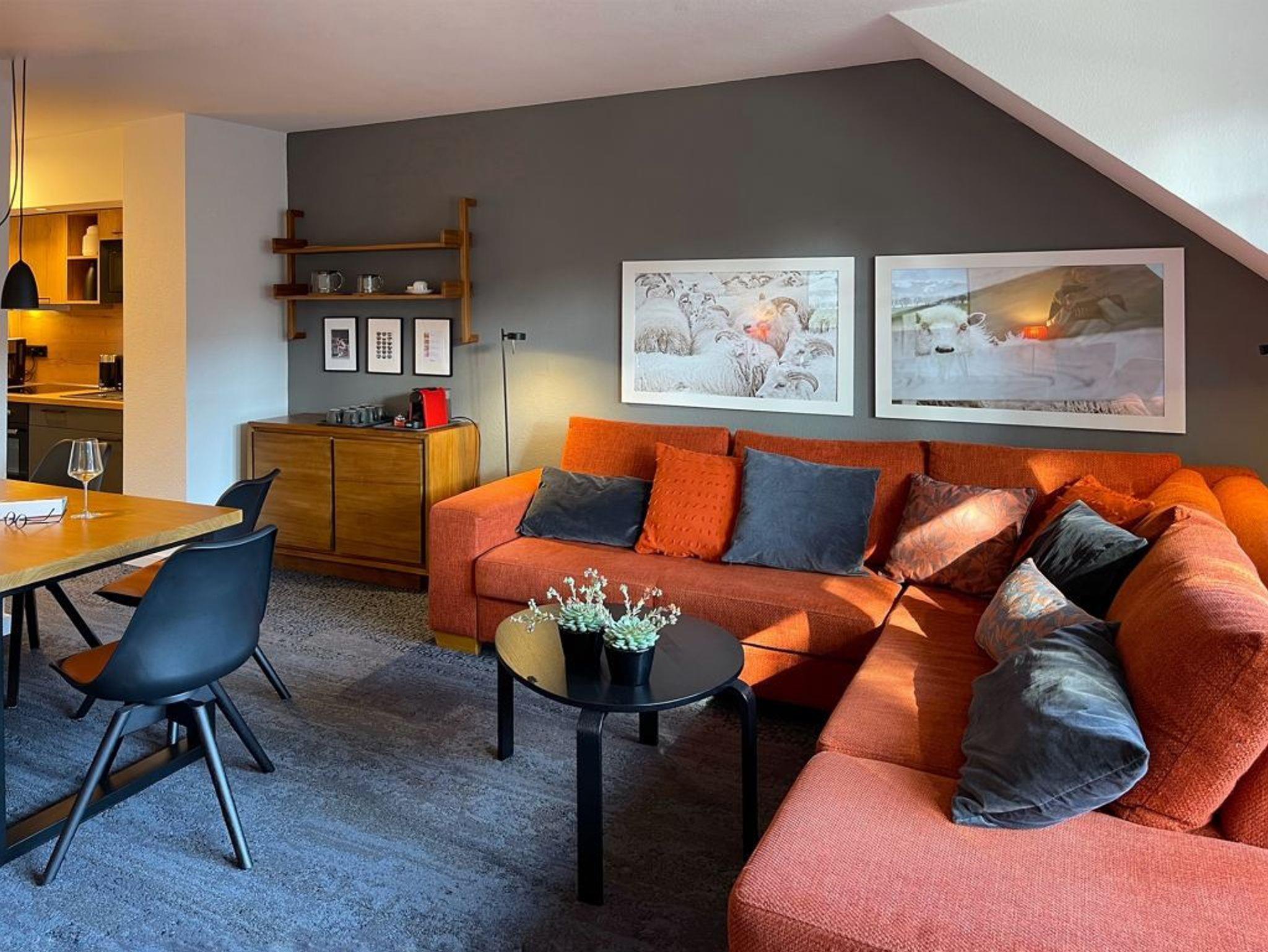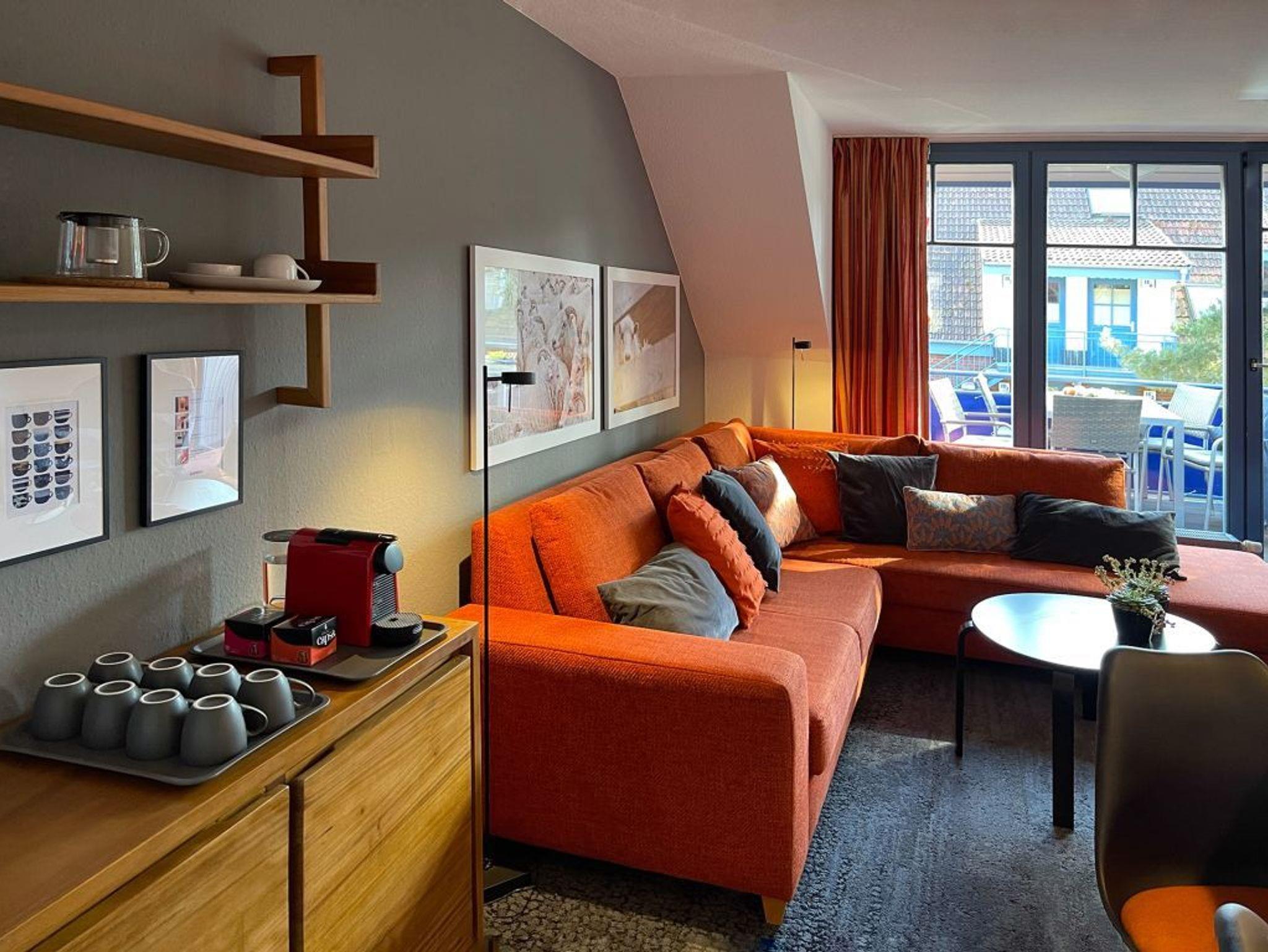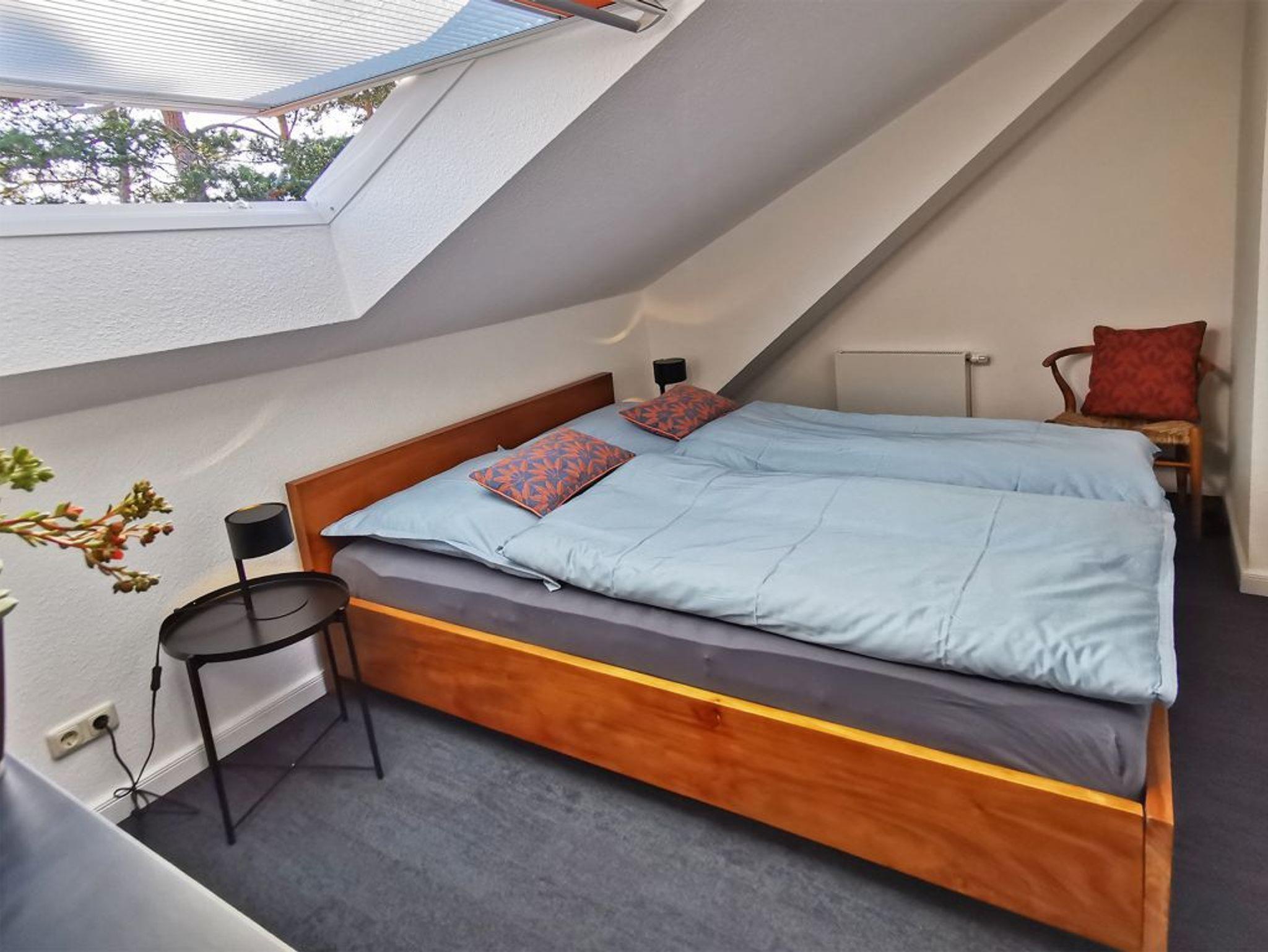 Die 4- Zimmer Maisonetten Ferienwohnung Papillon 12-6 ist ein komfortabel eingerichtetes Appartement mit einer Wohnfläche von 65qm. Eine bequeme Belegung ist mit bis zu 6 Personen möglich. Der großzügige Wohn-/Essbereich ist mit einem Sofa, ausziehbar als Schlafsofa sowie weiteren Sitzmöglichkeiten und einem großen Esstisch möbliert. Ein Fernsehgerät, DVD-Player, Musikanlage und kostenfreie WLAN- Nutzung bieten Abwechslung. Vom Wohnbereich gelangt man auf den saisonal möblierten Süd-Balkon. In der Wohnküche stehen Ceranherd, Backofen, Mikrowelle, Geschirrspüler sowie Kühlschrank mit integr. Gefrierfach, Nespresso-Maschine, Toaster und Wasserkocher bereit. Ihre Mahlzeiten können Sie am Esstisch zu sich nehmen. Zudem befindet sich auf dieser Wohnebene ein separates Schlafzimmer mit zwei Einzelbetten, und Kleiderschrank. Das Duschbad ist mit zwei Waschtischen und WC ausgestattet. Über eine Treppe im Wohnbereich gelangen Sie in die obere Ebene mit zwei weiteren Schlafzimmern, welche jeweils mit einem Doppelbett, Kleiderschrank möbliert sind. Die Wohnung ? mit Ausnahme des Bades- ist mit Teppichbelag ausgelegt. Gegen Gebühr können Sie im Untergeschoß des Hauses Waschmaschine und Wäschetrockner nutzen. Ein Kinderhochstuhl, Kinderbett befindet sich in der Wohnung. Ihren PKW parken Sie kostenfrei auf dem wohnungseigenen Außenstellplatz. Bitte beachten Sie, dass es sich um eine Nichtraucherwohnung handelt. Keine Haustiere. Zur Ostsee gelangen Sie in nur ca. 250 Meter.