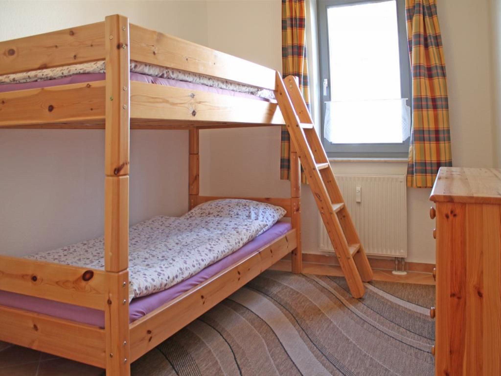 Zum Appartement gehören zwei separate Schlafzimmer. Eines mit Doppelbett und Kleiderschrank. Das weitere Schlafzimmer mit einem Etagenbett.