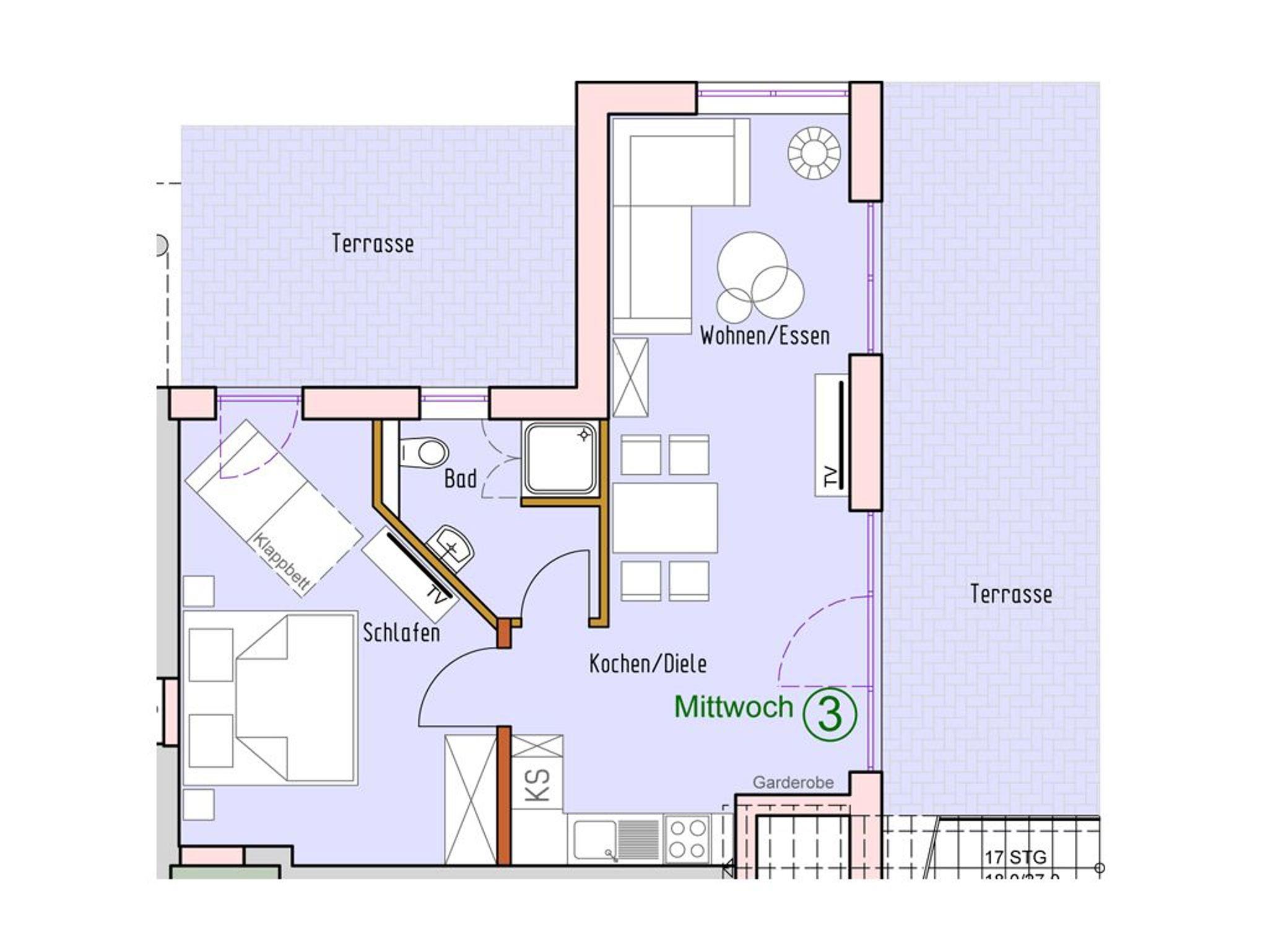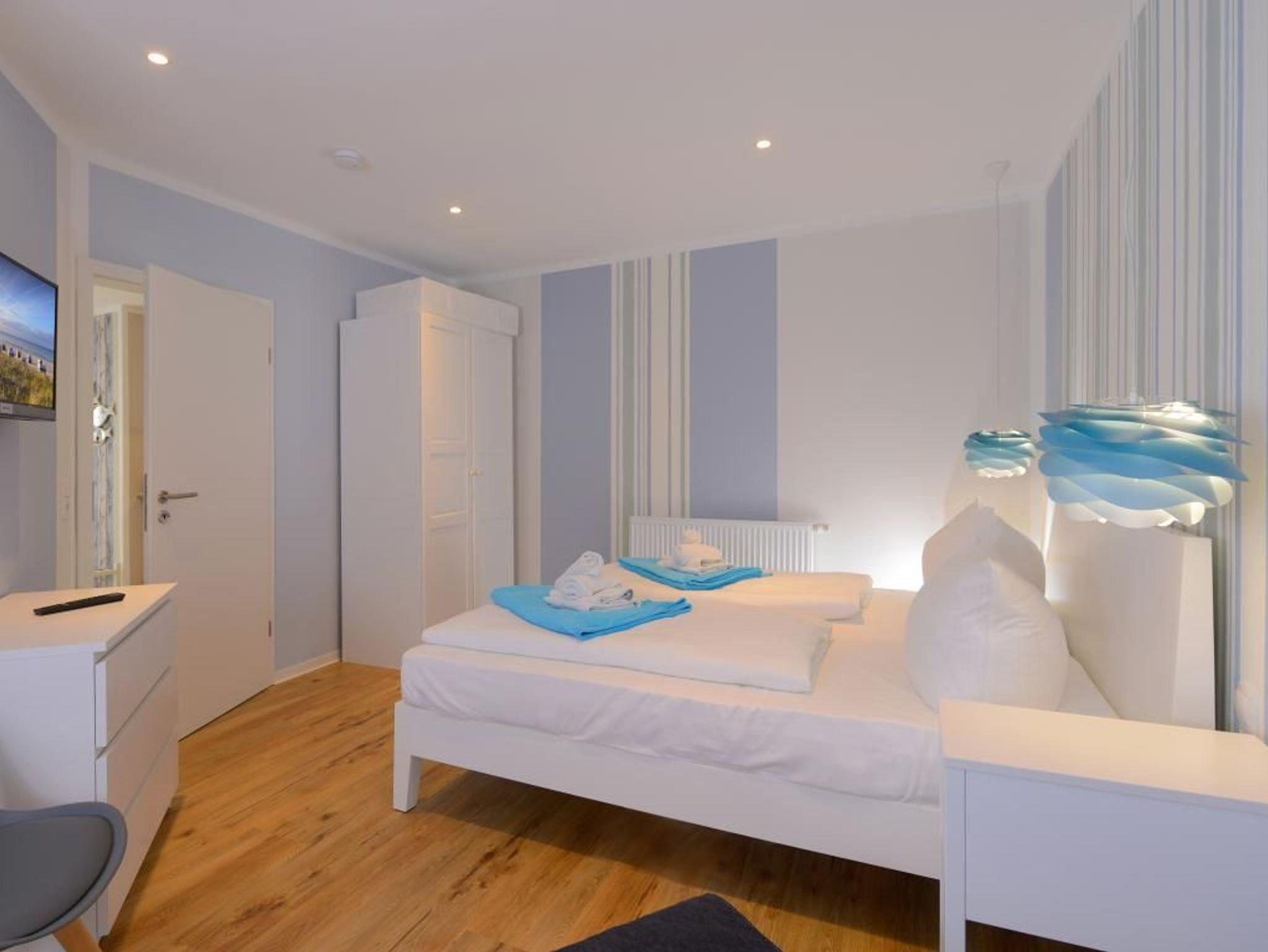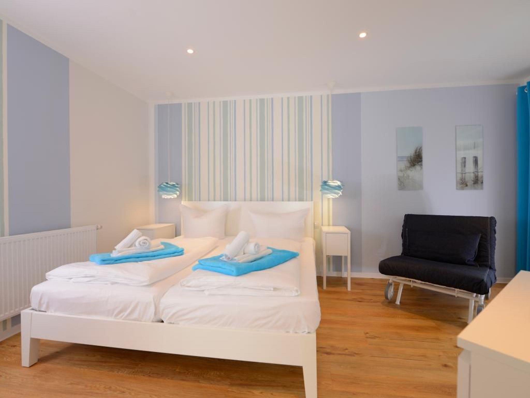 Hervorzuheben ist die bestens ausgestattete Wohnküchenzeile, die eine unabhängige Eigenversorgung ermöglicht mit: Herd, Backofen, Dunstabzug, Mikrowelle, Kühlschrank mit integr. Gefrierfach, Geschirrspüler, Kaffeemaschine, Wasserkocher, usw. Während der wärmeren Jahreszeit nutzen Sie die Vorzüge der wohnungseigenen, saisonal möblierten Terrassen. Ein separates Wohlfühlschlafzimmer mit Doppelbett, Kleiderschrank, Fernseher lädt zu geruhsamen Nächten ein. Für eine evtl. mitreisende 3. Person befindet sich eine weitere Schlafmöglichkeit im Schlafzimmer. Bei Anreise sind bezogene Betten für 2 Personen inklusive.