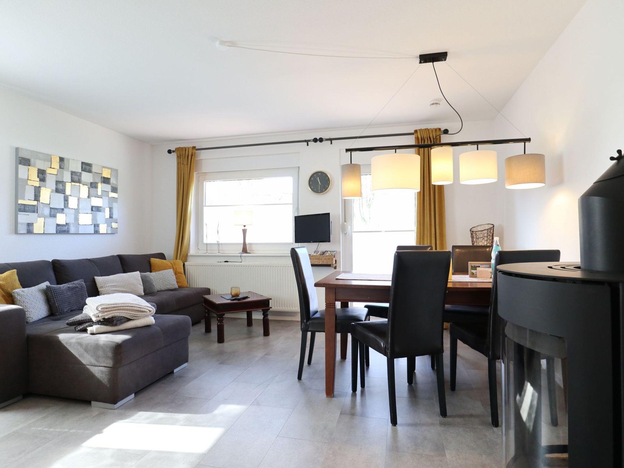 Das Ferien Reihenhaus -Urlauberdorf 23a - mit West-Terrasse bietet auf 60qm familienfreundliches Wohnen zum Wohlfühlen. Der gemütliche Wohn- und Essbereich ist mit einem ausziehbaren Sofa, Kaminofen, Fernseher, DVD-Player, Musikanlage, WLAN und Esstisch ausgestattet ? ideal für entspannte Stunden mit der Familie. Zwei separate Schlafzimmer sowie ein Duschbad und ein Gäste-WC sorgen für Komfort und Privatsphäre.