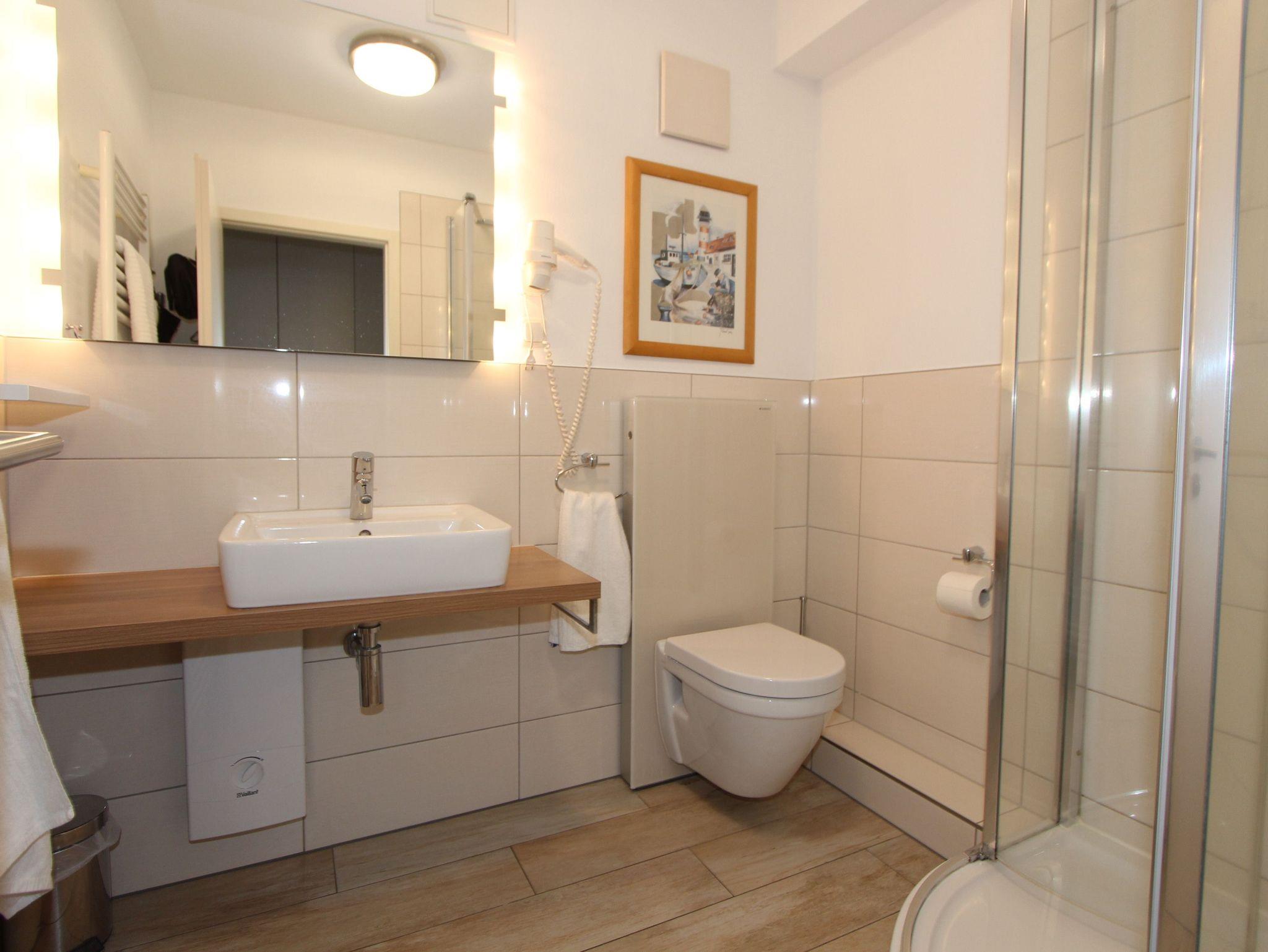 Das Badezimmer ist modern ausgestattet und verfügt über Föhn, Badheizkörper und großzügige Ablageflächen.