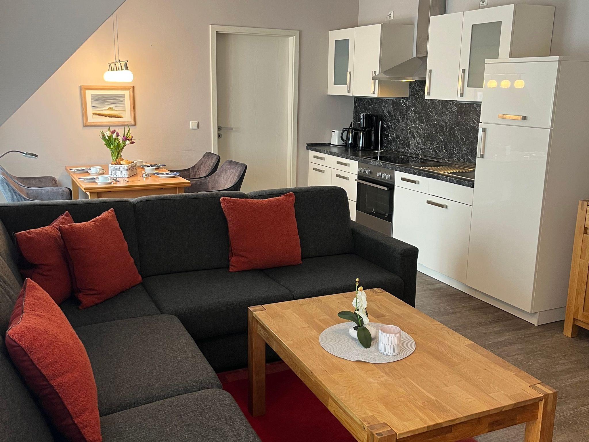 Die gemütliche Essecke lädt dazu ein, Ihre Mahlzeiten in angenehmer Atmosphäre zu genießen. Die modern eingerichtete Küche bietet alles, was Sie benötigen: Ceran-Kochfeld, Backofen, Mikrowelle, großen Kühlschrank mit Gefrierfach und selbstverständlich einen Geschirrspüler.