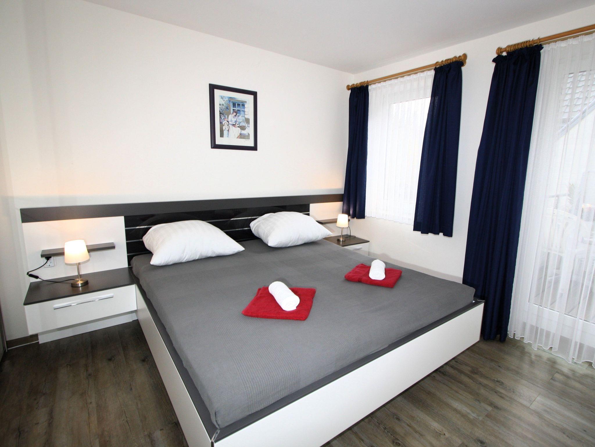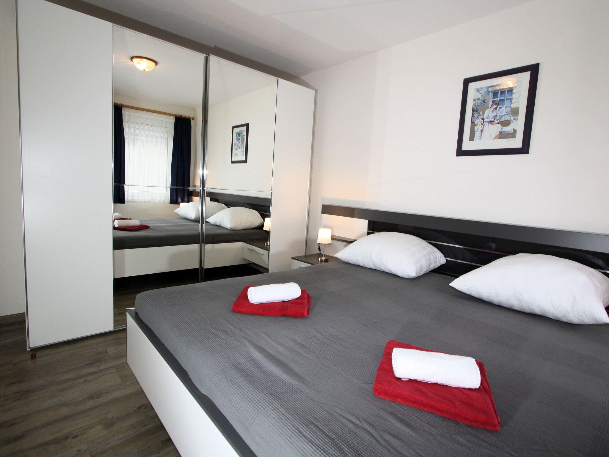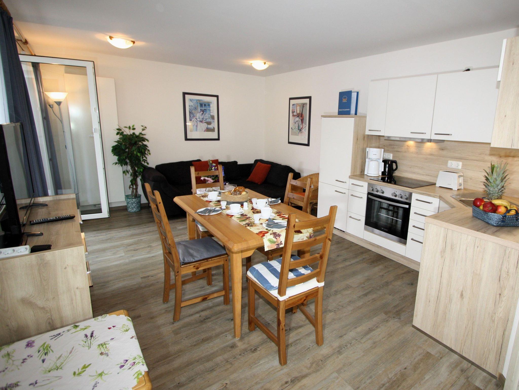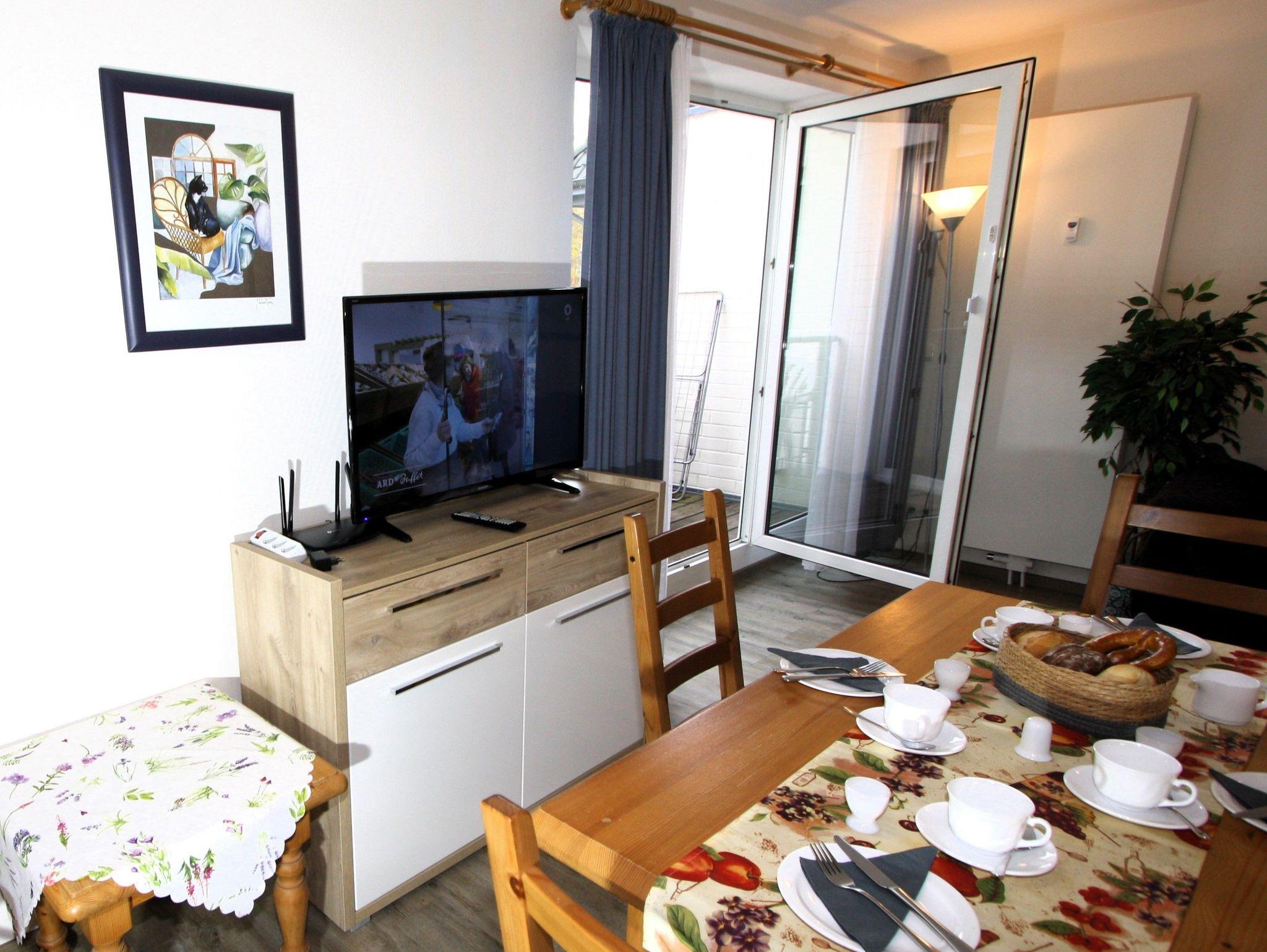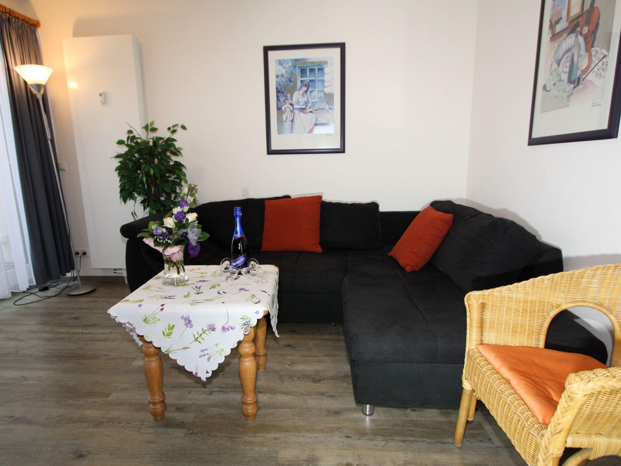 Sie wohnen in einem 2-Zimmer-Appartement für bis zu 4 Personen auf 44 m² Wohnfläche im 1. OG. Ein Schlafzimmer mit Doppelbett, Wohn-/Schlafraum mit bequemer Doppelbettcouch, separater Essplatz, voll ausgestatteter Küchenbereich, Dusche/WC, Balkon, SAT-TV und Telefon.