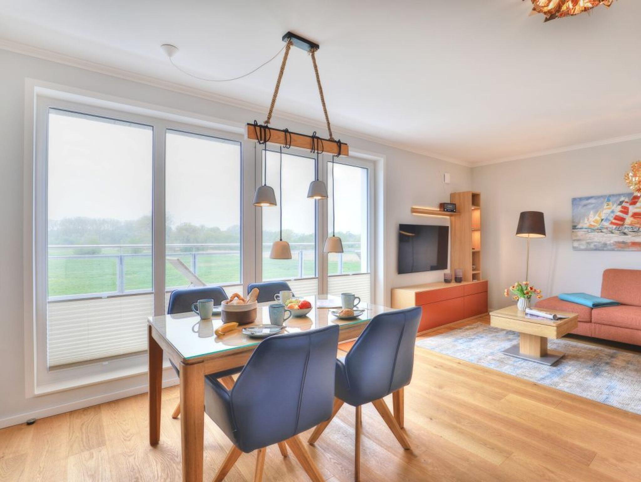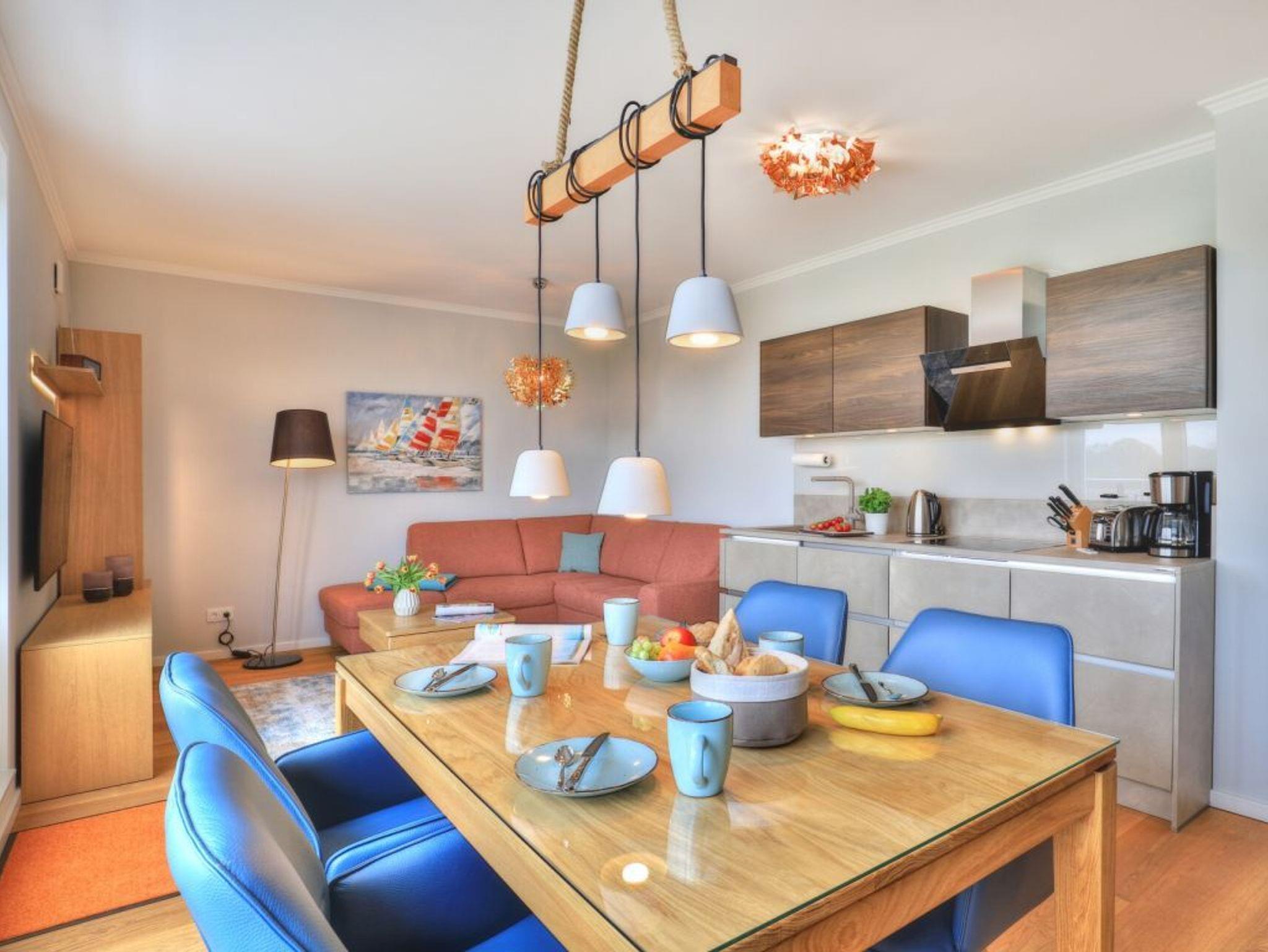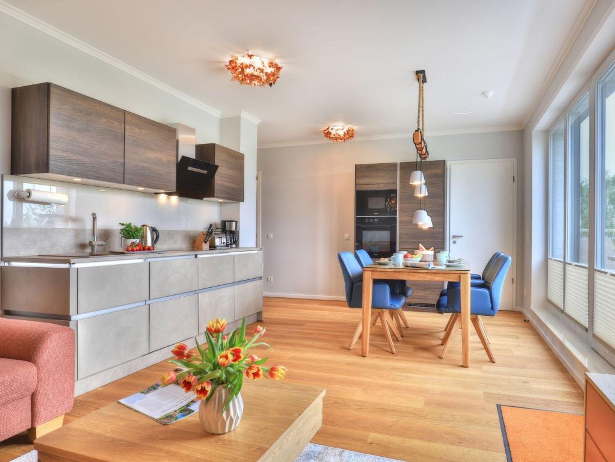 Ein Highlight der Ferienwohnung ist die wohnungseigene Infrarotsauna. Der lichtdurchflutete Wohnbereich ist modern möbliert und bietet ein Design Sofa, Flatscreen TV, Internetradio, Esstisch mit 4 Sitzplätzen sowie den Zugang auf eine der Dachterrassen. Das schnelle Internet nutzen Sie über Glasfaseranschluss. Die in den Wohnraum integrierte Komfort Einbauküche ist vollständig ausgestattet und verfügt über technische Geräte namhafter Hersteller. Ihre zubereiteten Mahlzeiten können Sie an einem Echtholz Esstisch, oder im Sommer auch auf der saisonal möblierten Dachterrasse mit Sicht über die Wiesen zu sich nehmen. Saisonal bedingt stehen hier Relax - Liegen zum Entspannen bereit. Eines der Schlafzimmer ist mit zwei Einzelbetten, Kleiderschrank und einem weiteren Fernseher eingerichtet und verwöhnt zudem mit direktem Zugang auf die zweite Dachterrasse. Das zweite Schlafzimmer ist mit einem Boxspring Doppelbett und einem großzügigen Kleiderschrank möbliert. Insbesondere hervorzuheben ist das luxuriöse Bad mit Regenwalddusche und Infrarotkabine. Wir möchten vorsorglich darauf hinweisen, dass in der Nichtraucherwohnung keine Haustiere