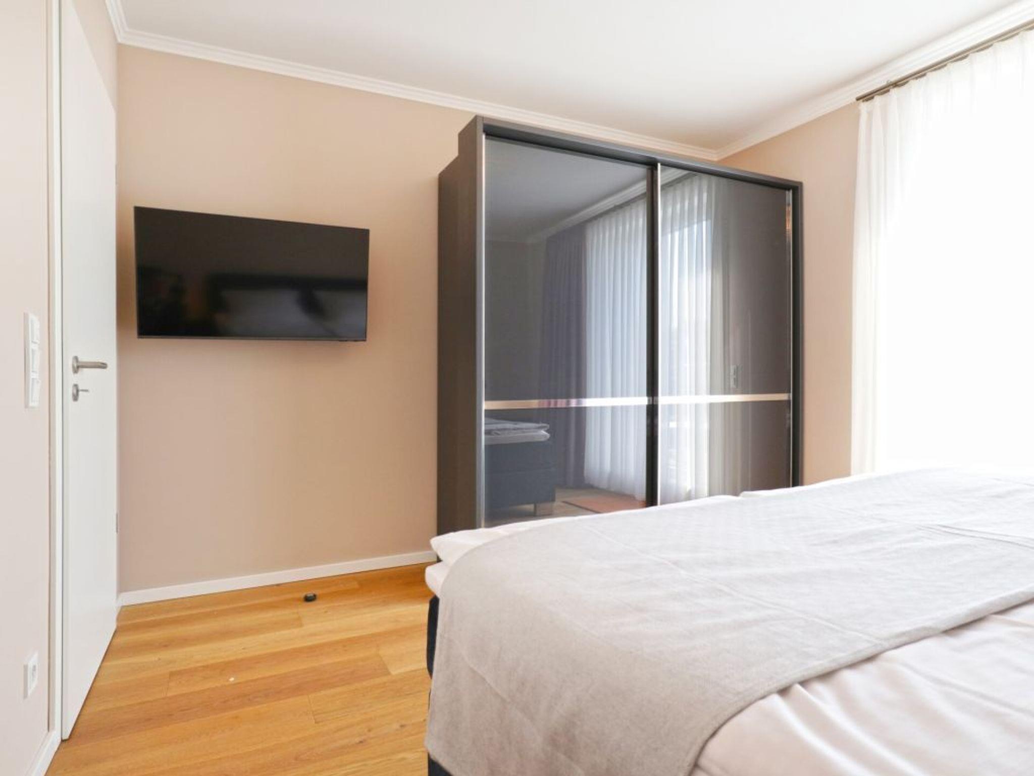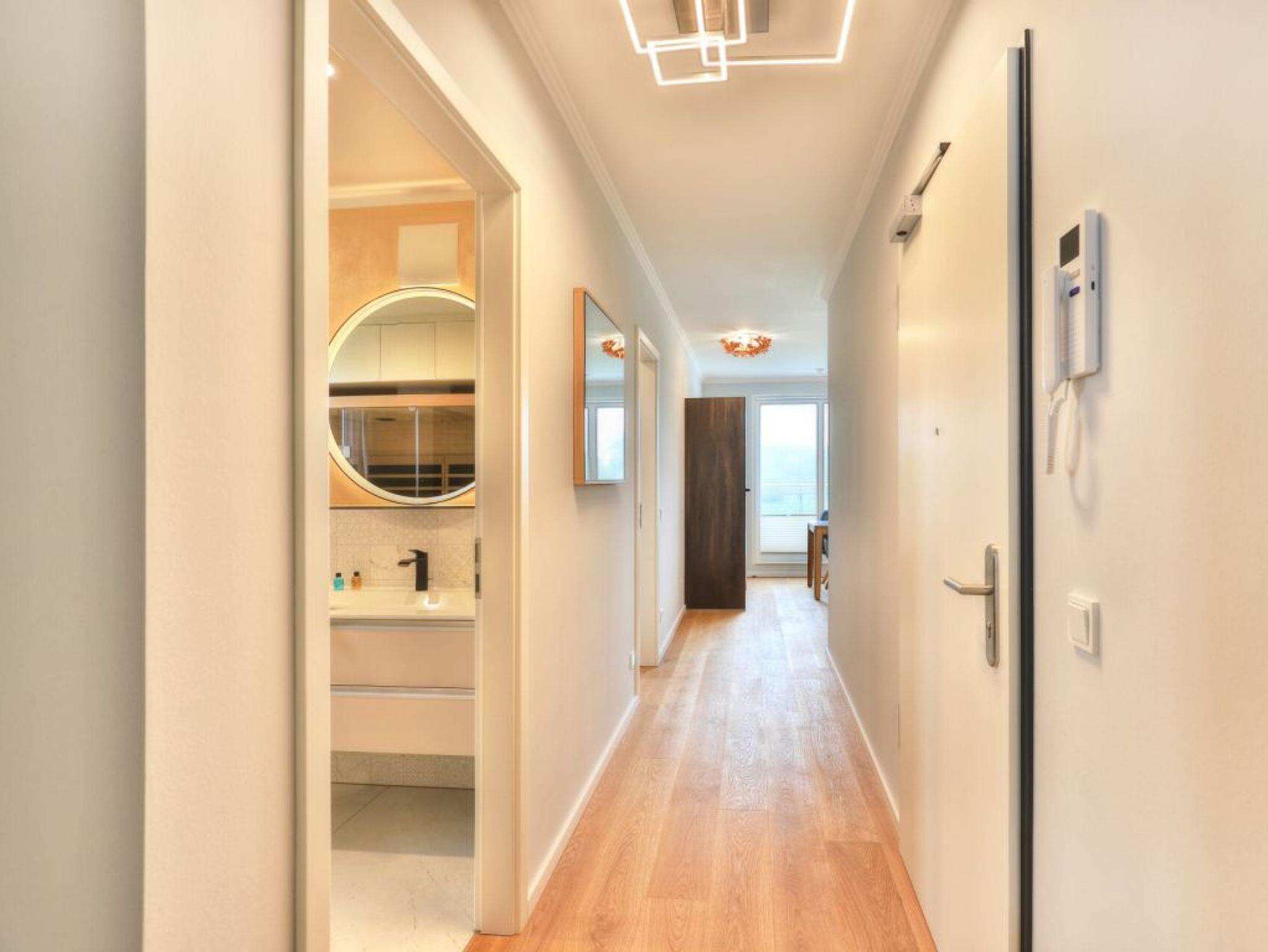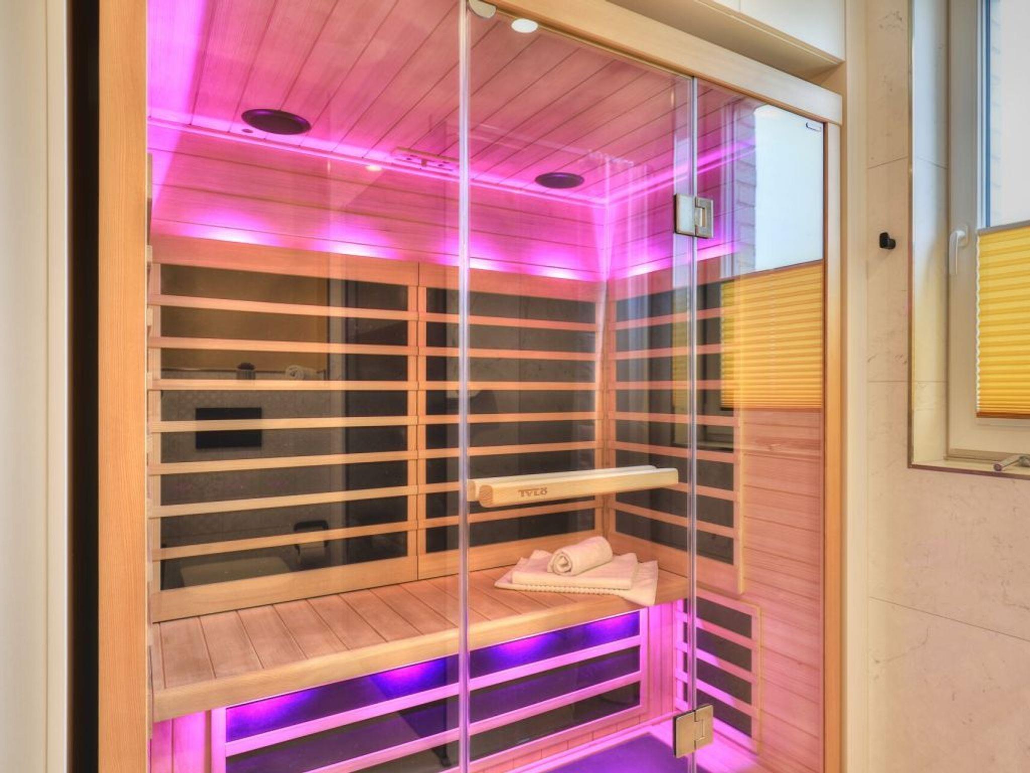 Ein Highlight der Ferienwohnung ist die wohnungseigene Infrarotsauna. Der lichtdurchflutete Wohnbereich ist modern möbliert und bietet ein Design Sofa, Flatscreen TV, Internetradio, Esstisch mit 4 Sitzplätzen sowie den Zugang auf eine der Dachterrassen. Das schnelle Internet nutzen Sie über Glasfaseranschluss. Die in den Wohnraum integrierte Komfort Einbauküche ist vollständig ausgestattet und verfügt über technische Geräte namhafter Hersteller. Ihre zubereiteten Mahlzeiten können Sie an einem Echtholz Esstisch, oder im Sommer auch auf der saisonal möblierten Dachterrasse mit Sicht über die Wiesen zu sich nehmen. Saisonal bedingt stehen hier Relax - Liegen zum Entspannen bereit. Eines der Schlafzimmer ist mit zwei Einzelbetten, Kleiderschrank und einem weiteren Fernseher eingerichtet und verwöhnt zudem mit direktem Zugang auf die zweite Dachterrasse. Das zweite Schlafzimmer ist mit einem Boxspring Doppelbett und einem großzügigen Kleiderschrank möbliert. Insbesondere hervorzuheben ist das luxuriöse Bad mit Regenwalddusche und Infrarotkabine. Wir möchten vorsorglich darauf hinweisen, dass in der Nichtraucherwohnung keine Haustiere