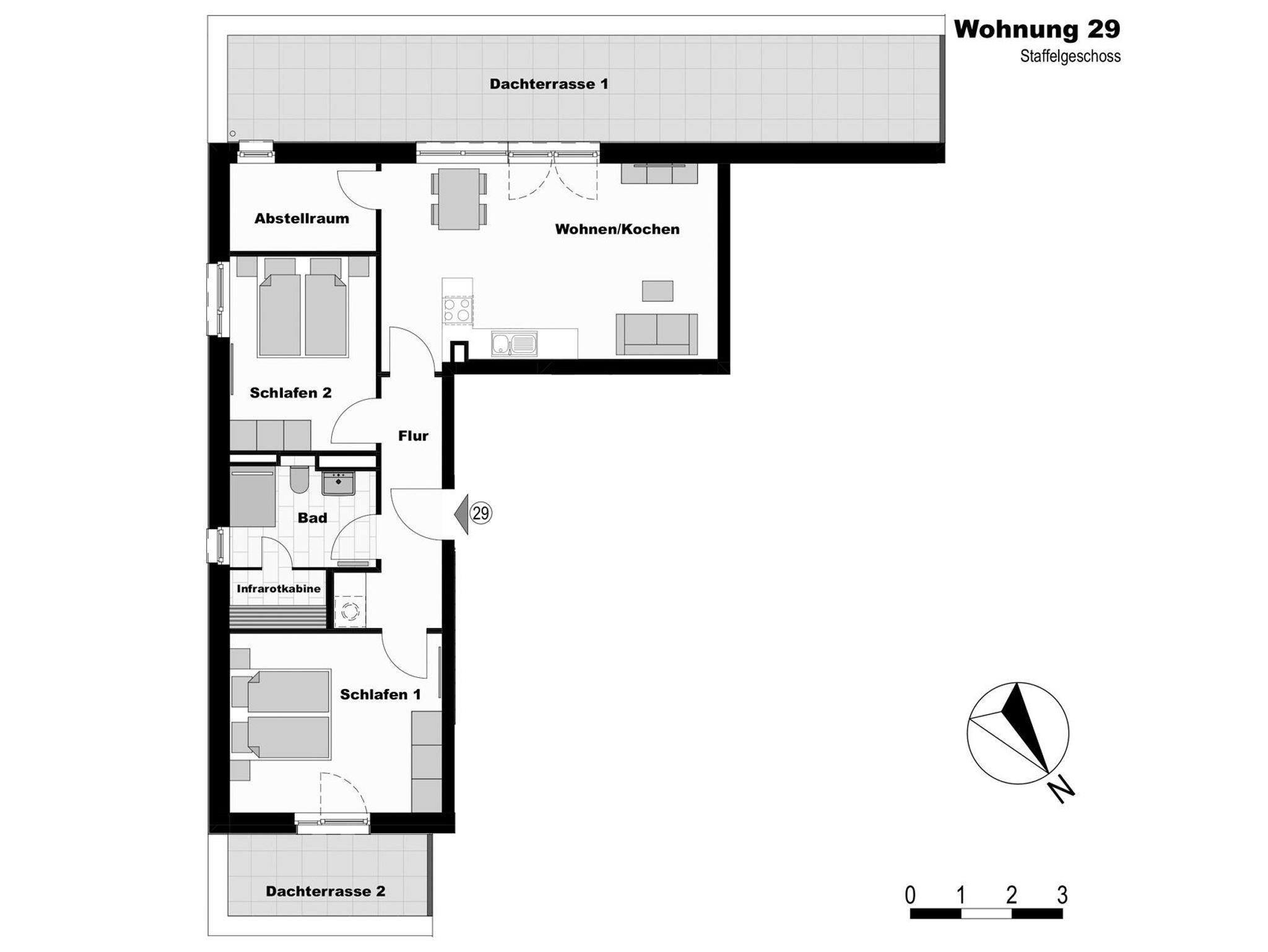 Das 3- Zimmer Penthouse -Weisse Villen 29- besitzt eine Wohnfläche von 90qm und verwöhnt mit zwei Dachterrassen. Eine Belegung dieser Traumwohnung ist mit insgesamt 4 Personen möglich.