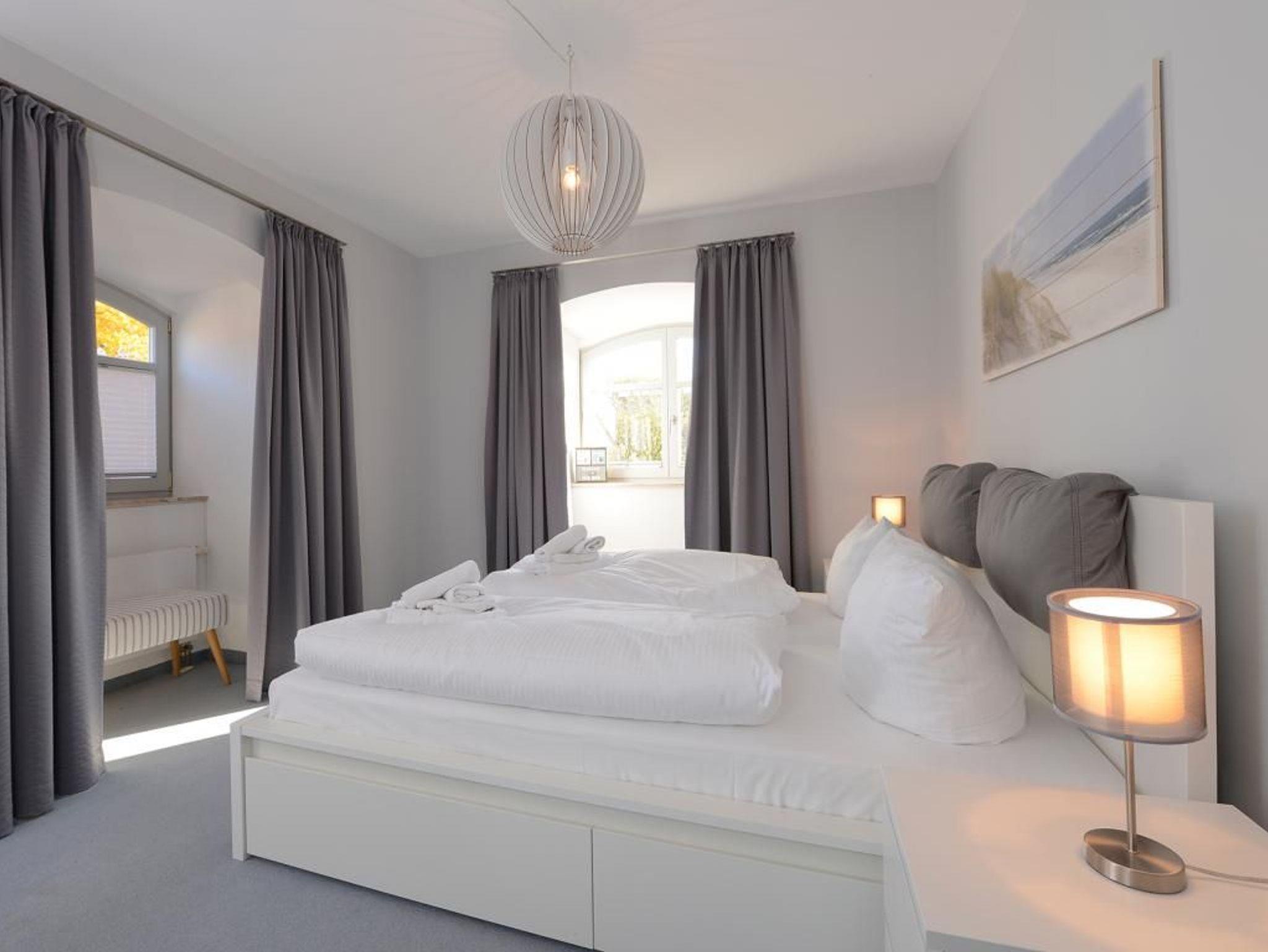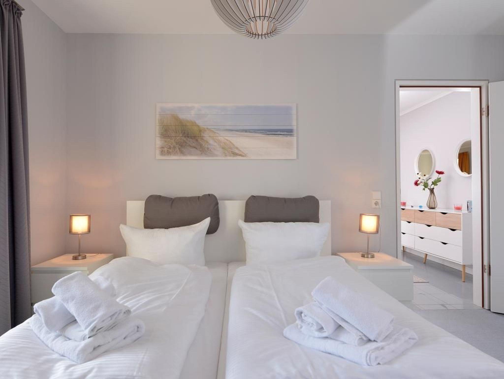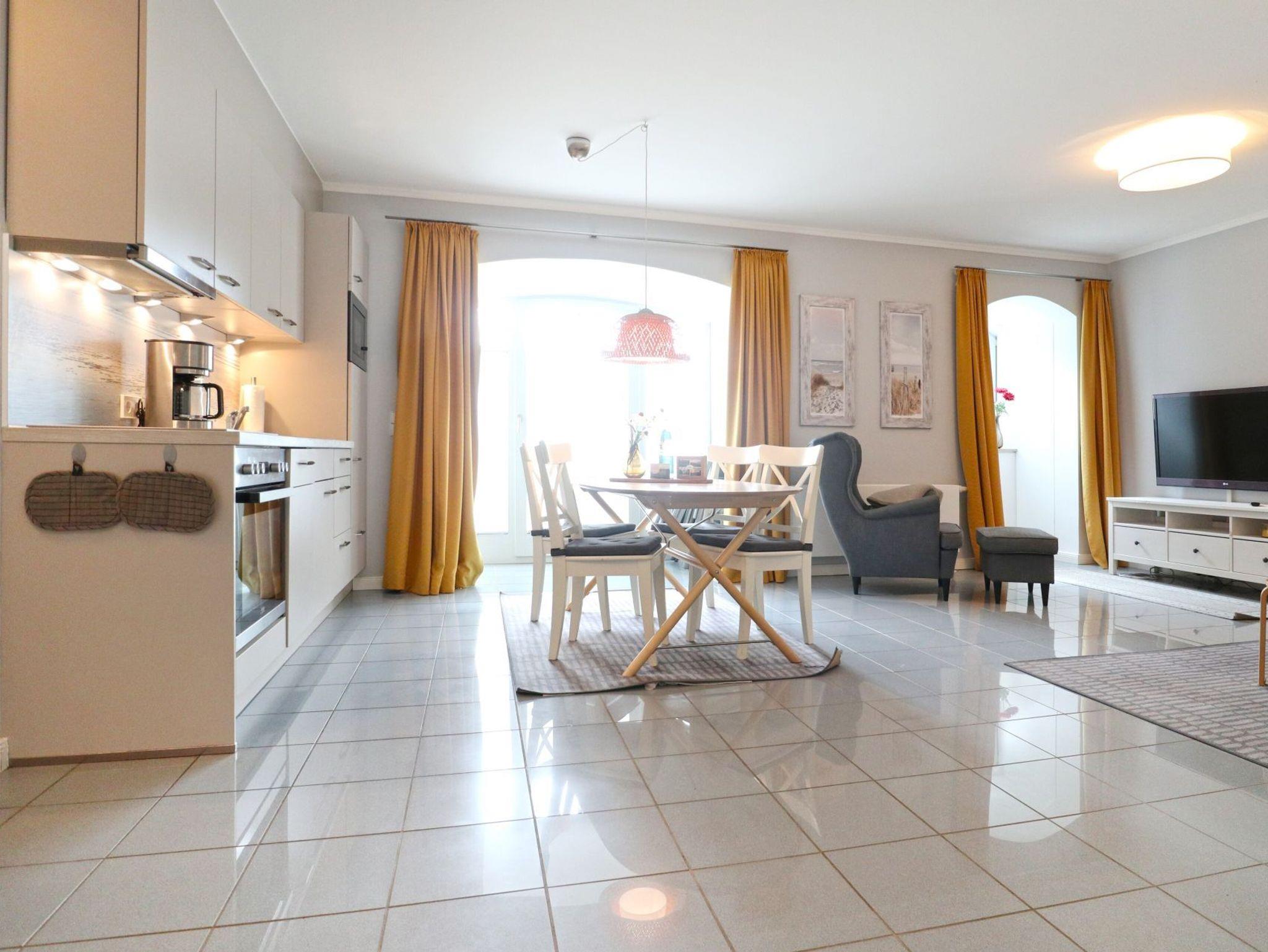 Das 2-Zimmer-Appartement befindet sich in der 1.Etage. Bis zu 4 Personen können hier auf 60 m² Wohnfläche einen unbeschwerten Urlaub verbringen. Die Villa Sonnengarten befindet sich zentrumsnah nur 50 m vom Sandstrand entfernt. Das Appartement verfügt über einen hellen Wohn-/ Essbereich mit Eck-Couch, Fernseher und eine Musikanlage. Von hier aus haben Sie direkten Zugang zum Ost-Balkon. Die integrierte Küche ist modern und unter anderem mit Geschirrspüler, Mikrowelle, Kaffeemaschine, Toaster und diversen Kleingeräten komplett ausgestattet. Das Schlafzimmer ist mit einem Doppelbett und einem großen Kleiderschrank eingerichtet. Des Weiteren steht für Sie ein Duschbad mit Waschmaschine bereit. Insgesamt besticht das Appartement durch liebevoll gewählte Details und der durchdachten stilvollen Einrichtung. Eine Kaution in Höhe von 500 Euro ist am Anreisetag in bar zu hinterlegen.