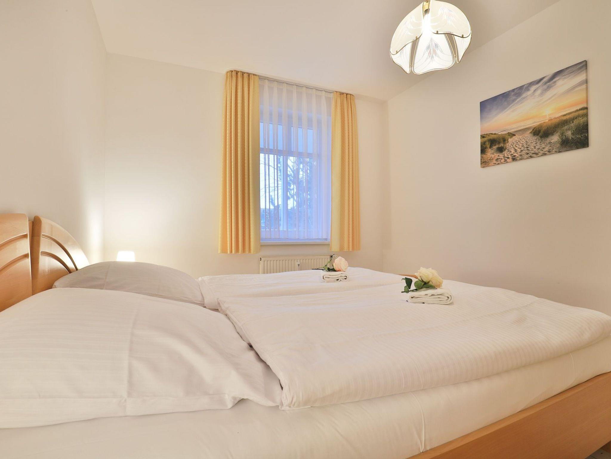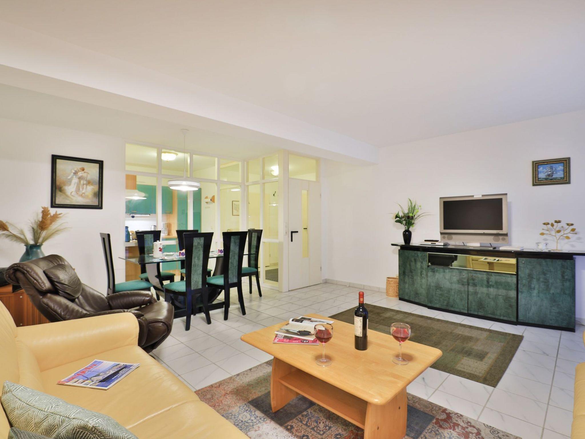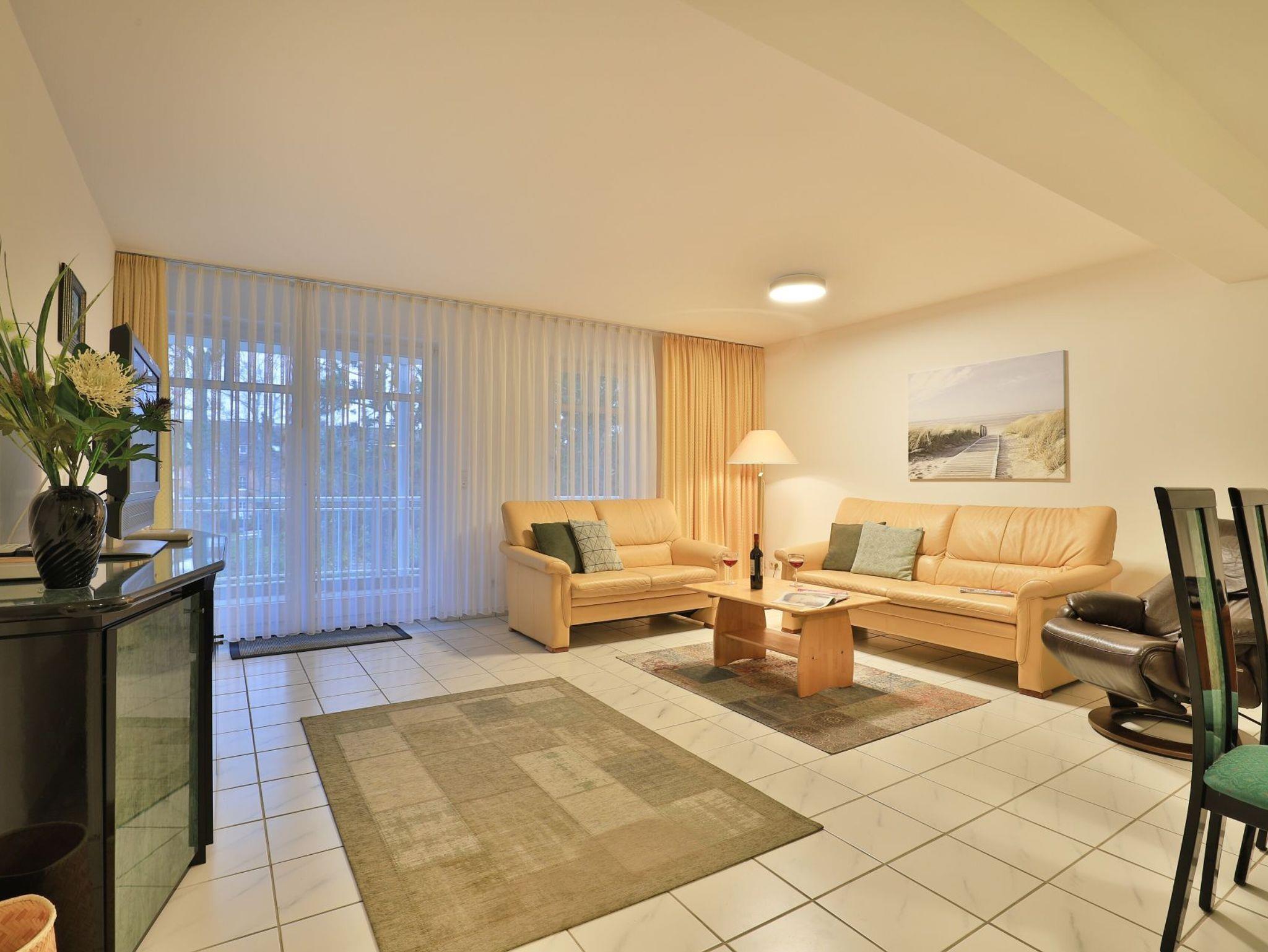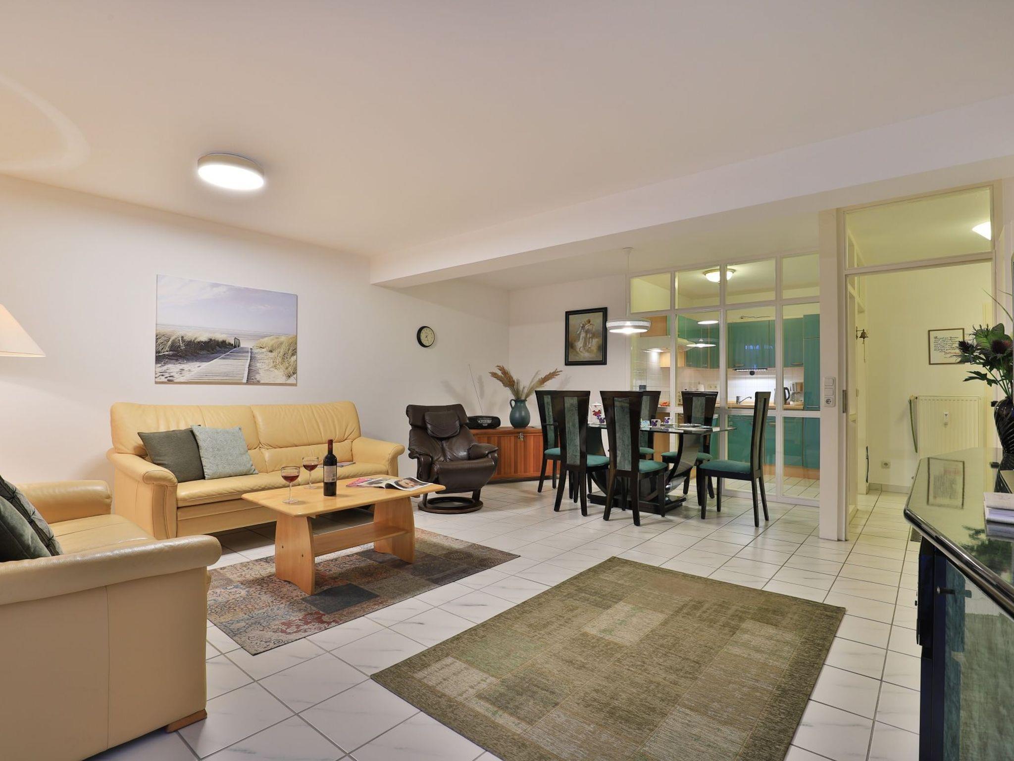 Die behagliche, komfortabel eingerichtete 2-Zimmer-Ferienwohnung befindet sich im 1. Obergeschoss und bietet auf 67qm Wohnfläche Platz für bis zu 4 Personen. Der gemütliche Wohn-/Essbereich ist mit zwei komfortablen Sofas, einem Relax-Sessel und einem großen Esstisch ausgestattet. Unterhaltung bieten ein Fernseher, DVD-Player, Videorecorder und eine Musikanlage. Den Internetzugang über WLAN nutzen Sie ohne Gebühr. Die separate Küche ist ideal für die Selbstversorgung und verfügt über Herd, Backofen, Kühlschrank mit Gefrierfach, Geschirrspüler sowie Toaster, Wasserkocher und Kaffeemaschine. Genießen Sie Ihre Mahlzeiten im Essbereich oder auf dem sonnigen, saisonal möblierten Balkon. Das geräumige Schlafzimmer bietet ein Doppelbett und einen Kleiderschrank, während das modernisierte Duschbad mit Waschtisch und WC ausgestattet ist. Eine Waschmaschine steht kostenfrei zur Verfügung, und Ihr PKW kann in der hauseigenen Tiefgarage geparkt werden, von wo aus Sie mit dem Fahrstuhl direkt zur Wohnungsetage gelangen.