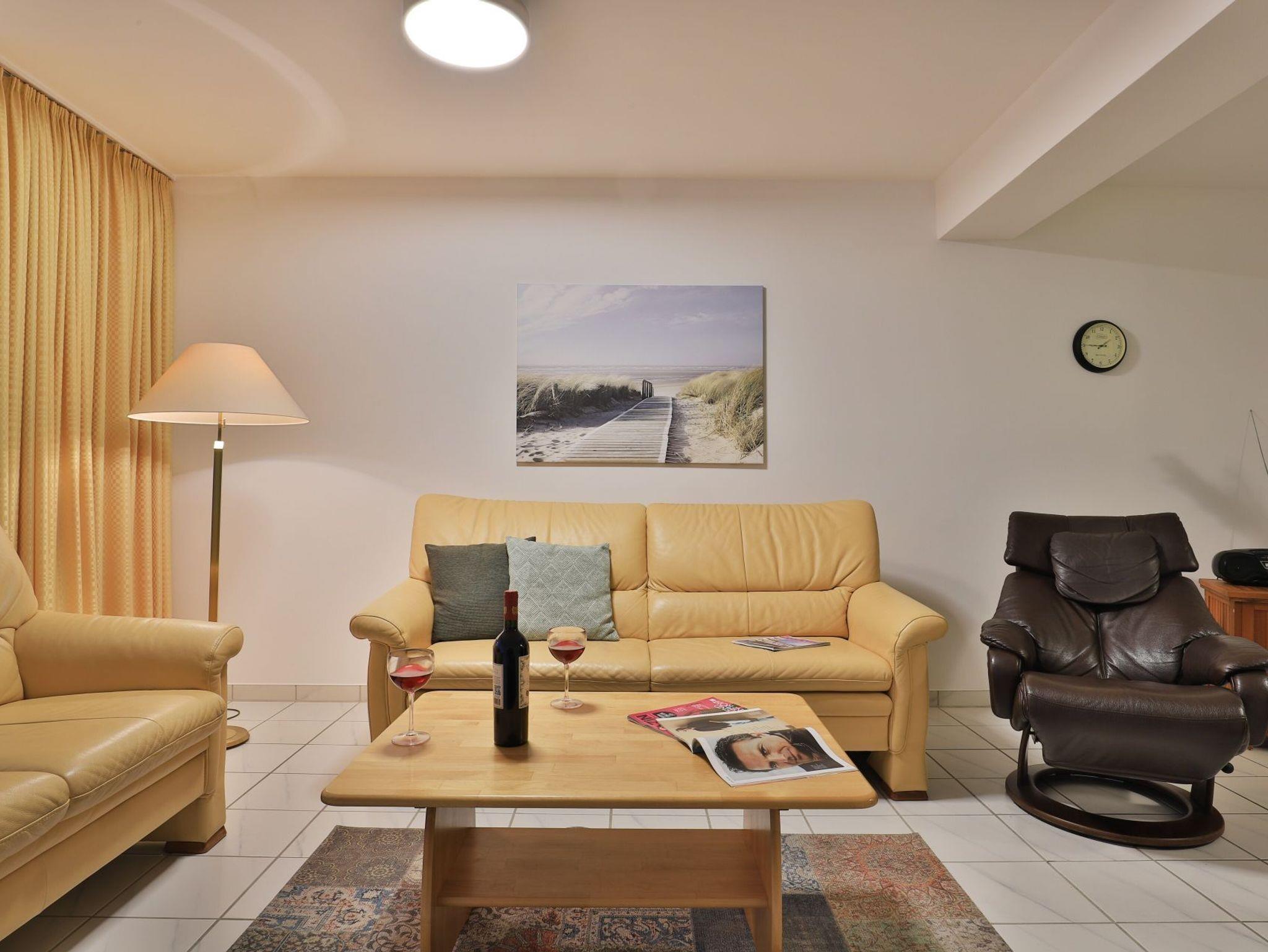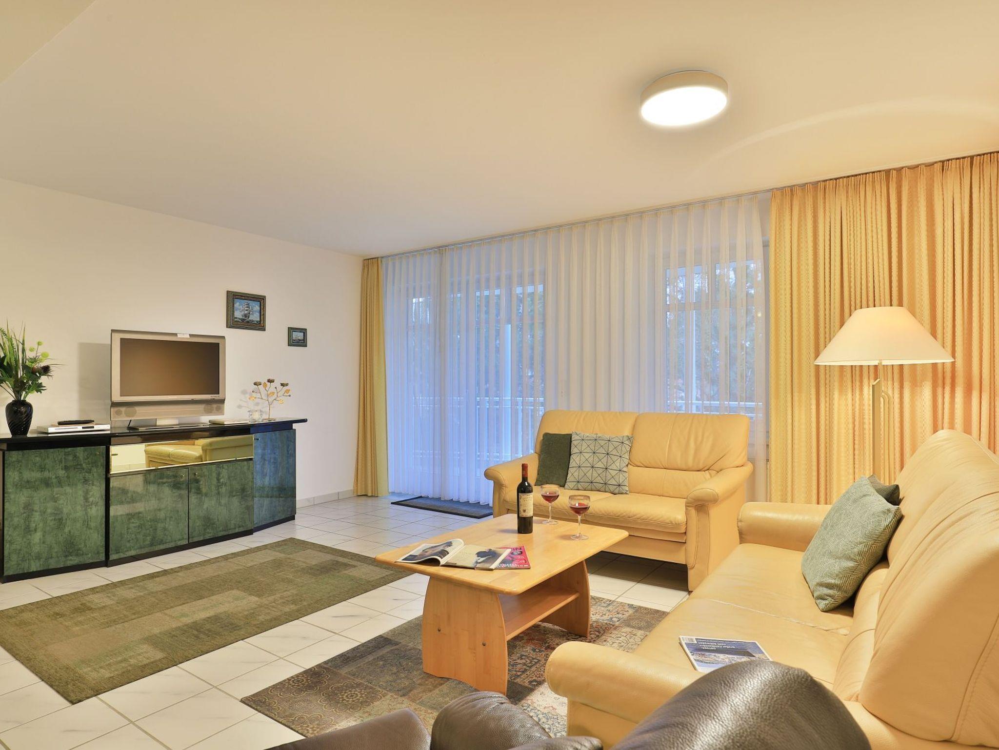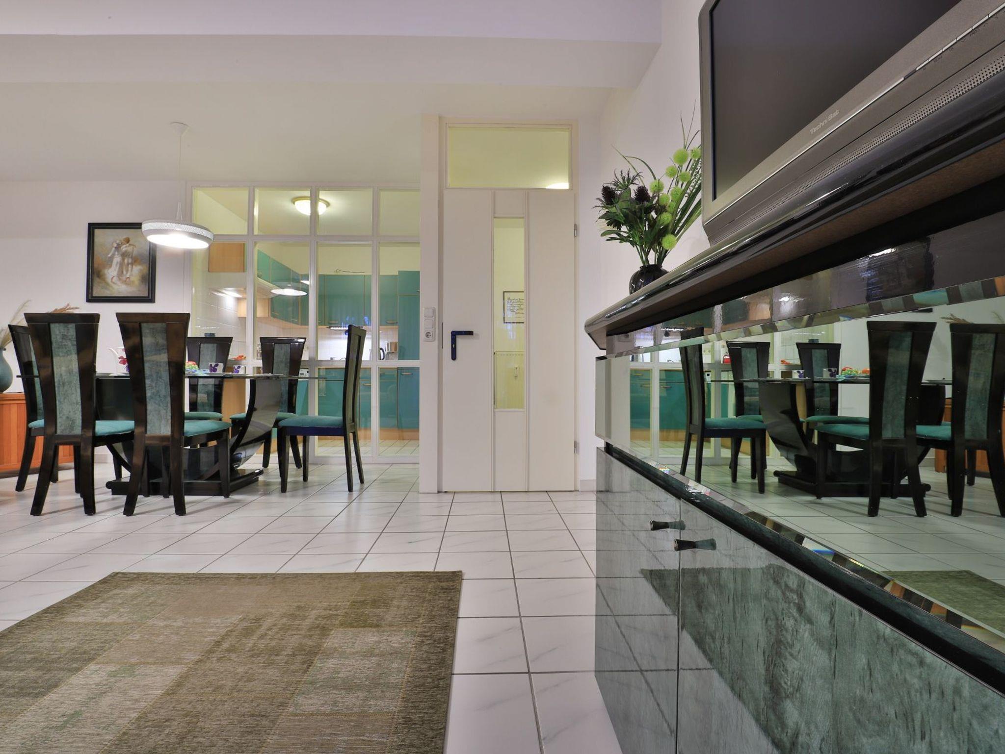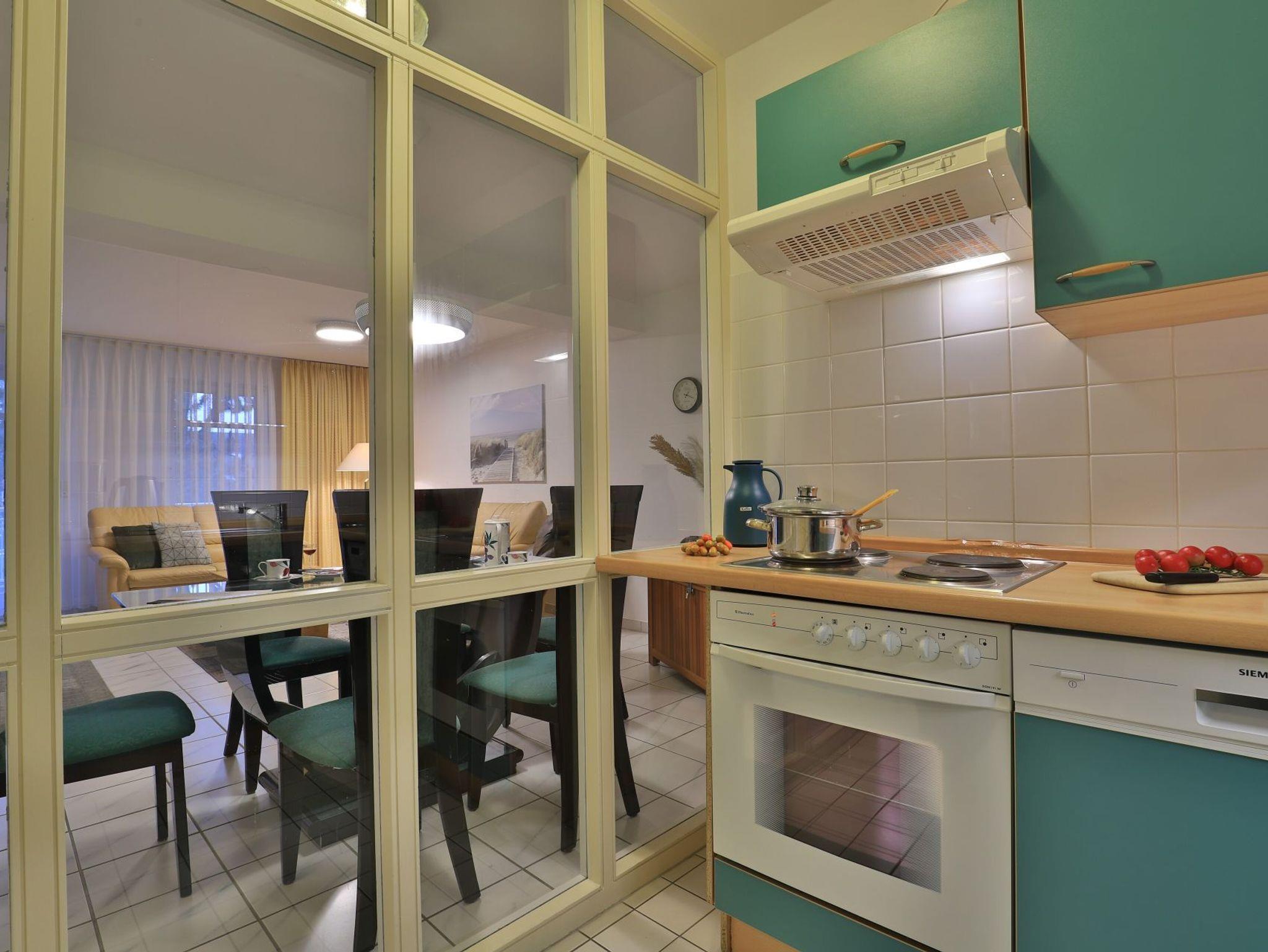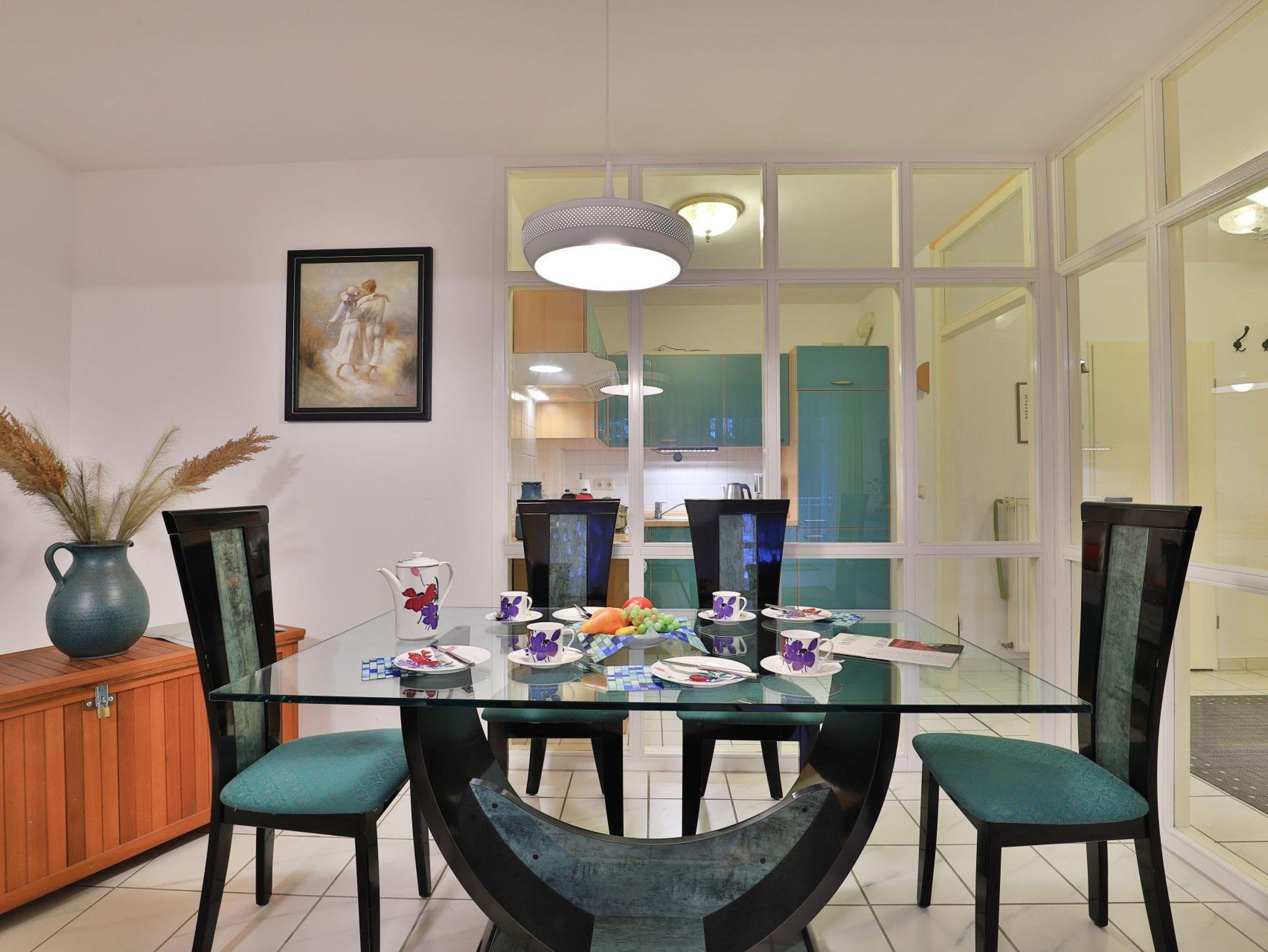 Die behagliche, komfortabel eingerichtete 2-Zimmer-Ferienwohnung befindet sich im 1. Obergeschoss und bietet auf 67qm Wohnfläche Platz für bis zu 4 Personen. Der gemütliche Wohn-/Essbereich ist mit zwei komfortablen Sofas, einem Relax-Sessel und einem großen Esstisch ausgestattet. Unterhaltung bieten ein Fernseher, DVD-Player, Videorecorder und eine Musikanlage. Den Internetzugang über WLAN nutzen Sie ohne Gebühr. Die separate Küche ist ideal für die Selbstversorgung und verfügt über Herd, Backofen, Kühlschrank mit Gefrierfach, Geschirrspüler sowie Toaster, Wasserkocher und Kaffeemaschine. Genießen Sie Ihre Mahlzeiten im Essbereich oder auf dem sonnigen, saisonal möblierten Balkon. Das geräumige Schlafzimmer bietet ein Doppelbett und einen Kleiderschrank, während das modernisierte Duschbad mit Waschtisch und WC ausgestattet ist. Eine Waschmaschine steht kostenfrei zur Verfügung, und Ihr PKW kann in der hauseigenen Tiefgarage geparkt werden, von wo aus Sie mit dem Fahrstuhl direkt zur Wohnungsetage gelangen.