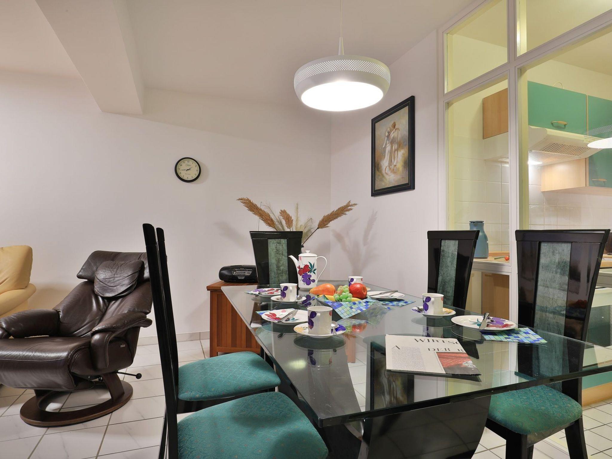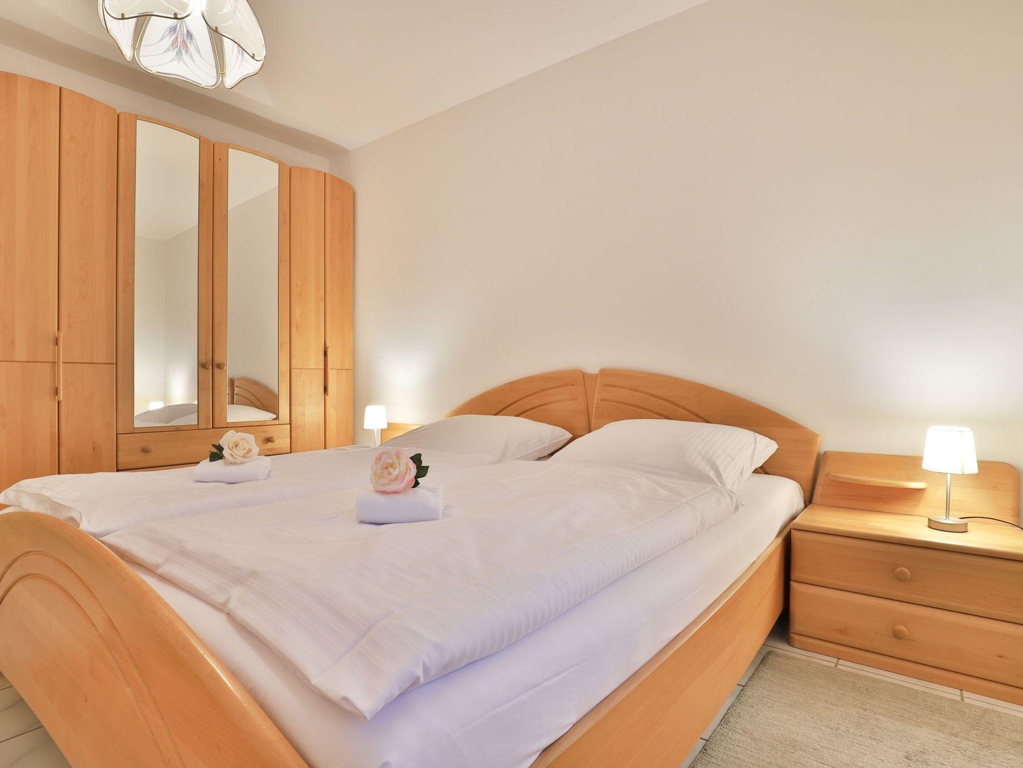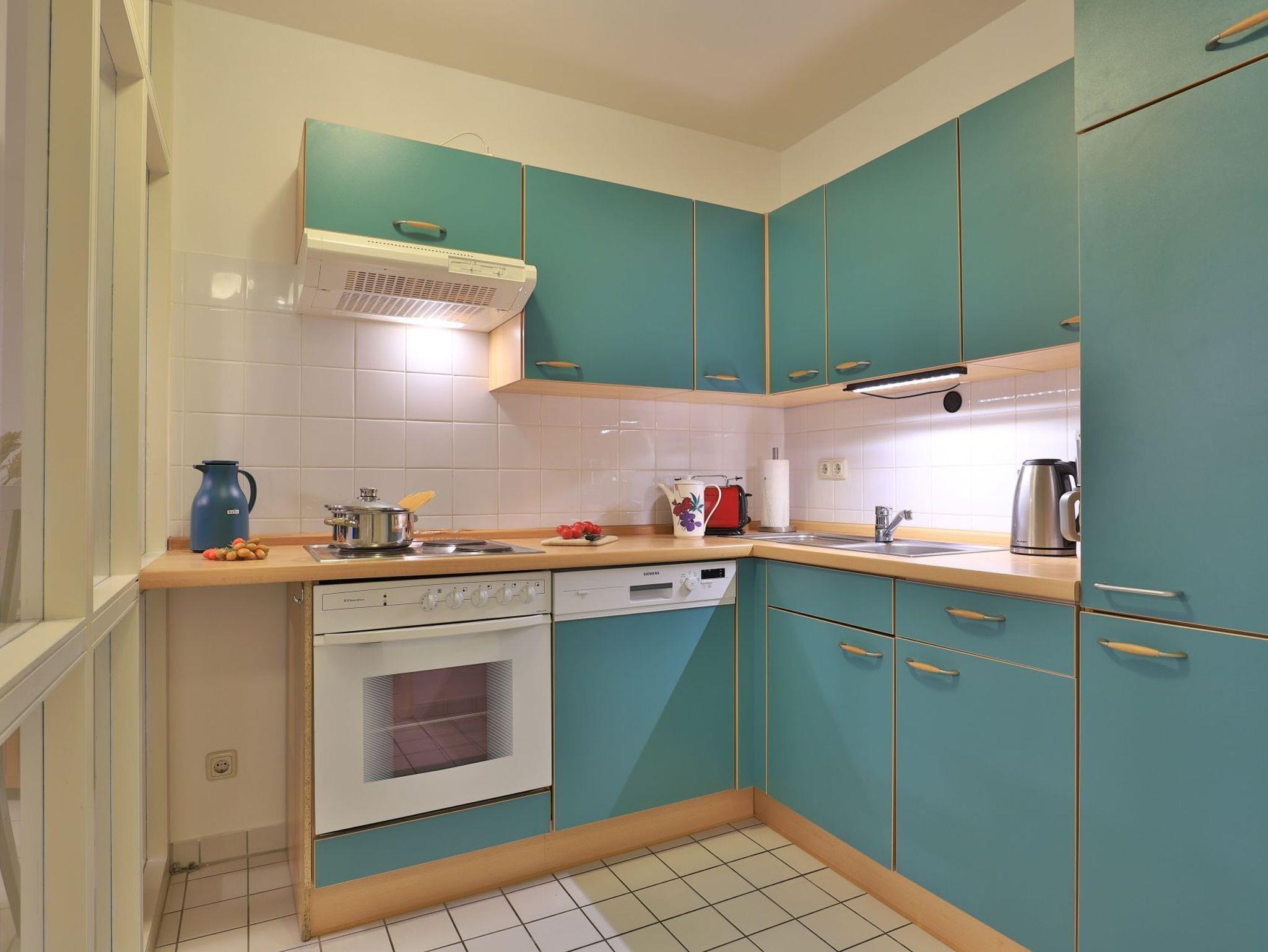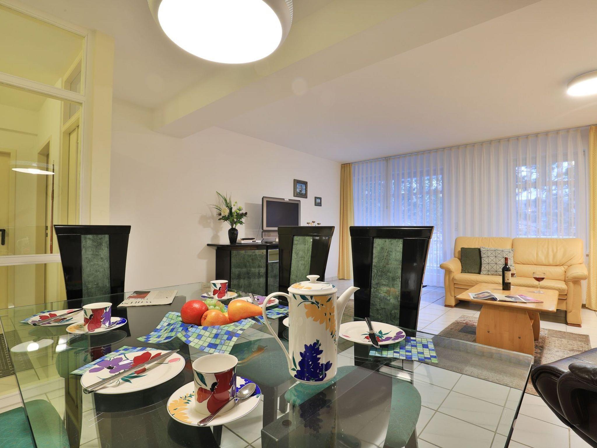 Die behagliche, komfortabel eingerichtete 2-Zimmer-Ferienwohnung befindet sich im 1. Obergeschoss und bietet auf 67qm Wohnfläche Platz für bis zu 4 Personen. Der gemütliche Wohn-/Essbereich ist mit zwei komfortablen Sofas, einem Relax-Sessel und einem großen Esstisch ausgestattet. Unterhaltung bieten ein Fernseher, DVD-Player, Videorecorder und eine Musikanlage. Den Internetzugang über WLAN nutzen Sie ohne Gebühr. Die separate Küche ist ideal für die Selbstversorgung und verfügt über Herd, Backofen, Kühlschrank mit Gefrierfach, Geschirrspüler sowie Toaster, Wasserkocher und Kaffeemaschine. Genießen Sie Ihre Mahlzeiten im Essbereich oder auf dem sonnigen, saisonal möblierten Balkon. Das geräumige Schlafzimmer bietet ein Doppelbett und einen Kleiderschrank, während das modernisierte Duschbad mit Waschtisch und WC ausgestattet ist. Eine Waschmaschine steht kostenfrei zur Verfügung, und Ihr PKW kann in der hauseigenen Tiefgarage geparkt werden, von wo aus Sie mit dem Fahrstuhl direkt zur Wohnungsetage gelangen.
