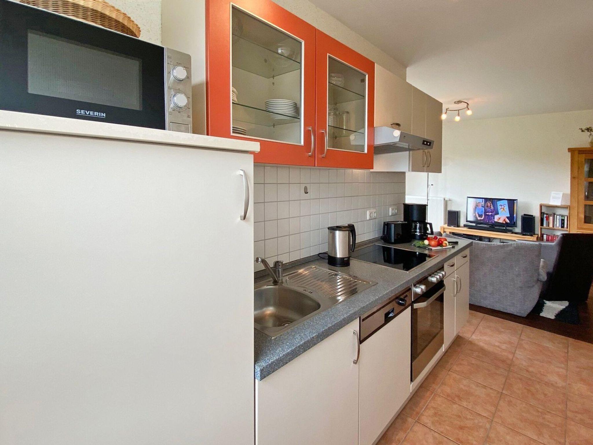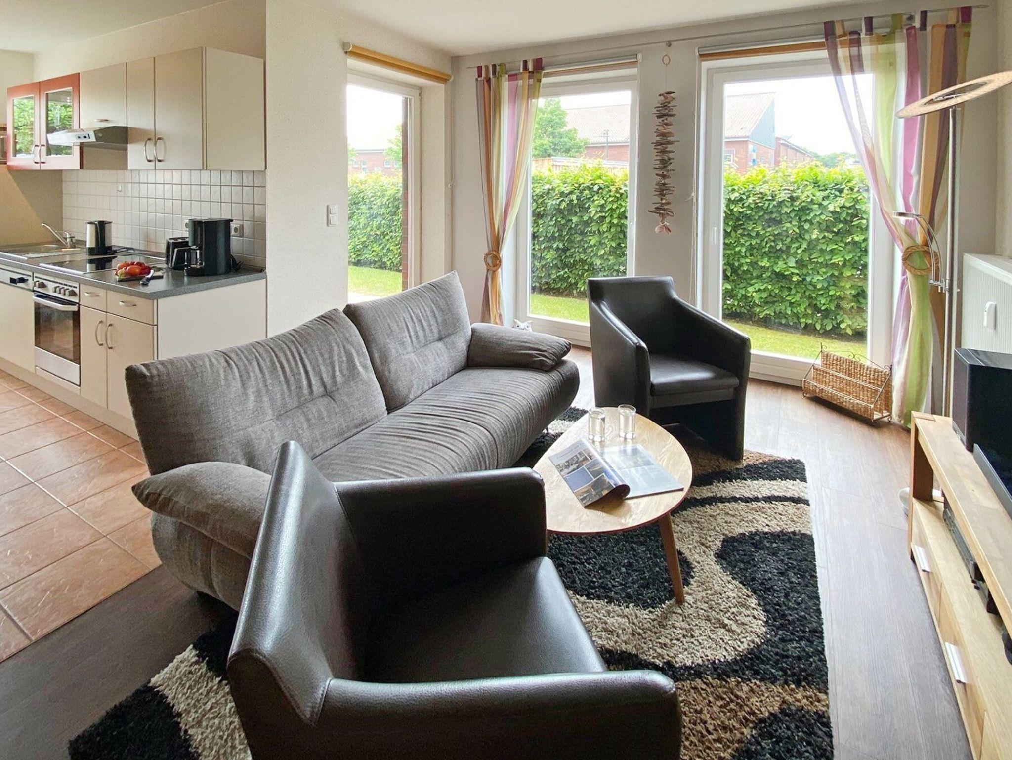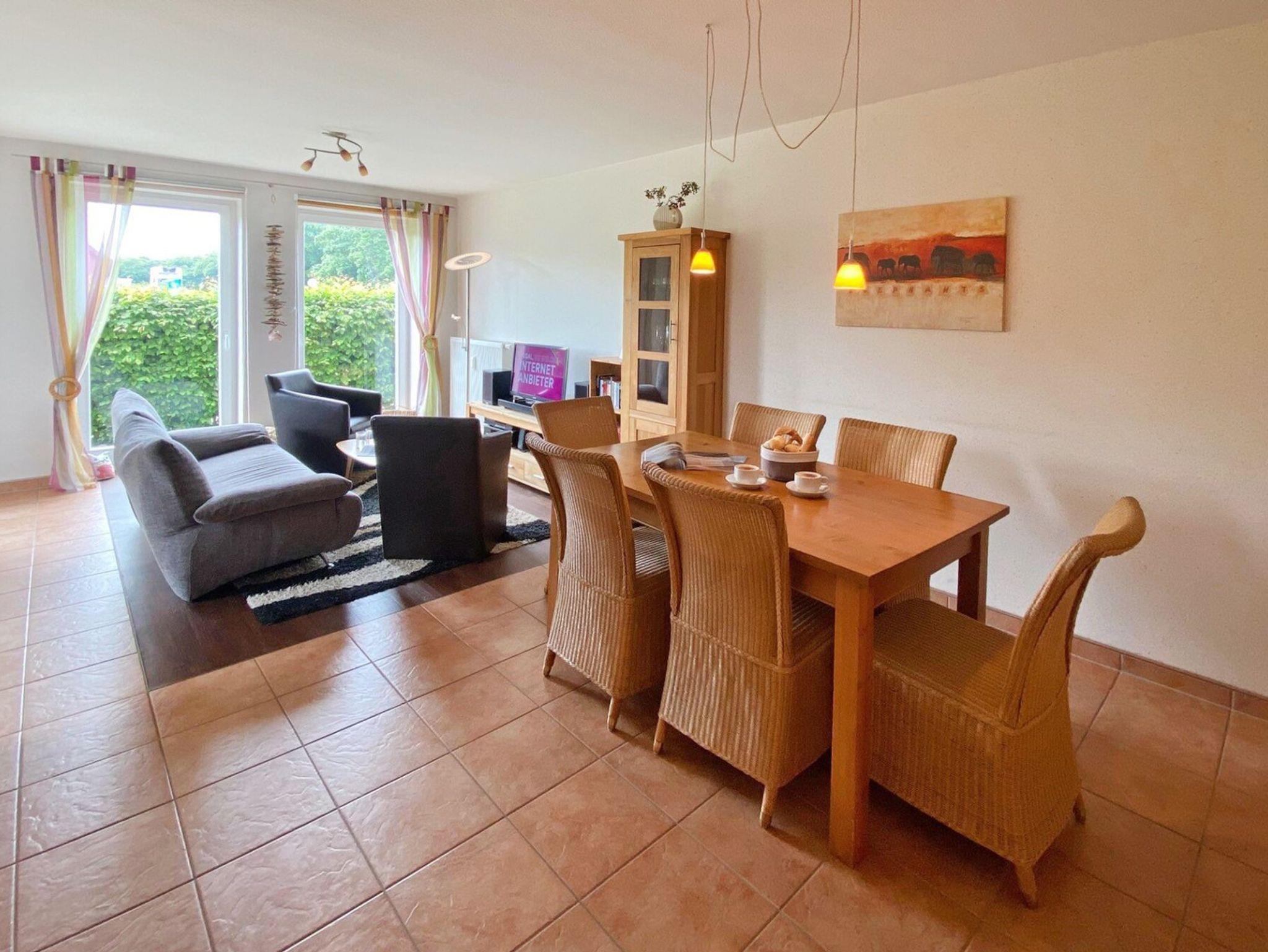 Die 3- Zimmer Erdgeschoss Ferienwohnung Nr. 1 im Kastanienhof Boltenhagen besitzt eine Wohnfläche von 60qm und kann mit max. 4 Personen belegt werden. Die Wohnung verwöhnt mit einer wohnungseigenen Terrasse, mit Grillmöglichkeit. Der gemütlich eingerichtete Wohn-/Essbereich mit Terrassenzugang, ist mit einem Sofa und zwei Sesseln sowie einem Esstisch möbliert. Ein Fernseher, DVD-Player, Musikanlage und gebührenfreies WLAN sind ebenfalls vorhanden. Eine, an den Wohnraum grenzende offene Küche, ermöglicht die Eigenversorgung mit: Ceranfeldherd, Backofen, Mikrowelle, Dunstabzug, Kühlschrank mit integr. Gefrierfach, Kaffeemaschine, Wasserkocher, Toaster, Geschirrspüler u.v.m. Ihre Urlaubsmahlzeiten nehmen Sie am Esstisch zu sich, oder Sie genießen während der wärmeren Jahreszeit die saisonal möblierte Süd- Terrasse, mit Grillmöglichkeit. Sehr vorteilhaft bietet das Appartement zwei separate Schlafzimmer. Eines der Schlafzimmer verfügt über ein Doppelbett und eine offene Kleiderablage. Das zweite Schlafzimmer ist mit zwei Einzelbetten sowie Fernseher ausgestattet.