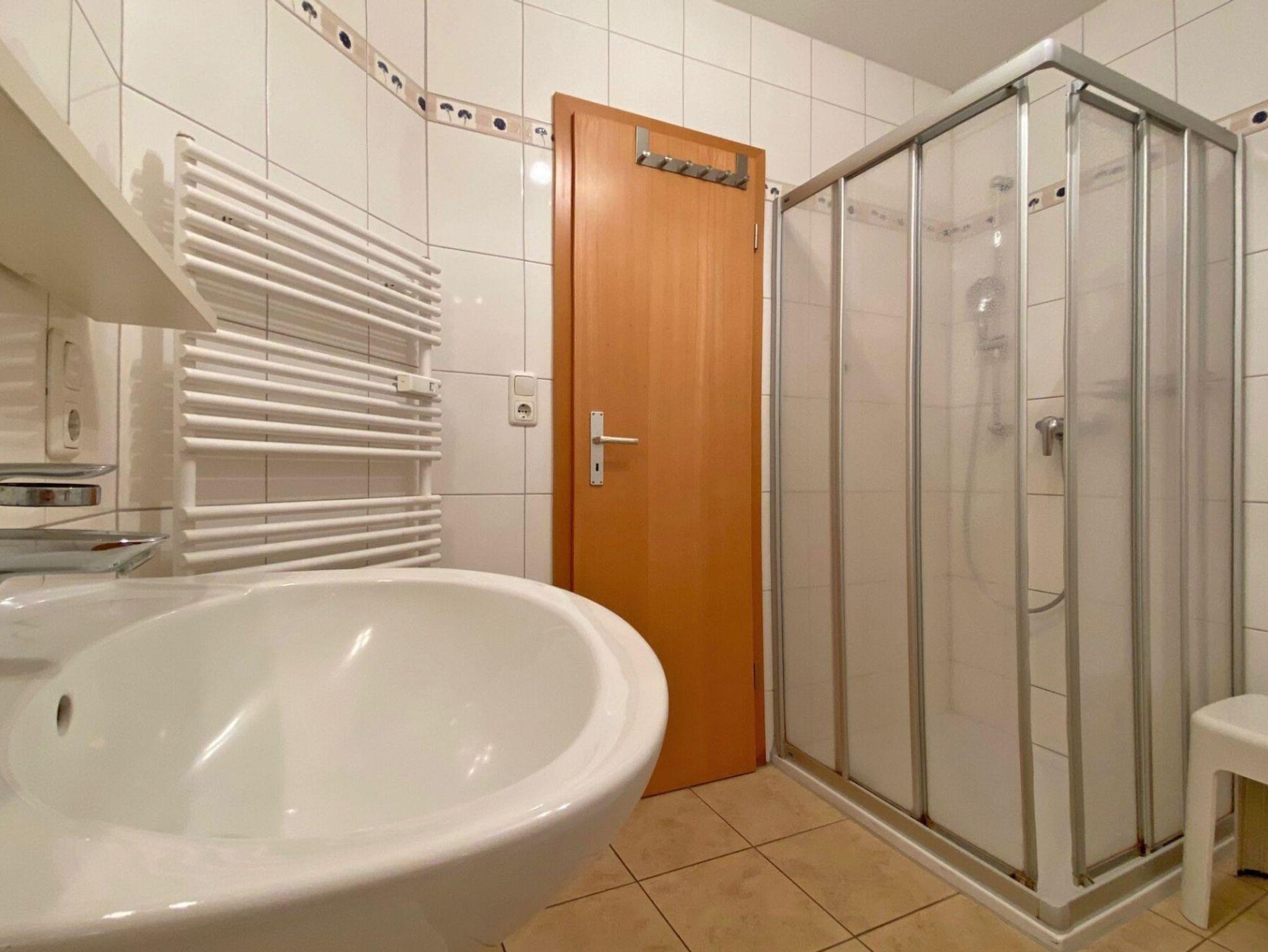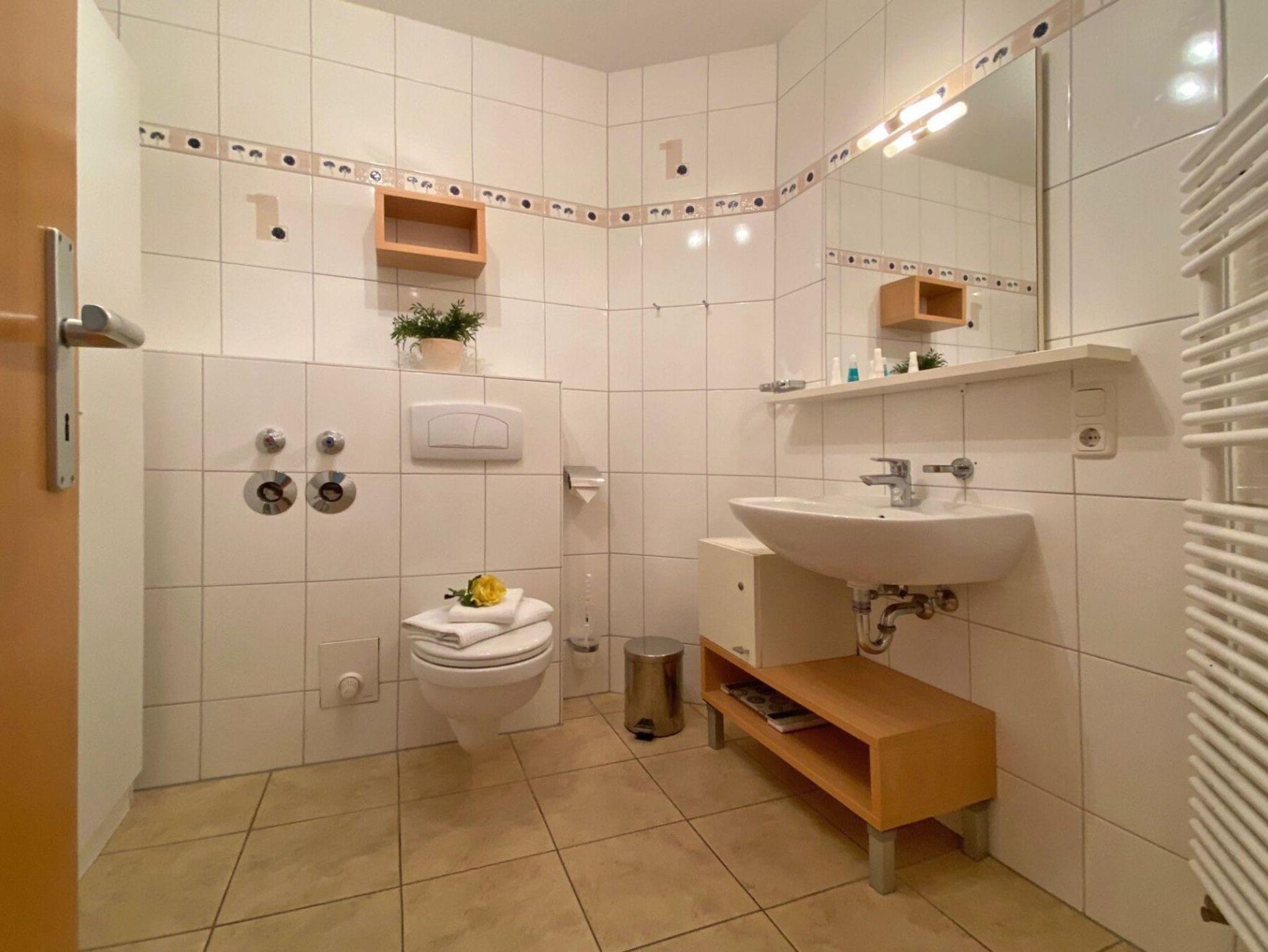 Zugehörig ist ein Duschbad mit Waschtisch, Handtuchheizung und WC.