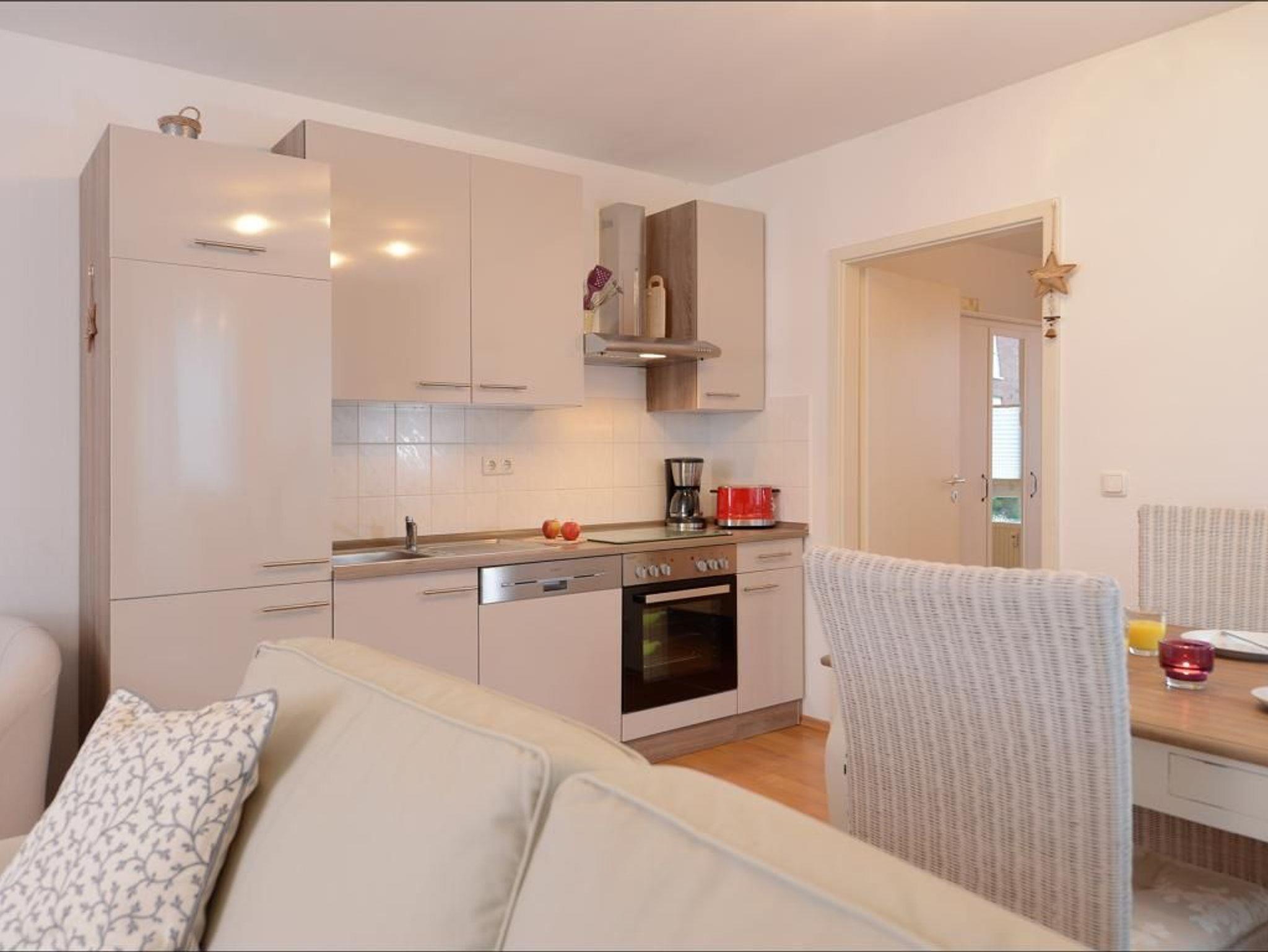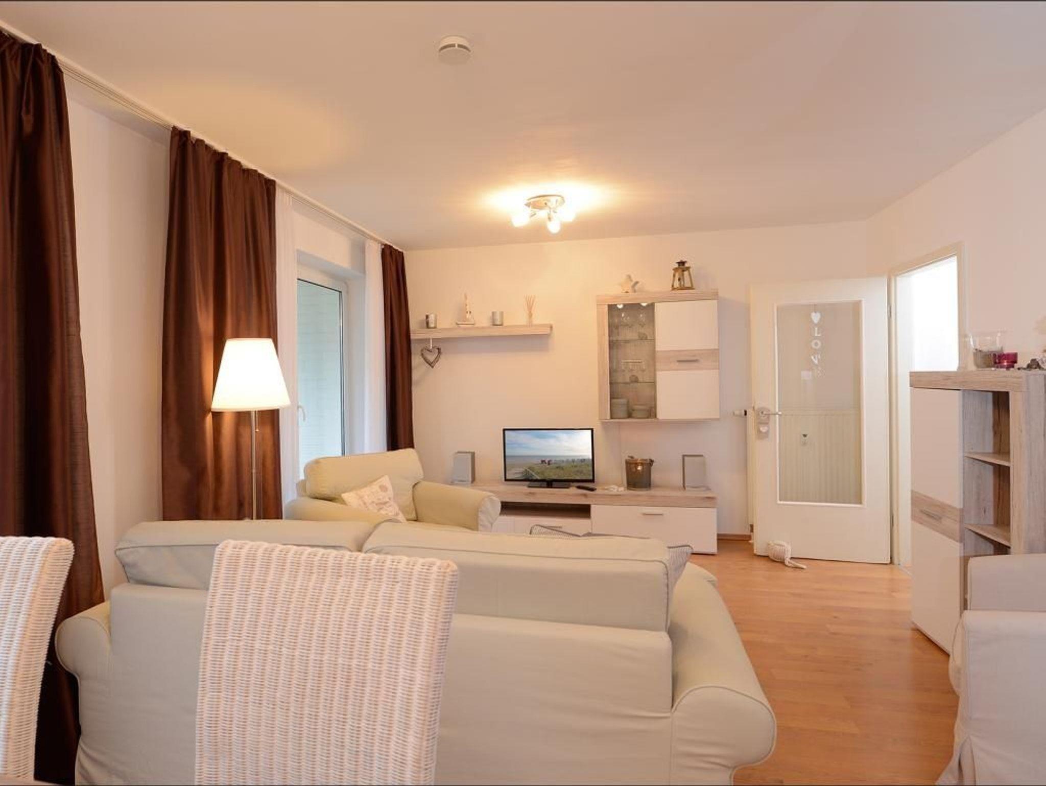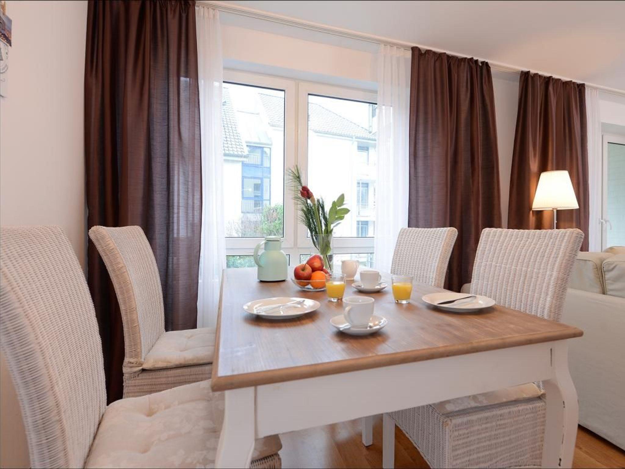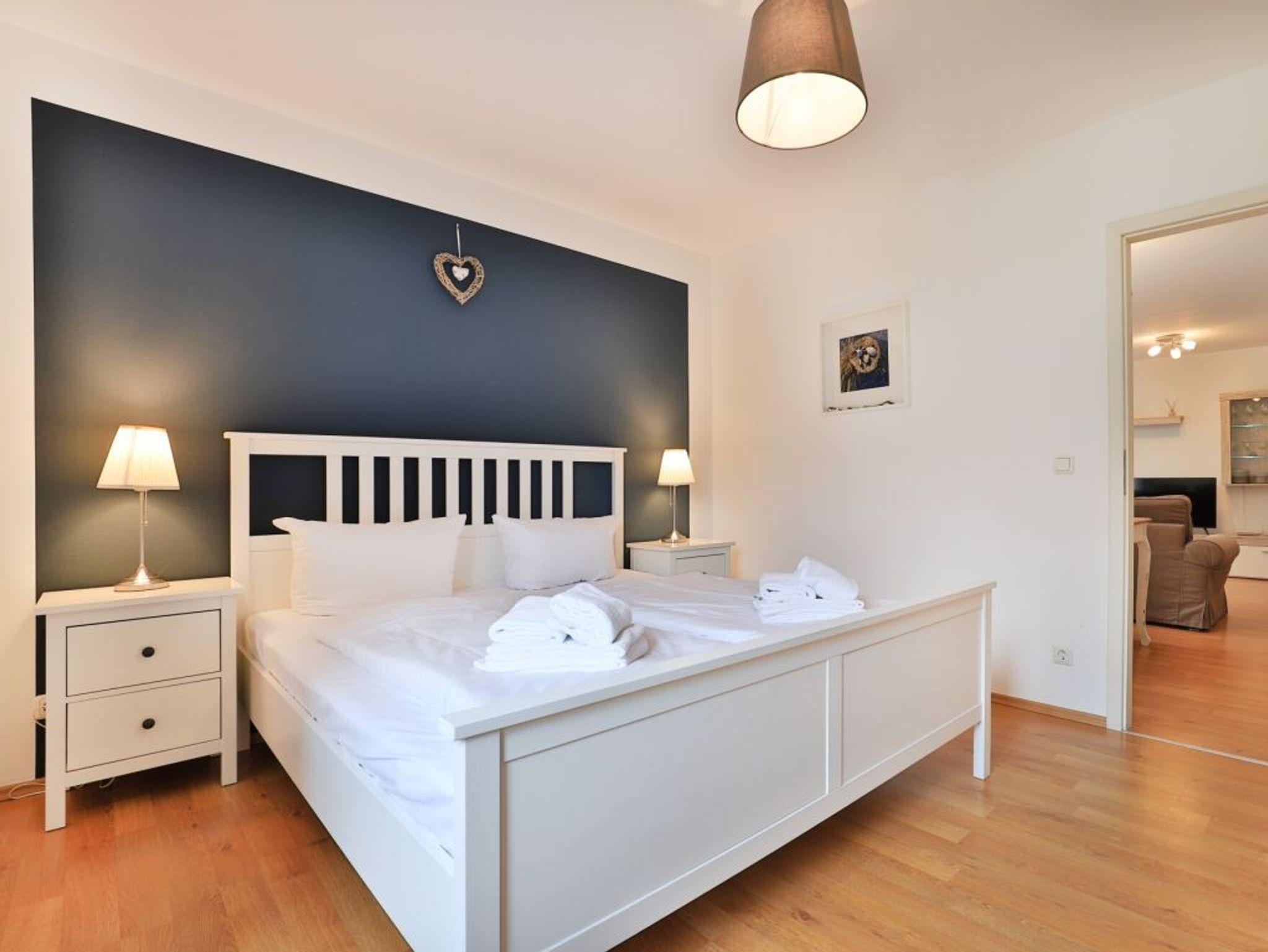 Das familienfreundliche 2-Zimmer-Appartement ist sehr komfortabel ausgestattet. Es liegt im 1. Obergeschoss und bietet auf 50 m² Wohnfläche Platz für bis zu 4 Personen. Auf dem saisonal möblierten Balkon können sie entspannen. Eine voll ausgestattete Wohnküche, ein separates Schlafzimmer und ein geräumiges Duschbad mit WC, Fön ist vorhanden. Der gemütliche Wohnbereich ist mit einem Sofa ausgestattet, das sich einfach in eine Schlafcouch verwandeln lässt und somit eine Liegefläche von 1,60m mal 2,00m bietet. Zur technischen Ausstattung gehört ein Fernseher mit SKY (Cinema, Sport), ein DVD-Player, eine Musikanlage und kostenfreies WLAN. Die Küchenzeile ist ideal für Selbstversorger und bietet einen Ceranfeldherd mit Backofen, Mikrowelle, Kühlschrank mit Gefrierfach, Geschirrspüler und weitere Geräte. Ihre Mahlzeiten können Sie am Esstisch oder auf dem saisonal möblierten Balkon zu sich nehmen. Das geräumige Schlafzimmer ist mit einem Doppelbett, einem großen Kleiderschrank, Wäschekommode und einem 2. Fernseher eingerichtet. Ein Einbauschrank im Eingangsflur bietet zusätzlichen Stauraum, und ein Kinderhochstuhl steht ebenfalls bereit. Der Fußboden ist gefliest. Ihr Fahrzeug parken Sie kostenfrei auf dem eigenen Tiefgaragenstellplatz. Eine Waschmaschine und ein Wäschetrockner sind im Haus gegen Gebühr verfügbar. Hunde sind gegen Gebühr herzlich willkommen.