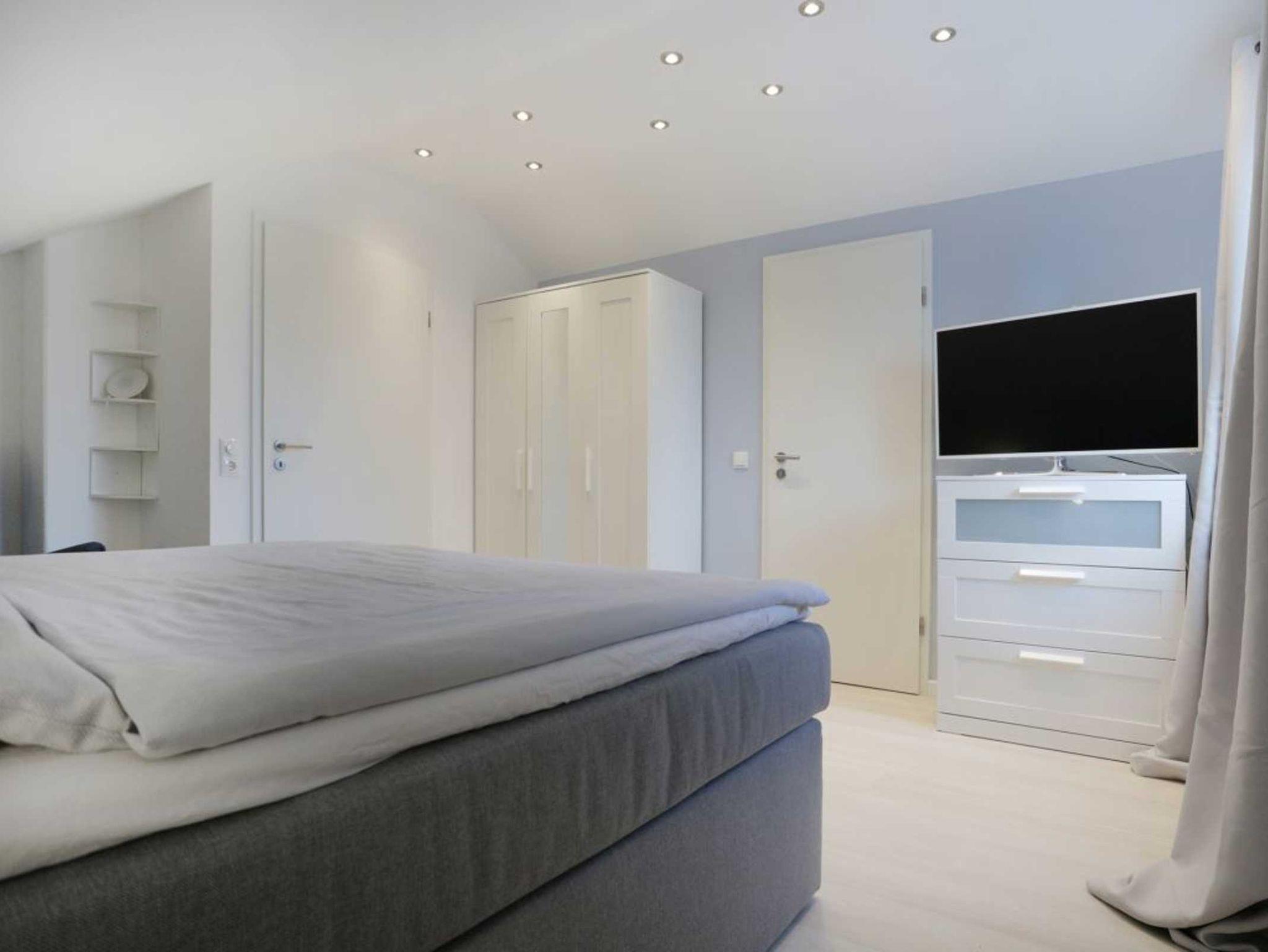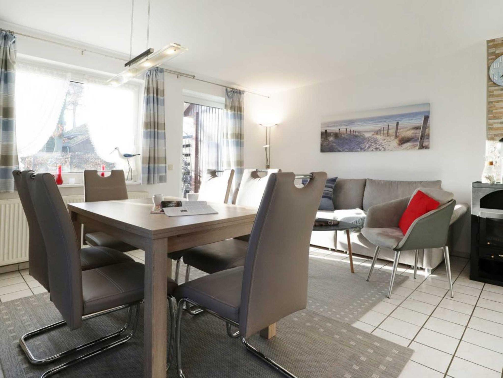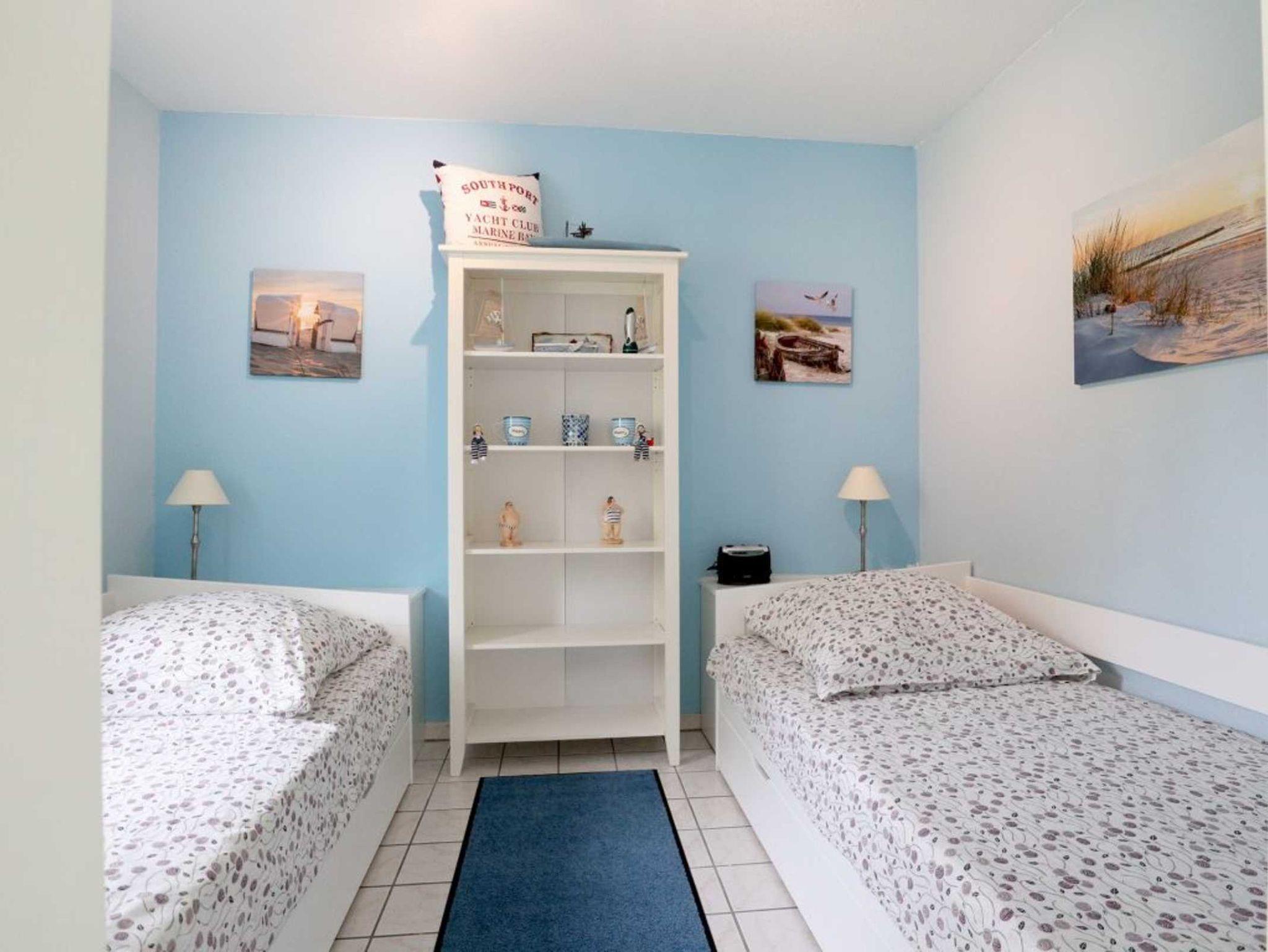 Zur Küchenausstattung gehören Herd mit Backofen, Mikrowelle, Geschirrspüler sowie Kaffeemaschine, Toaster, Wasserkocher u.v.m. Vom Wohnbereich aus gelangen sie auf die Terrasse, die während der Saison möbliert ist. Zudem befindet sich im Erdgeschoss ein separates Schlafzimmer mit zwei Einzelbetten und Kleiderschrank. Auch ein Tageslichtbad mit Dusche und Waschmaschinennutzung hier zu finden. Über eine Treppe gelangen Sie in das Obergeschoss, wo sich ein weiteres Schlafzimmer mit Doppelbett, Kinderbett und Kleiderschrank befindet.