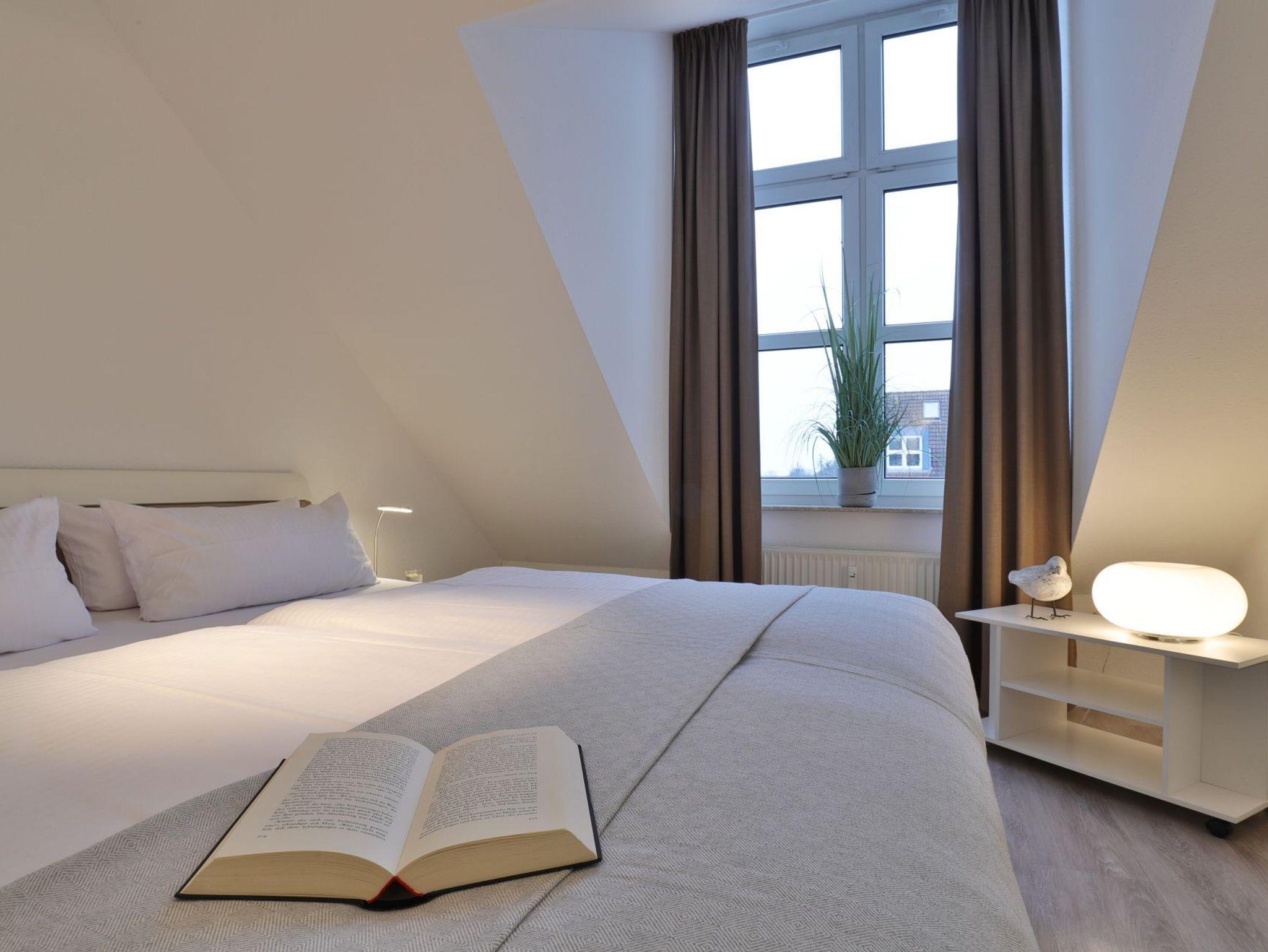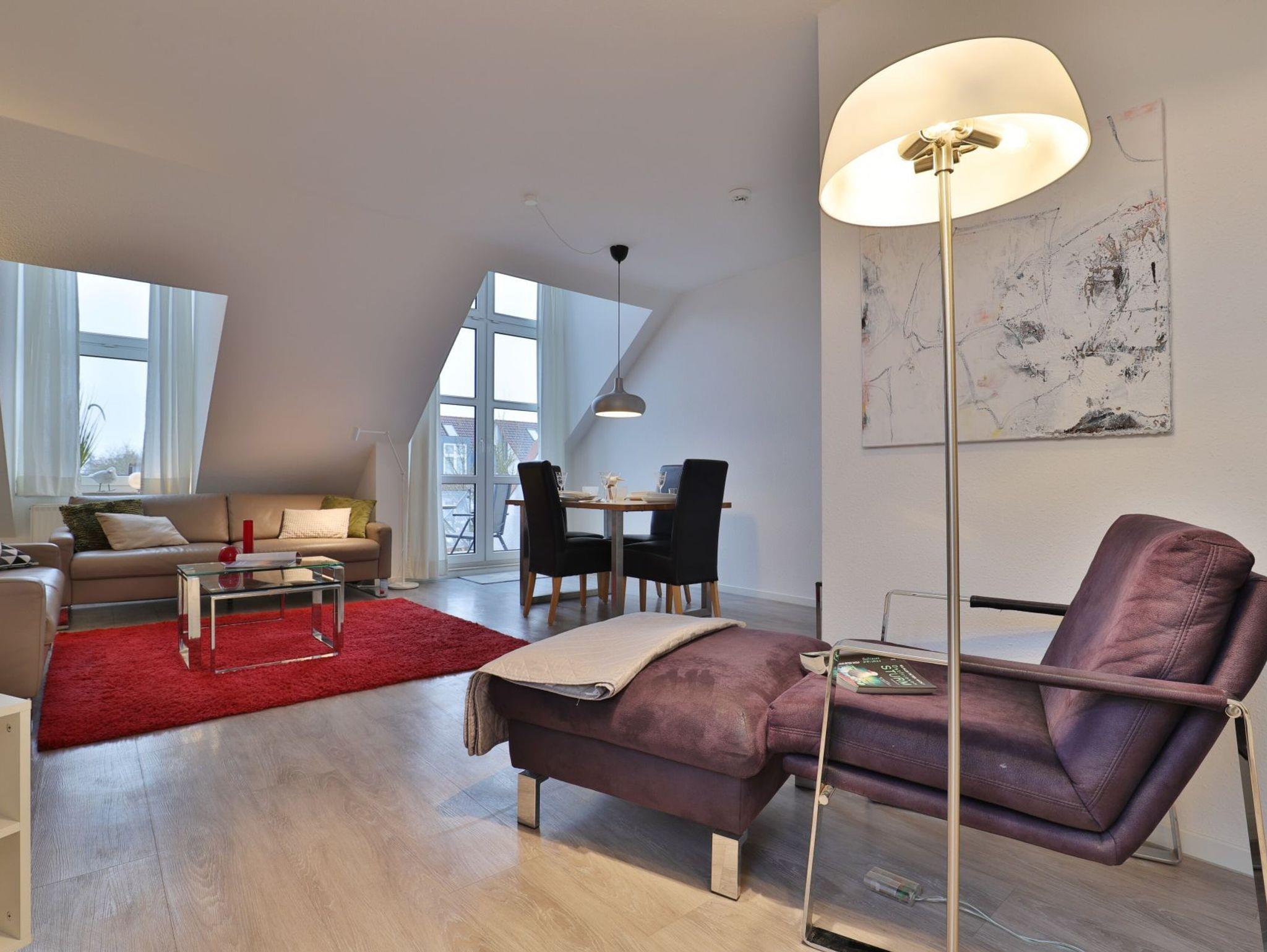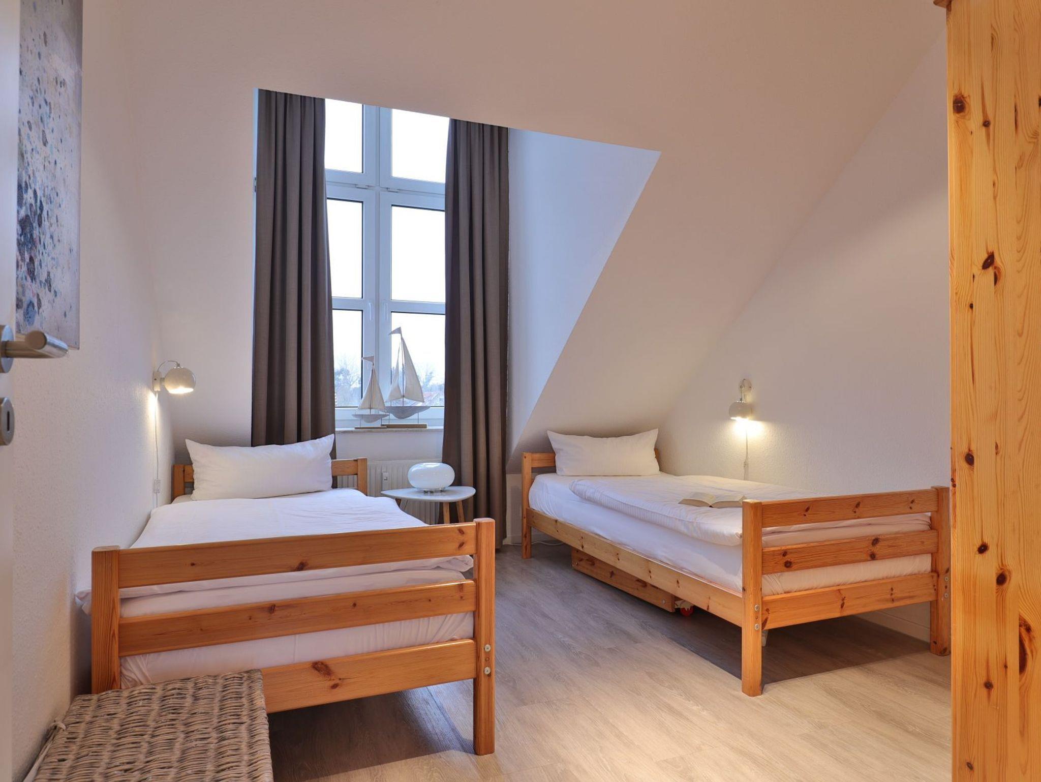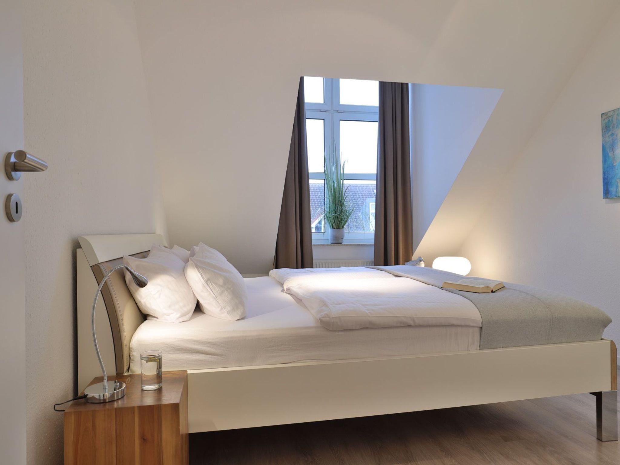 Nur 350 Meter vom Strand entfernt befindet sich die modernisierte 3-Zimmer-Ferienwohnung ? Sünnslag 13-59 -mit Balkon im Dachgeschoss einer gepflegten Ferienwohnanlage. Das hochwertig ausgestattete Appartement bietet auf ca. 63 qm Wohnfläche Platz für bis zu 4 Personen. Der helle Wohnbereich verfügt über ein bequemes Sofa, einen gemütlichen Ruhesessel sowie einen Esstisch für gemeinsame Mahlzeiten. Zur Unterhaltung stehen ein Flachbild-TV, DVD-Player, Musikanlage und kostenfreies WLAN zur Verfügung. Die separate Küche ist voll ausgestattet mit Cerankochfeld, Backofen, Mikrowelle, Kühlschrank, Geschirrspüler sowie Kaffeemaschine, Toaster und Wasserkocher. Zwei separate Schlafzimmer sorgen für erholsamen Schlaf: eines mit Doppelbett und Kleiderschrank, das zweite mit zwei Einzelbetten. Ein zweckmäßig ausgestattetes Duschbad ist vorhanden. Für kleine Kinder steht ein Reisebett im Appartement. Ebenso sind Bügeleisen und Bügelbrett vorhanden. Ein kostenfreier, reservierter PKW-Stellplatz befindet sich direkt am Haus. Nichtraucherwohnung, Haustiere sind nicht erlaubt. Zur Erleichterung des Reisegepäcks können Bettwäsche und Handtücher gegen Gebühr hinzugebucht werden; die Wäschepakete erhalten Sie bei Anreise im Büro.