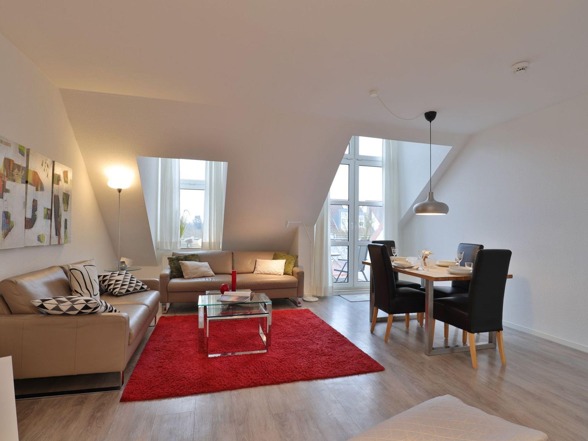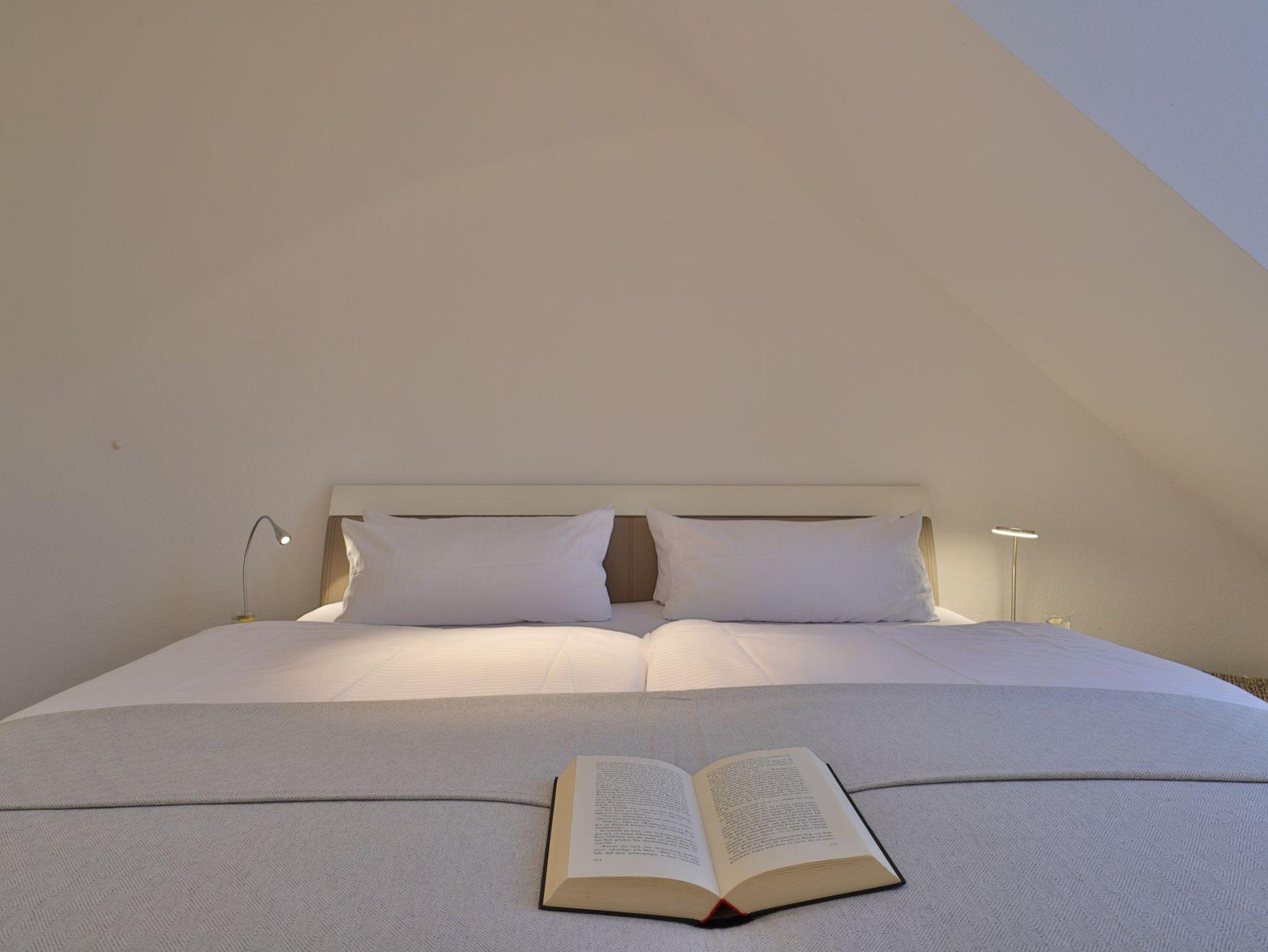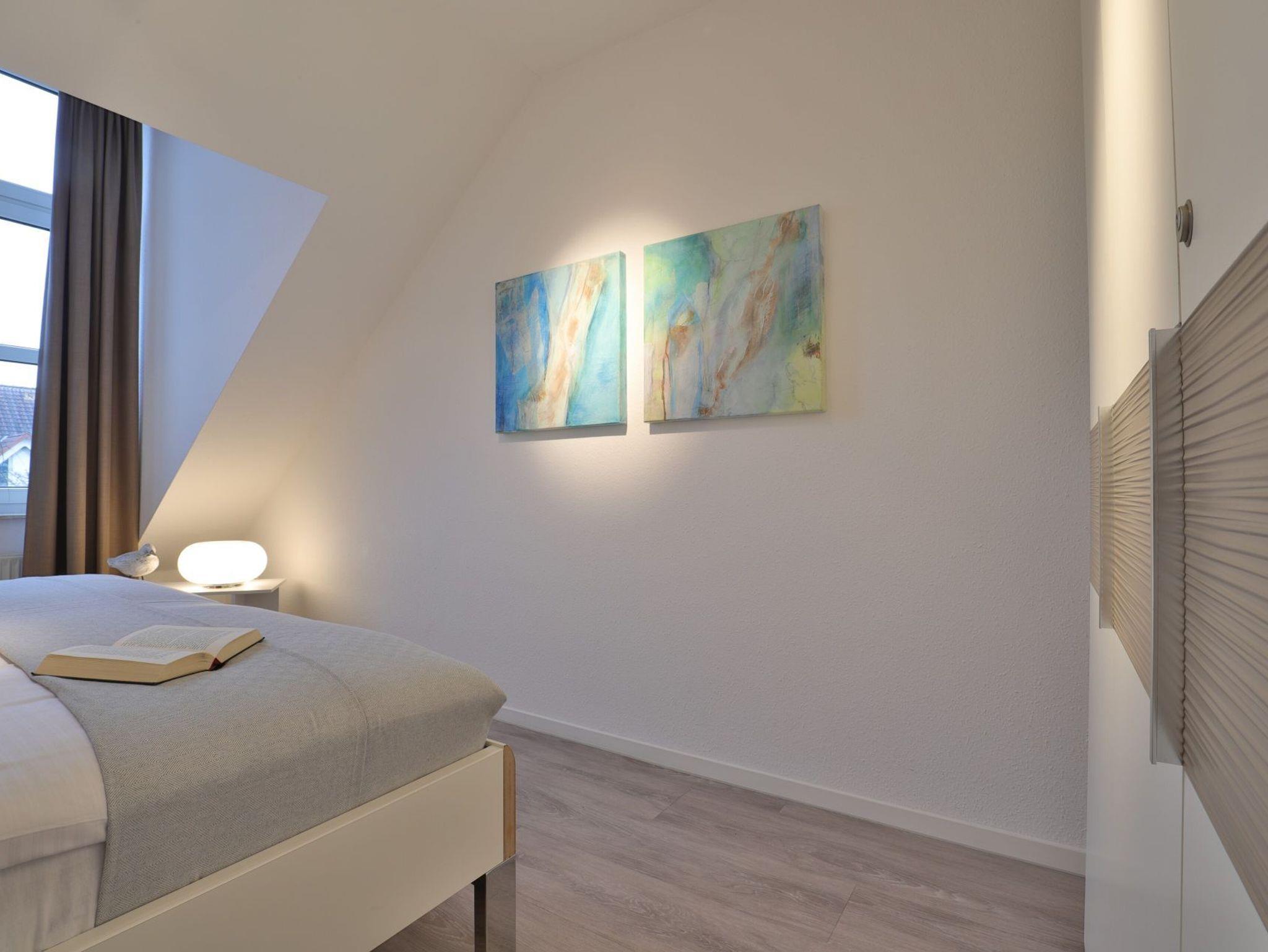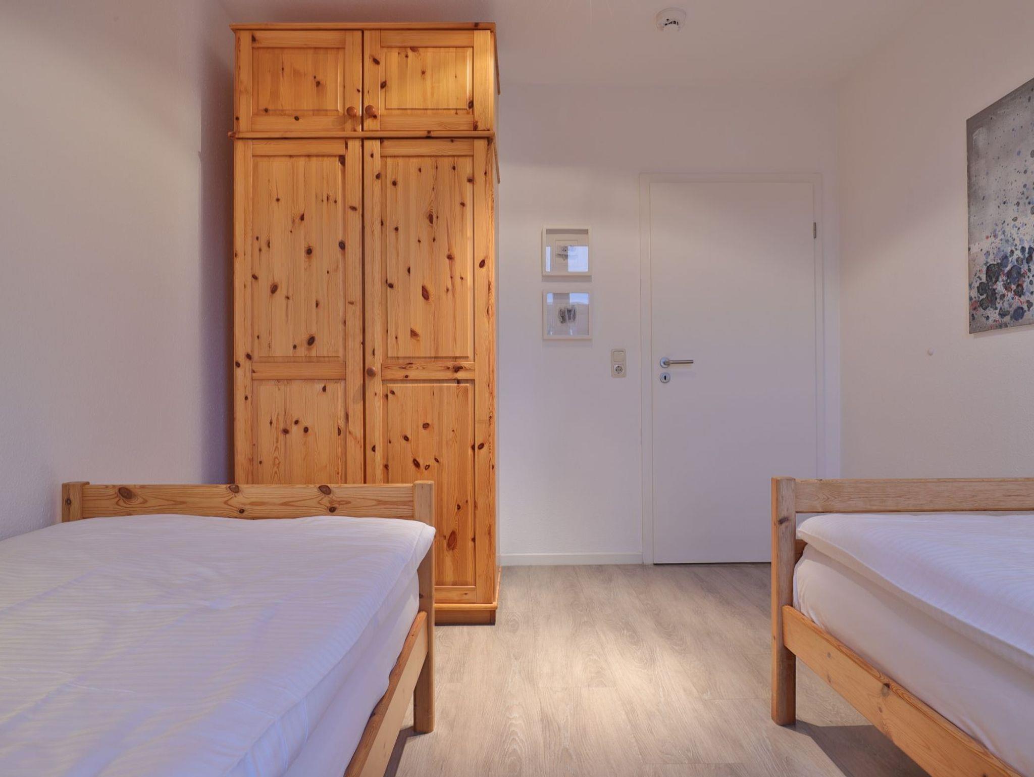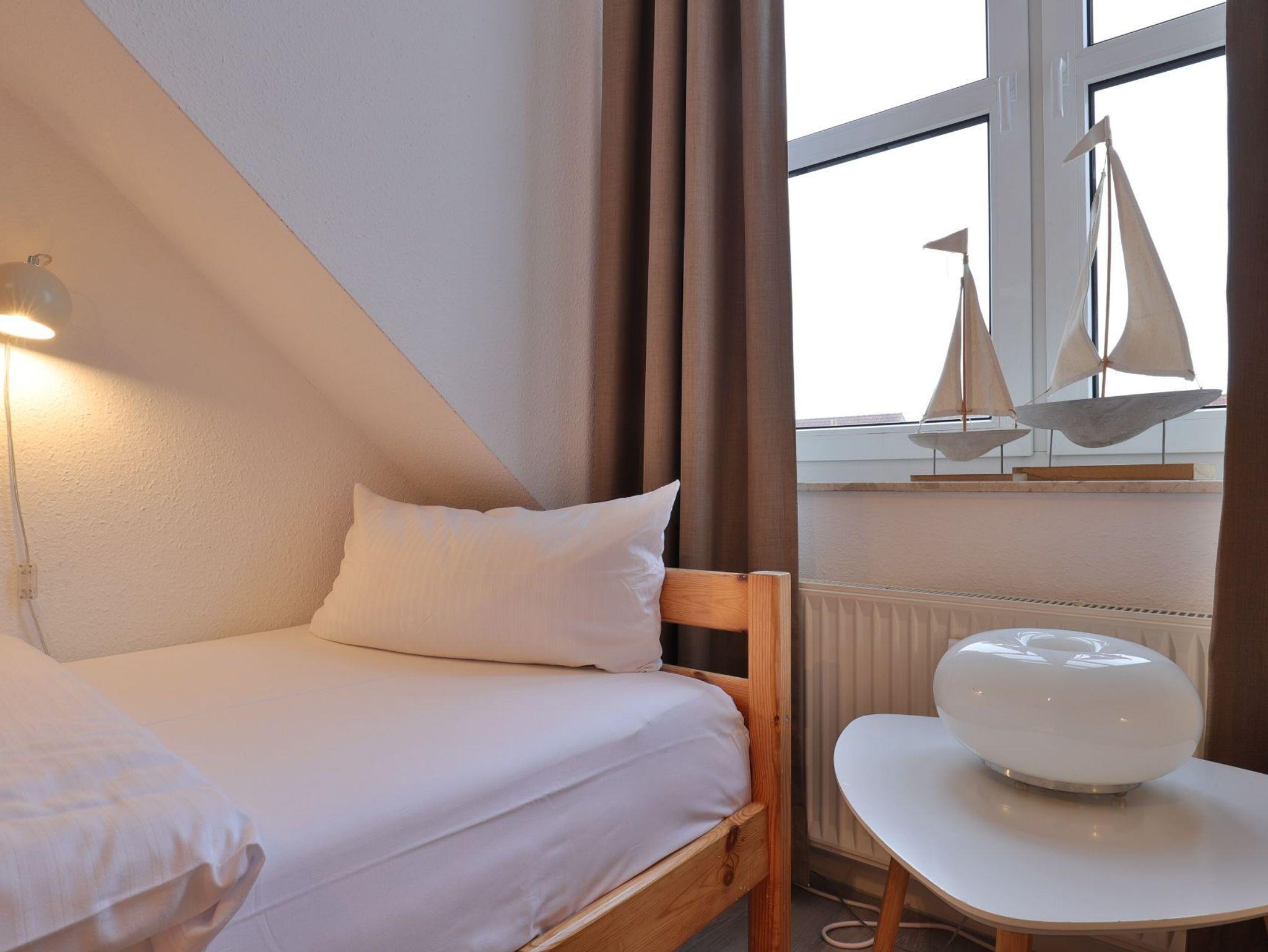 Nur 350 Meter vom Strand entfernt befindet sich die modernisierte 3-Zimmer-Ferienwohnung ? Sünnslag 13-59 -mit Balkon im Dachgeschoss einer gepflegten Ferienwohnanlage. Das hochwertig ausgestattete Appartement bietet auf ca. 63 qm Wohnfläche Platz für bis zu 4 Personen. Der helle Wohnbereich verfügt über ein bequemes Sofa, einen gemütlichen Ruhesessel sowie einen Esstisch für gemeinsame Mahlzeiten. Zur Unterhaltung stehen ein Flachbild-TV, DVD-Player, Musikanlage und kostenfreies WLAN zur Verfügung. Die separate Küche ist voll ausgestattet mit Cerankochfeld, Backofen, Mikrowelle, Kühlschrank, Geschirrspüler sowie Kaffeemaschine, Toaster und Wasserkocher. Zwei separate Schlafzimmer sorgen für erholsamen Schlaf: eines mit Doppelbett und Kleiderschrank, das zweite mit zwei Einzelbetten. Ein zweckmäßig ausgestattetes Duschbad ist vorhanden. Für kleine Kinder steht ein Reisebett im Appartement. Ebenso sind Bügeleisen und Bügelbrett vorhanden. Ein kostenfreier, reservierter PKW-Stellplatz befindet sich direkt am Haus. Nichtraucherwohnung, Haustiere sind nicht erlaubt. Zur Erleichterung des Reisegepäcks können Bettwäsche und Handtücher gegen Gebühr hinzugebucht werden; die Wäschepakete erhalten Sie bei Anreise im Büro.