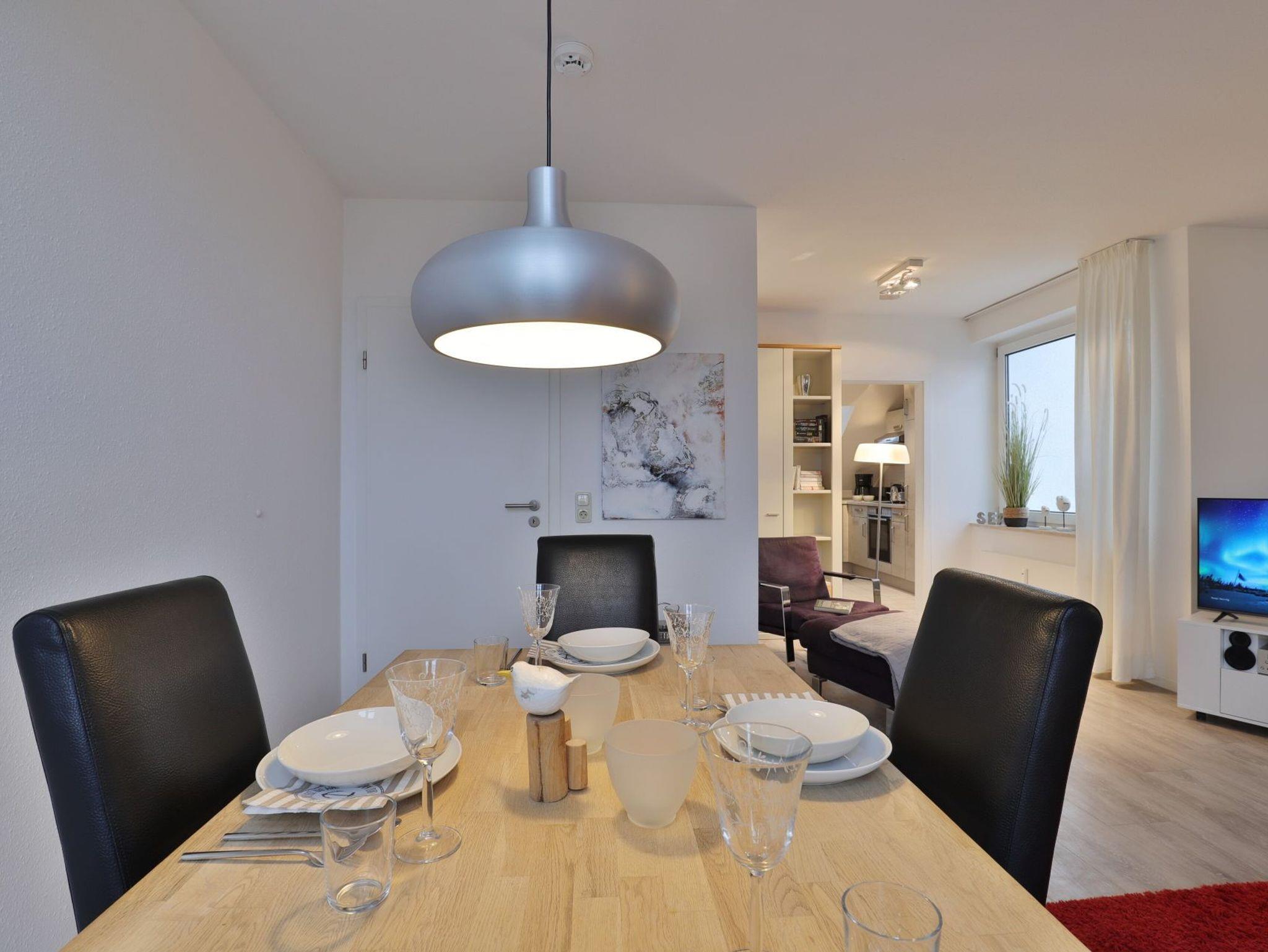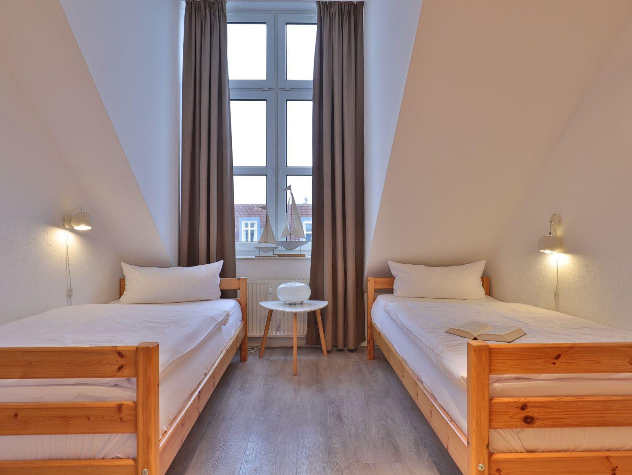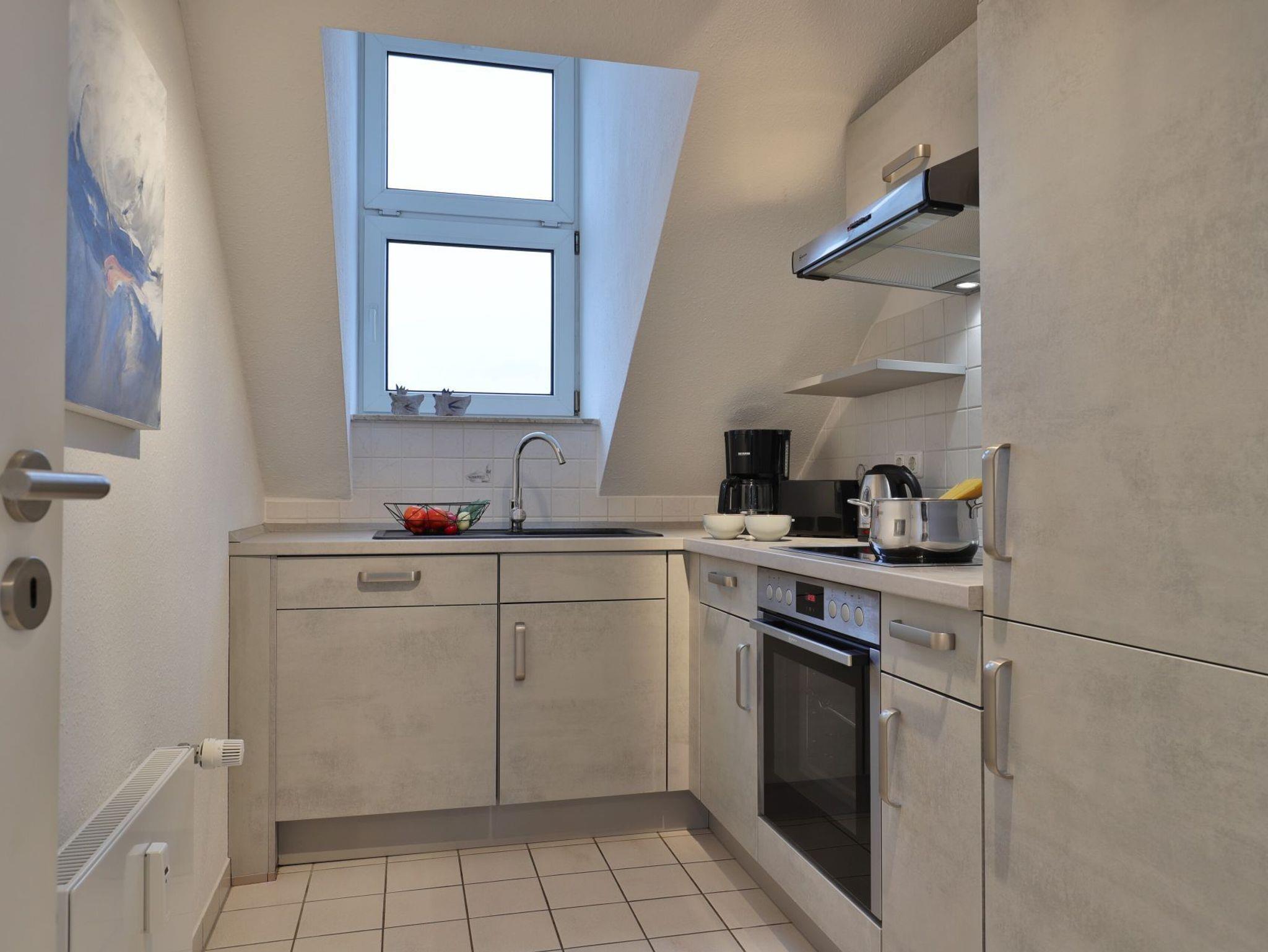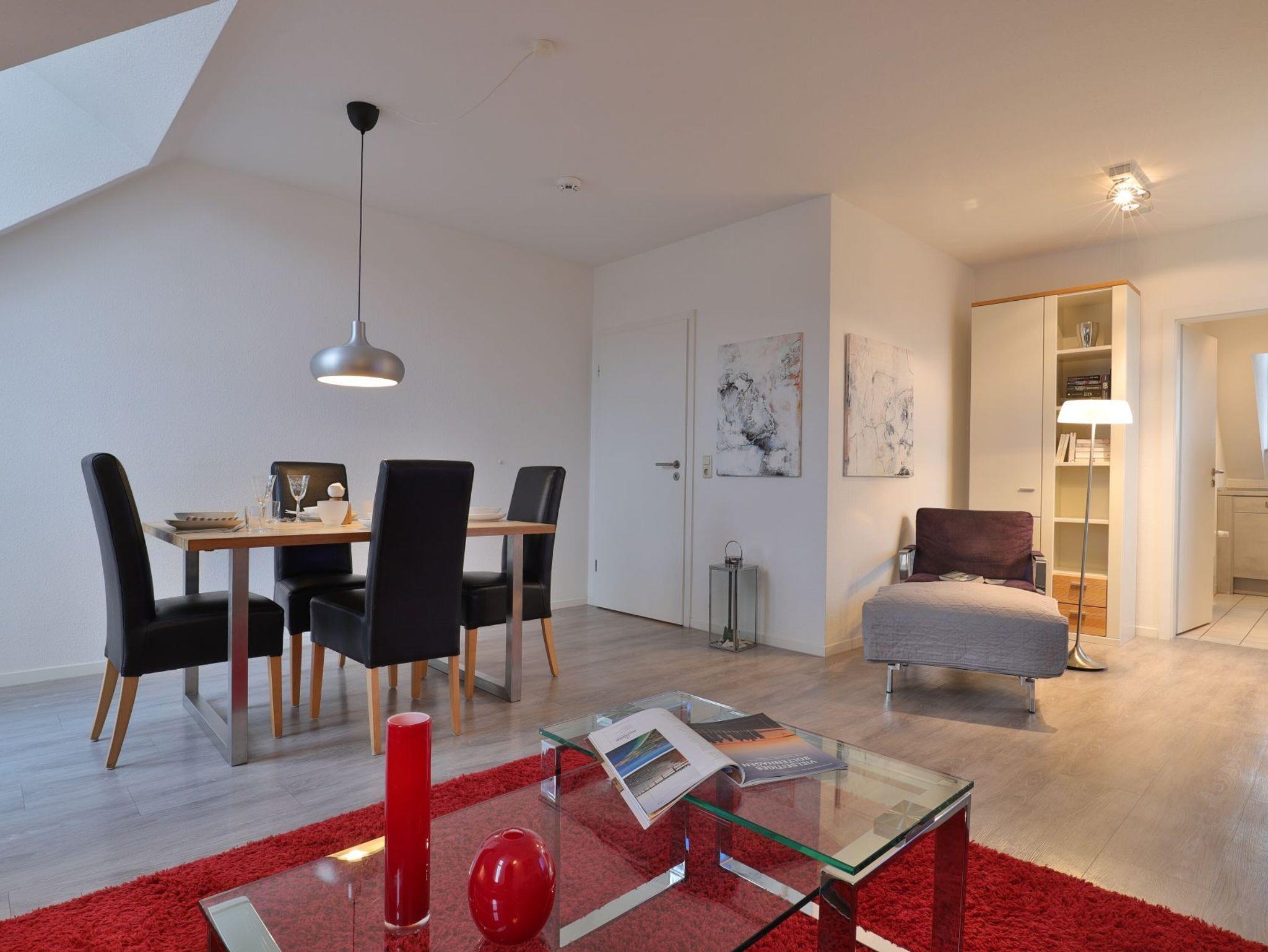 Nur 350 Meter vom Strand entfernt befindet sich die modernisierte 3-Zimmer-Ferienwohnung ? Sünnslag 13-59 -mit Balkon im Dachgeschoss einer gepflegten Ferienwohnanlage. Das hochwertig ausgestattete Appartement bietet auf ca. 63 qm Wohnfläche Platz für bis zu 4 Personen. Der helle Wohnbereich verfügt über ein bequemes Sofa, einen gemütlichen Ruhesessel sowie einen Esstisch für gemeinsame Mahlzeiten. Zur Unterhaltung stehen ein Flachbild-TV, DVD-Player, Musikanlage und kostenfreies WLAN zur Verfügung. Die separate Küche ist voll ausgestattet mit Cerankochfeld, Backofen, Mikrowelle, Kühlschrank, Geschirrspüler sowie Kaffeemaschine, Toaster und Wasserkocher. Zwei separate Schlafzimmer sorgen für erholsamen Schlaf: eines mit Doppelbett und Kleiderschrank, das zweite mit zwei Einzelbetten. Ein zweckmäßig ausgestattetes Duschbad ist vorhanden. Für kleine Kinder steht ein Reisebett im Appartement. Ebenso sind Bügeleisen und Bügelbrett vorhanden. Ein kostenfreier, reservierter PKW-Stellplatz befindet sich direkt am Haus. Nichtraucherwohnung, Haustiere sind nicht erlaubt. Zur Erleichterung des Reisegepäcks können Bettwäsche und Handtücher gegen Gebühr hinzugebucht werden; die Wäschepakete erhalten Sie bei Anreise im Büro.