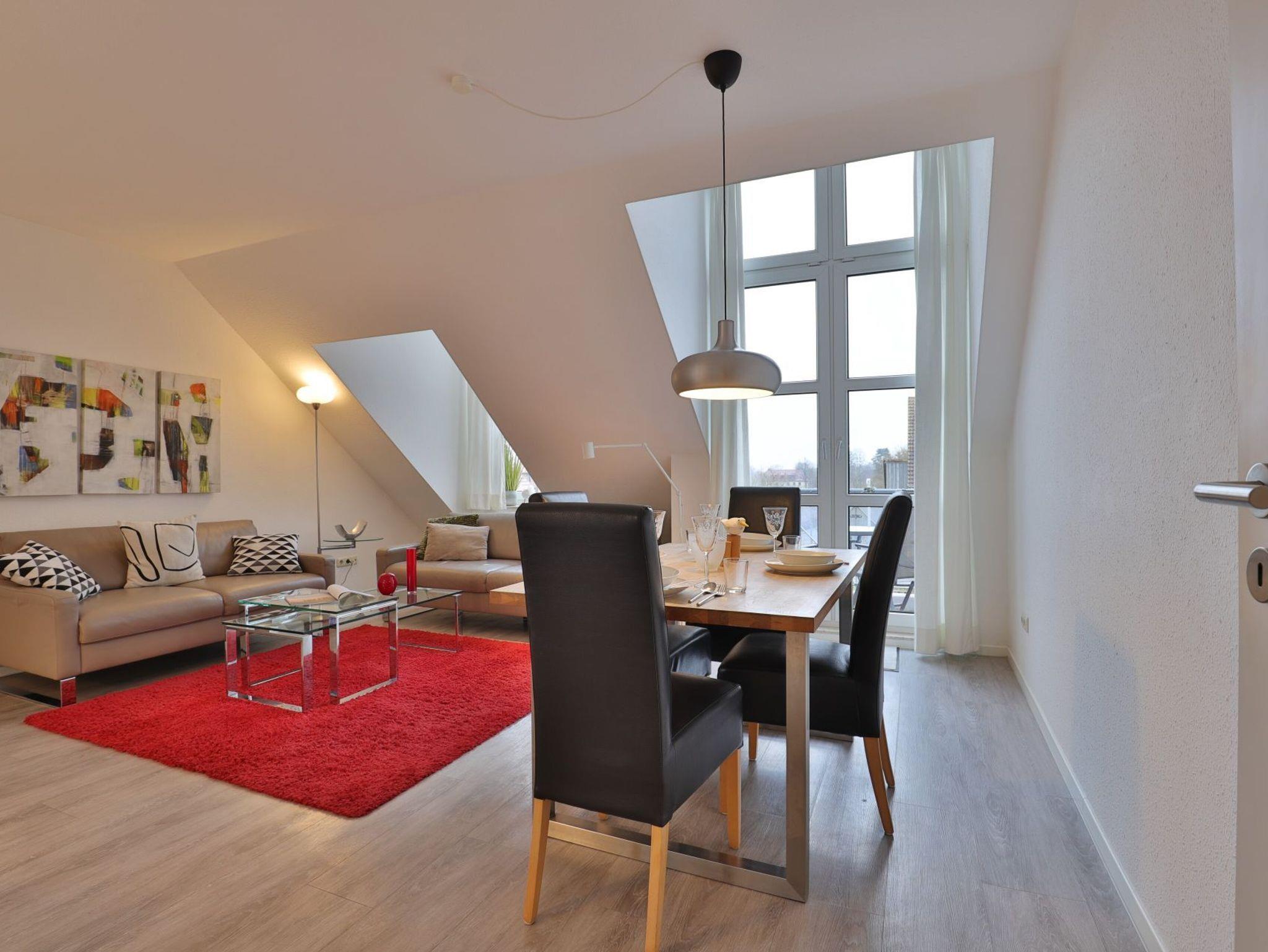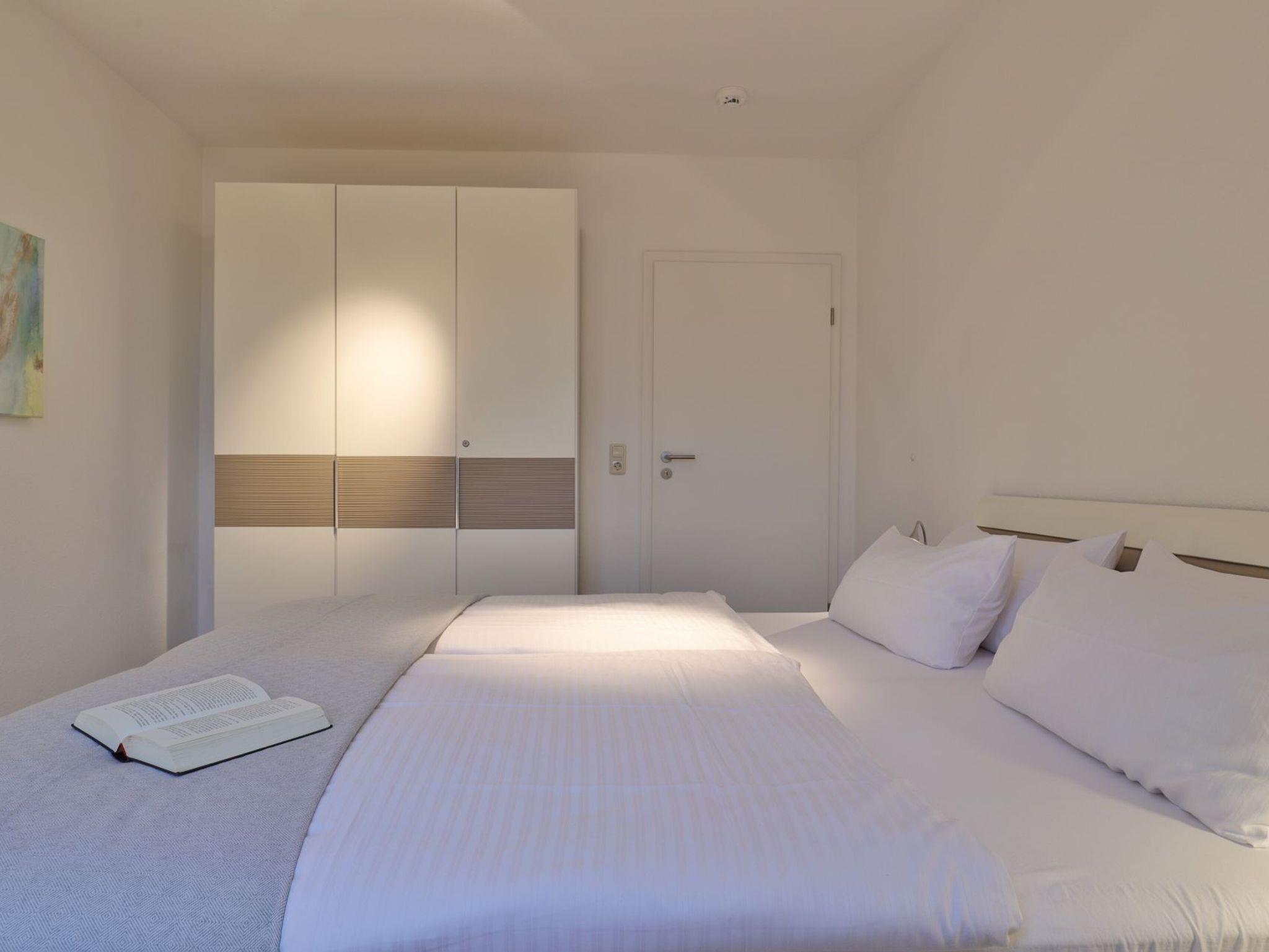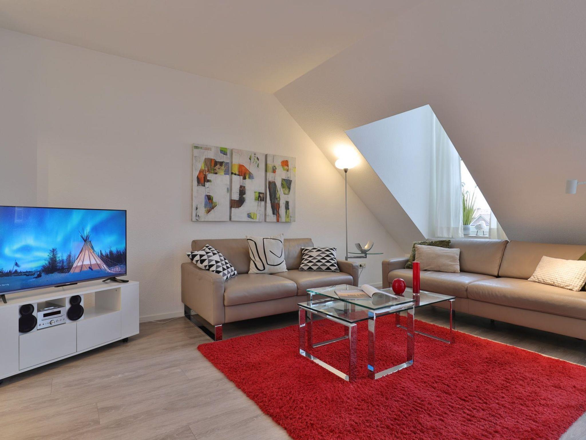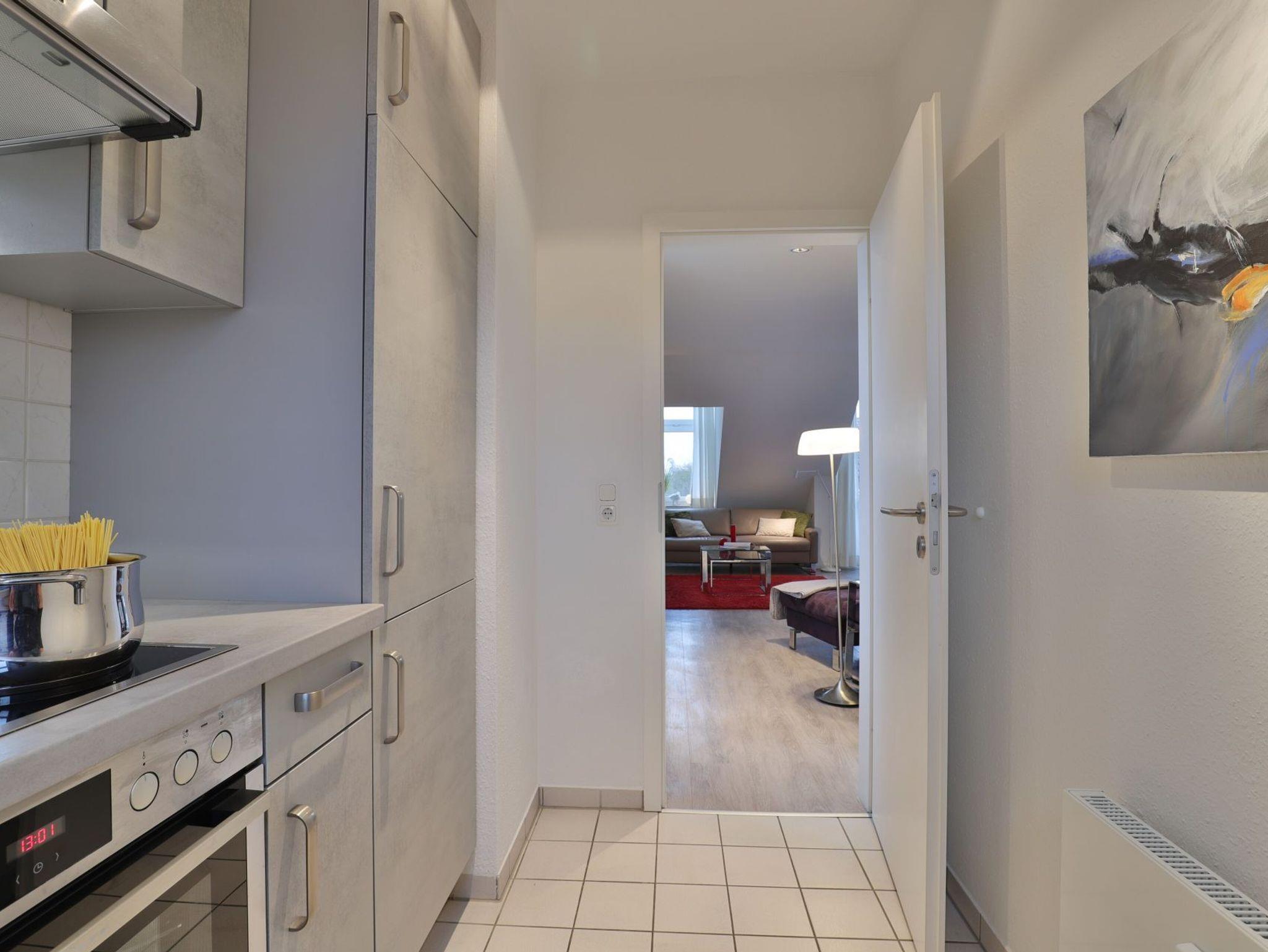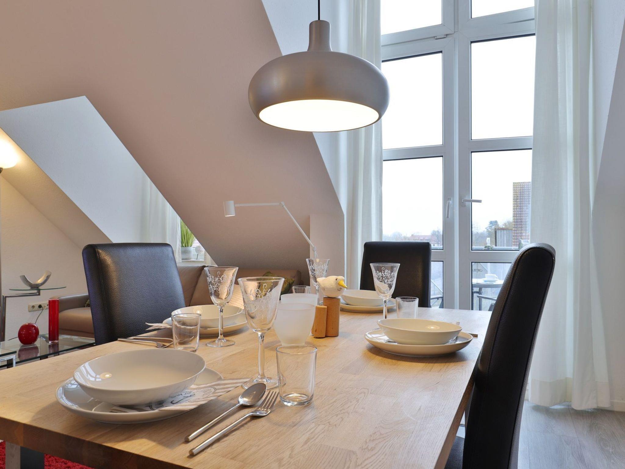 Nur 350 Meter vom Strand entfernt befindet sich die modernisierte 3-Zimmer-Ferienwohnung ? Sünnslag 13-59 -mit Balkon im Dachgeschoss einer gepflegten Ferienwohnanlage. Das hochwertig ausgestattete Appartement bietet auf ca. 63 qm Wohnfläche Platz für bis zu 4 Personen. Der helle Wohnbereich verfügt über ein bequemes Sofa, einen gemütlichen Ruhesessel sowie einen Esstisch für gemeinsame Mahlzeiten. Zur Unterhaltung stehen ein Flachbild-TV, DVD-Player, Musikanlage und kostenfreies WLAN zur Verfügung. Die separate Küche ist voll ausgestattet mit Cerankochfeld, Backofen, Mikrowelle, Kühlschrank, Geschirrspüler sowie Kaffeemaschine, Toaster und Wasserkocher. Zwei separate Schlafzimmer sorgen für erholsamen Schlaf: eines mit Doppelbett und Kleiderschrank, das zweite mit zwei Einzelbetten. Ein zweckmäßig ausgestattetes Duschbad ist vorhanden. Für kleine Kinder steht ein Reisebett im Appartement. Ebenso sind Bügeleisen und Bügelbrett vorhanden. Ein kostenfreier, reservierter PKW-Stellplatz befindet sich direkt am Haus. Nichtraucherwohnung, Haustiere sind nicht erlaubt. Zur Erleichterung des Reisegepäcks können Bettwäsche und Handtücher gegen Gebühr hinzugebucht werden; die Wäschepakete erhalten Sie bei Anreise im Büro.