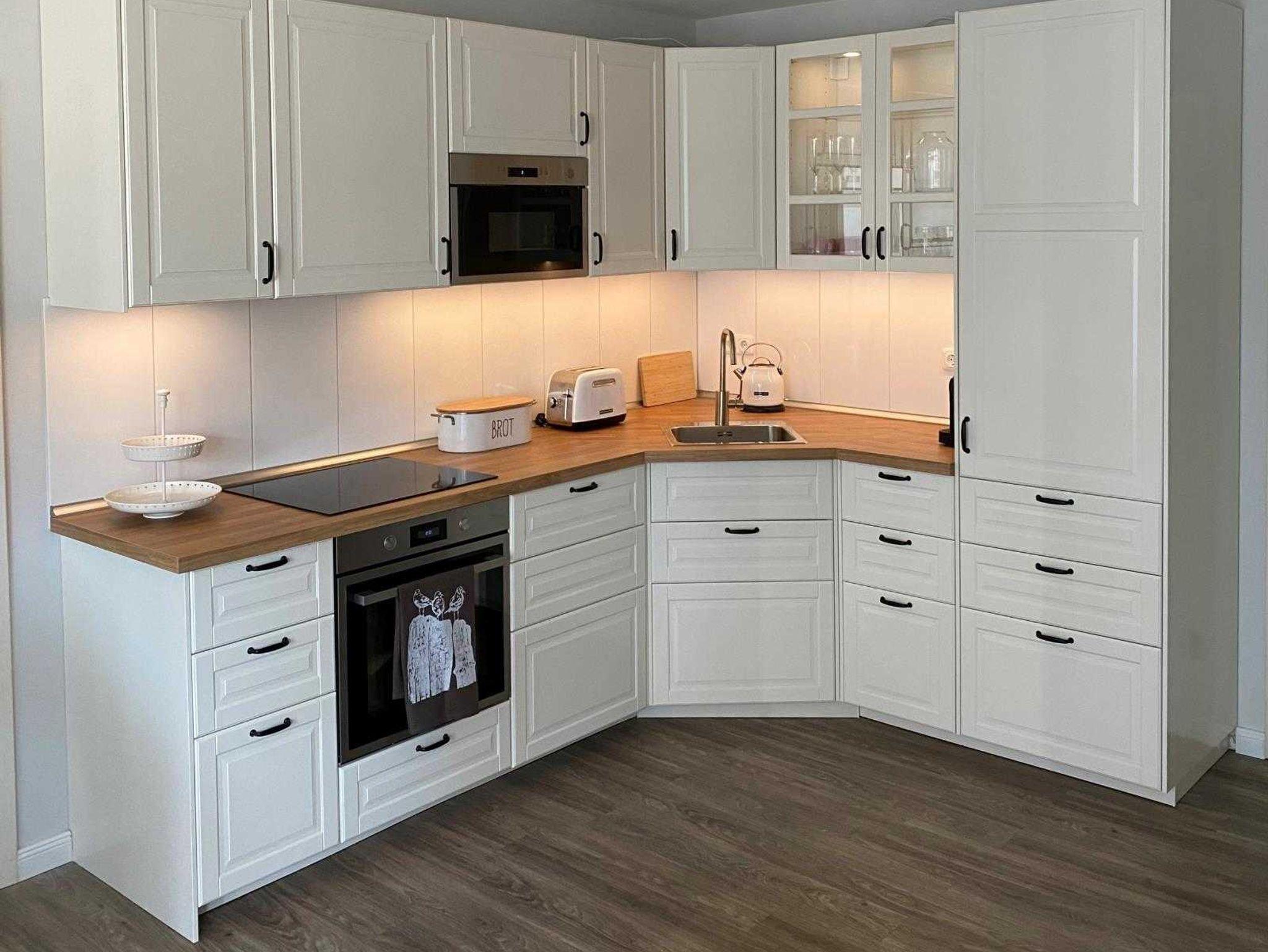 Eine moderne und komplett ausgestattete Küche mit Backofen, Ceran-Kochfeld, Mikrowelle, Geschirrspüler,