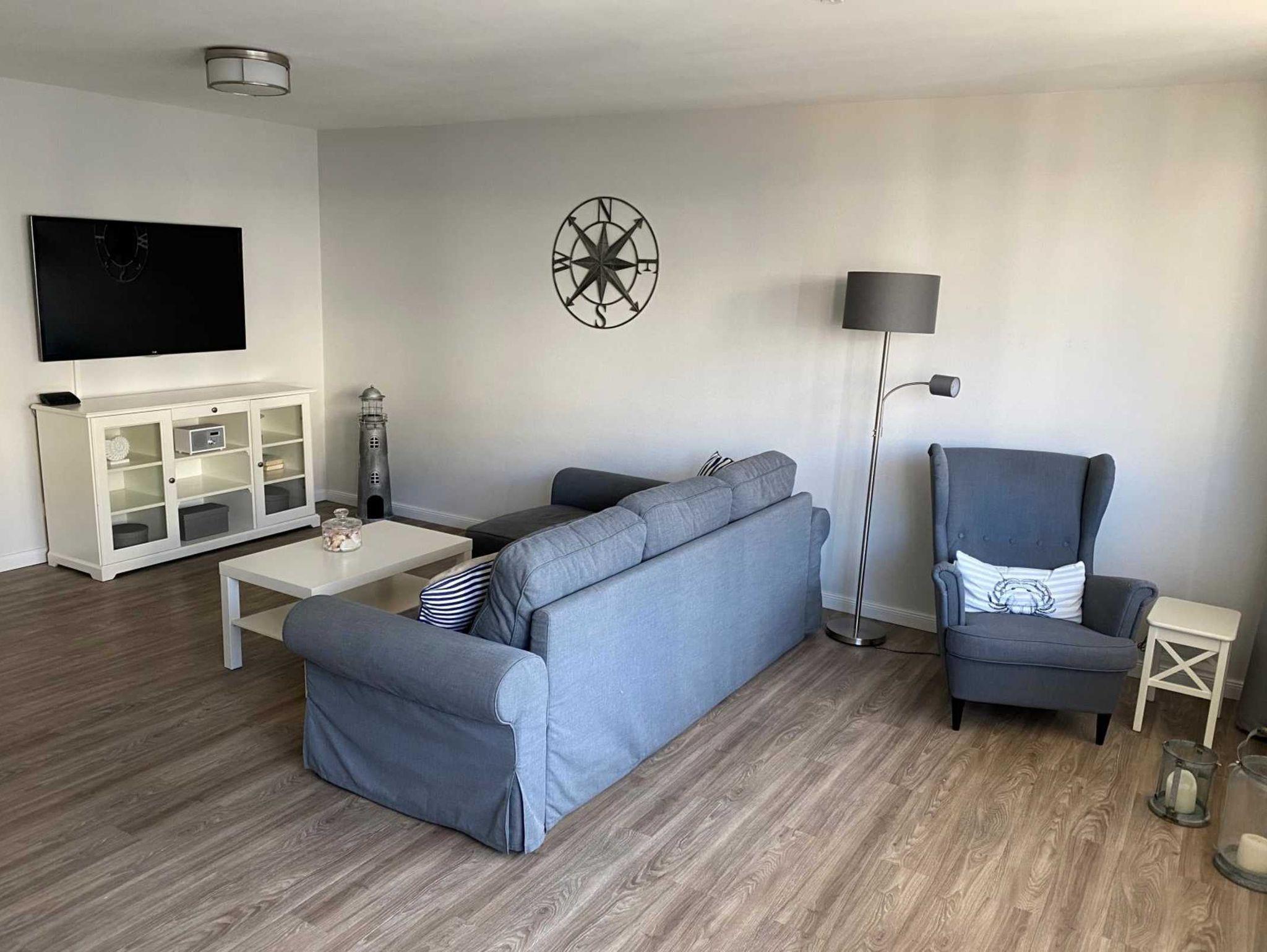 Im Wohnbereich mit maritimem Flair erwartet Sie eine gemütliche Eckcouch mit Schlaffunktion und ein