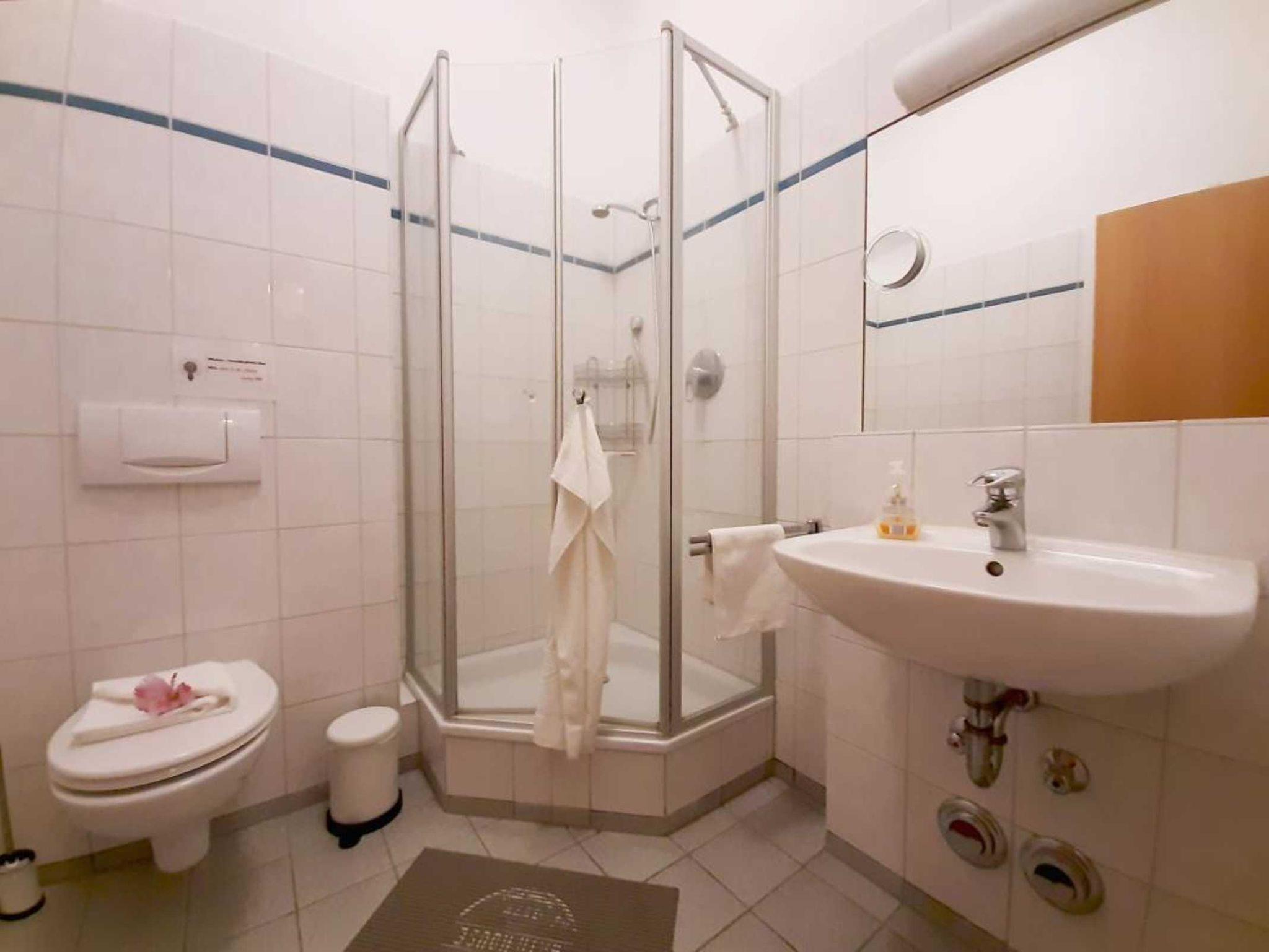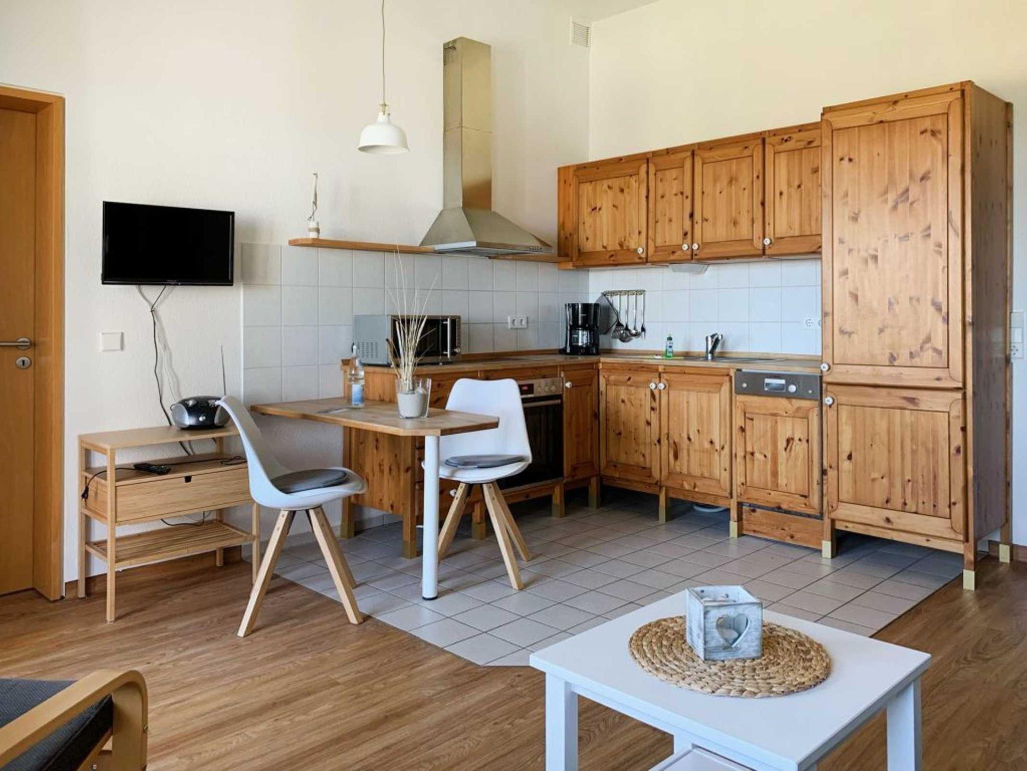 Es empfängt Sie ein komfortables 2-Zimmer Hochparterre Appartement mit einem separaten Schlafzimmer. Mit einer großzügigen Wohnfläche von 56qm bietet die Wohnung genügend Platz für bis zu 3 Personen. Im behaglichen Wohn-Essbereich mit Schlafsofa, Fernseher, Musikanlage, WLAN, ist die Wohnküche integriert und mit Ceranherd, Geschirrspüler, Mikrowelle, Backofen, Kühlschrank mit integr. Gefrierfach, Toaster, Wasserkocher und Kaffeemaschine ausgestattet. Somit ist eine bequeme Selbstversorgung auch während des Urlaubs möglich. Ein kleiner Esstisch lädt zu gemeinsamen Mahlzeiten ein. Erholung finden Sie auf dem saisonal möblierten Balkon in nord-ost Ausrichtung. Das Wohlfühlschlafzimmer ist mit Doppelbett, Kleiderschrank, Kommode eingerichtet. Ein hell gefliestes Duschbad mit Waschtisch, Fön, WC ist zugehörig. Ein Bügeleisen steht zur Verfügung. Bitte beachten Sie, dass Haustiere und Rauchen nicht gestattet sind.