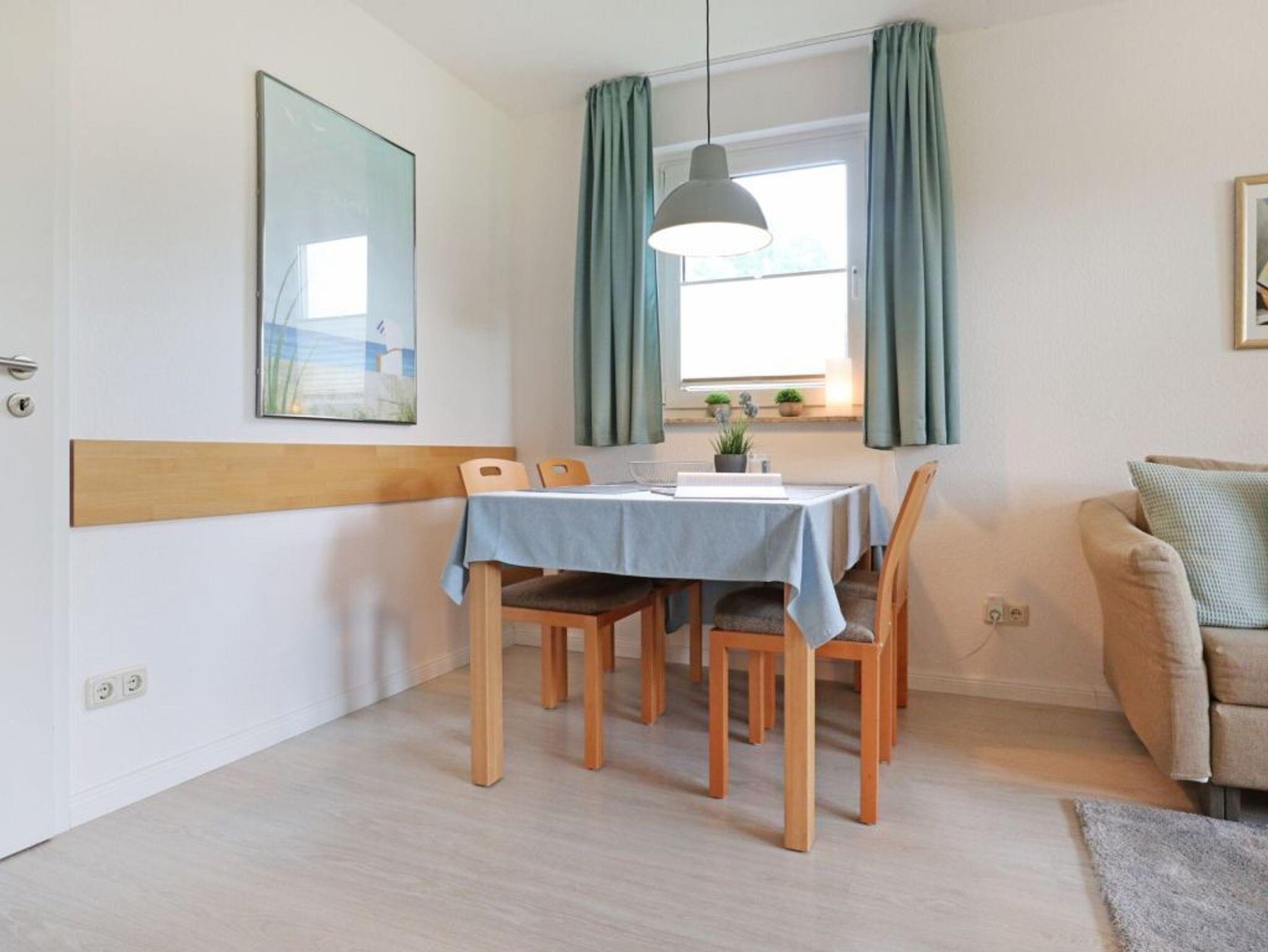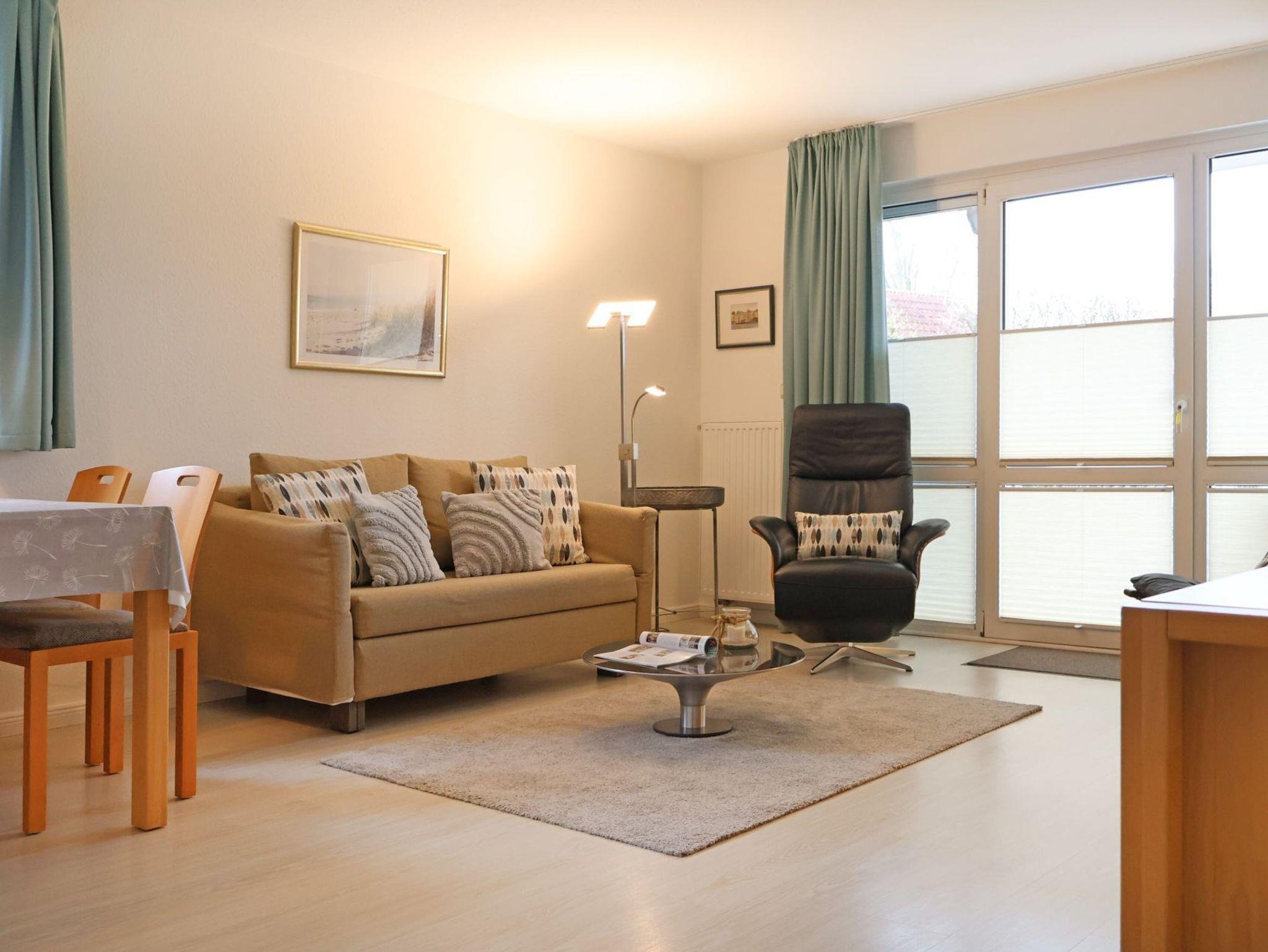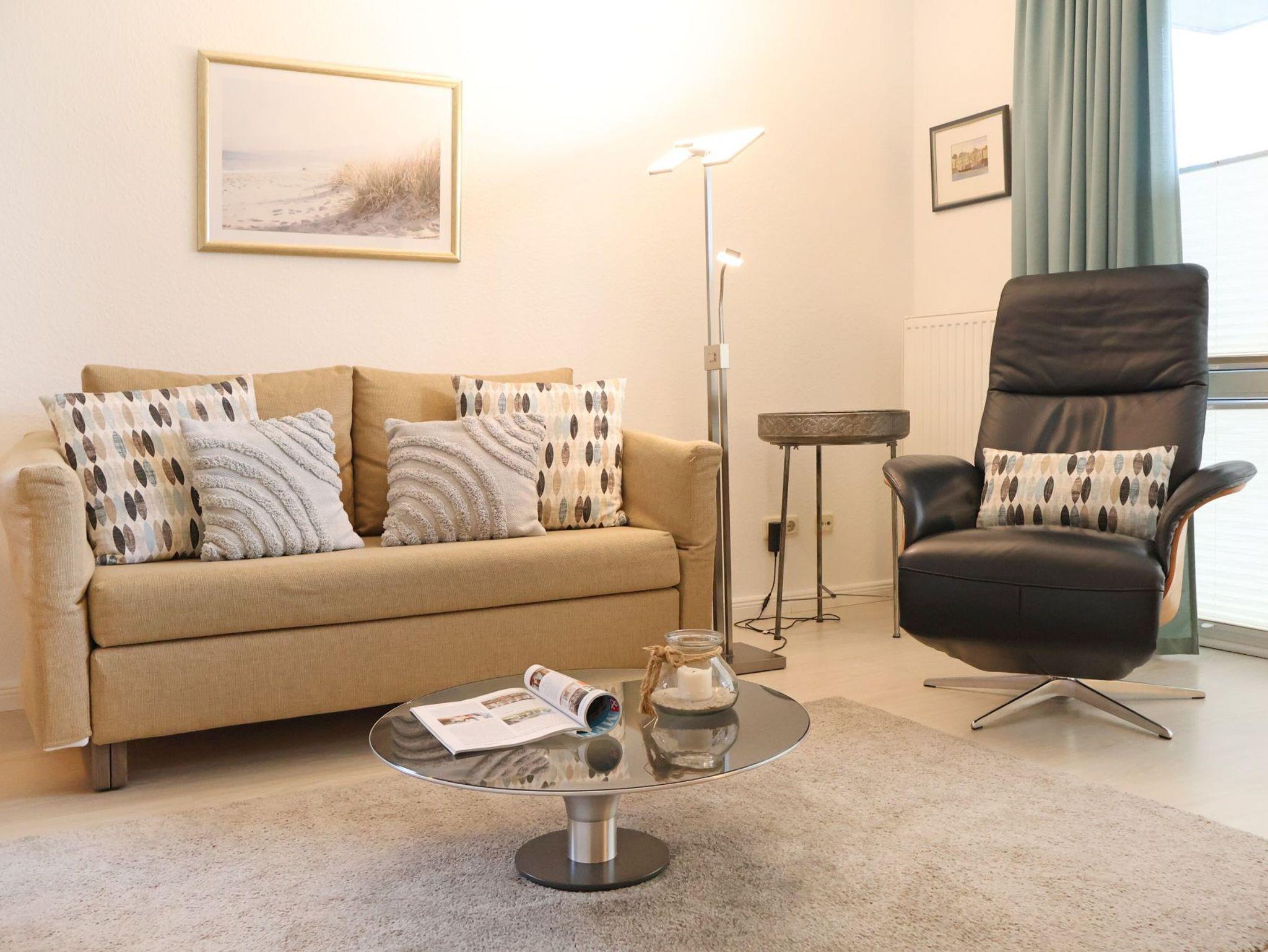 Das insgesamt hochwertig ausgestattete Apartment mit Terrasse in Süd Richtung, auf der sich während der Saison ein Strandkorb sowie weitere Möblierung befinden, ist für 2 Personen buchbar und verfügt über eine gut aufgeteilte Wohnfläche von 55qm. Sehr geschmackvoll empfängt Sie das helle Wohnzimmer mit einem bequemen Sofa, Ruhe-/Lesesessel, Schrankwand, Flachbild -Fernseher, DVD, Musikanlage, Esstisch mit 4 Sitzplätzen. Kostenfrei können sie den Internetzugang über WLAN nutzen. Die Küche befindet sich separat und ist komfortabel ausgestattet mit Cerankochfeld, Backofen, Mikrowelle, Geschirrspüler, Kaffeemaschine, Toaster, Wasserkocher ausreichend Geschirr, Töpfe u.s.w.