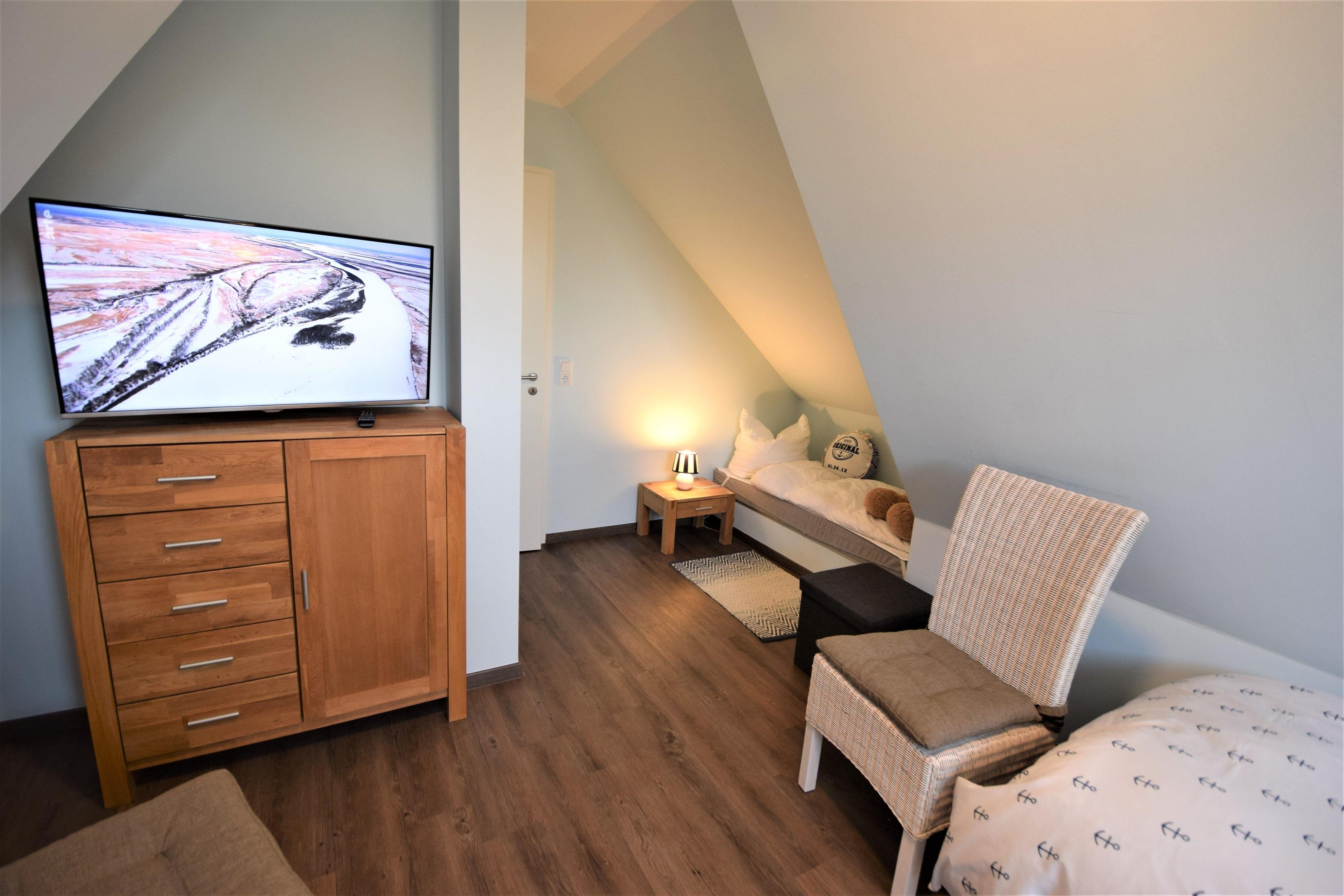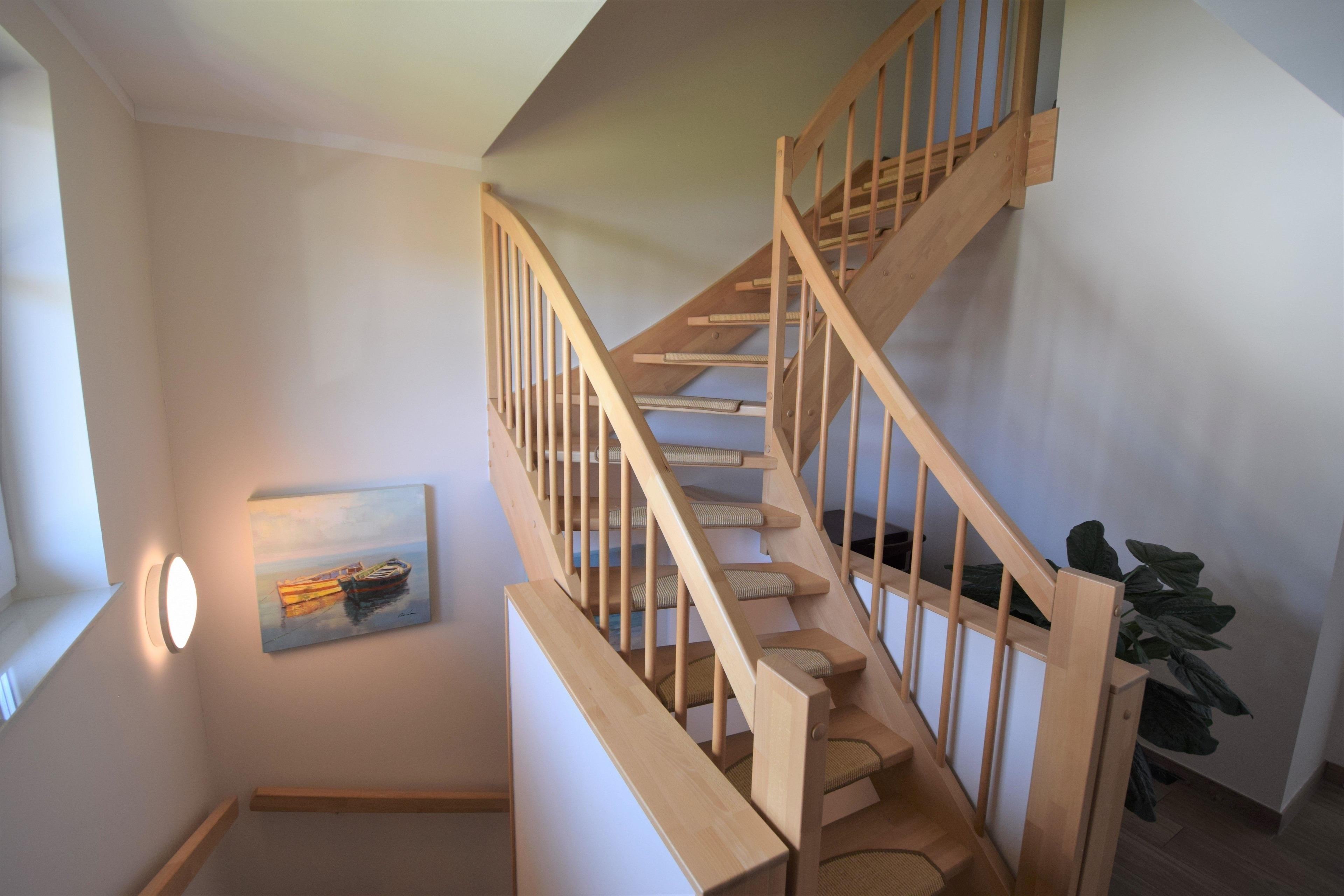 Das Ferienhaus bietet Platz auf 3 Etagen. Im Erdgeschoss befindet sich die geräumige Küche mit Essecke sowie dem Wohnbereich, außerdem das Bad mit Dusche. Im Obergeschoss sind 2 Schlafzimmer, jeweils mit Doppelbetten sowie das Bad mit Bade- bzw. Duschwanne und der Abstellraum mit Waschmaschine und Trockner. Im Dachgeschoss ist ein weiterer Schlafraum mit 2 Einzelbetten sowie der Schlafmöglichkeit (Achtung: nur 1,80 m x 0,75 m) für eine weitere Person sowie ein kleiner Abstellraum