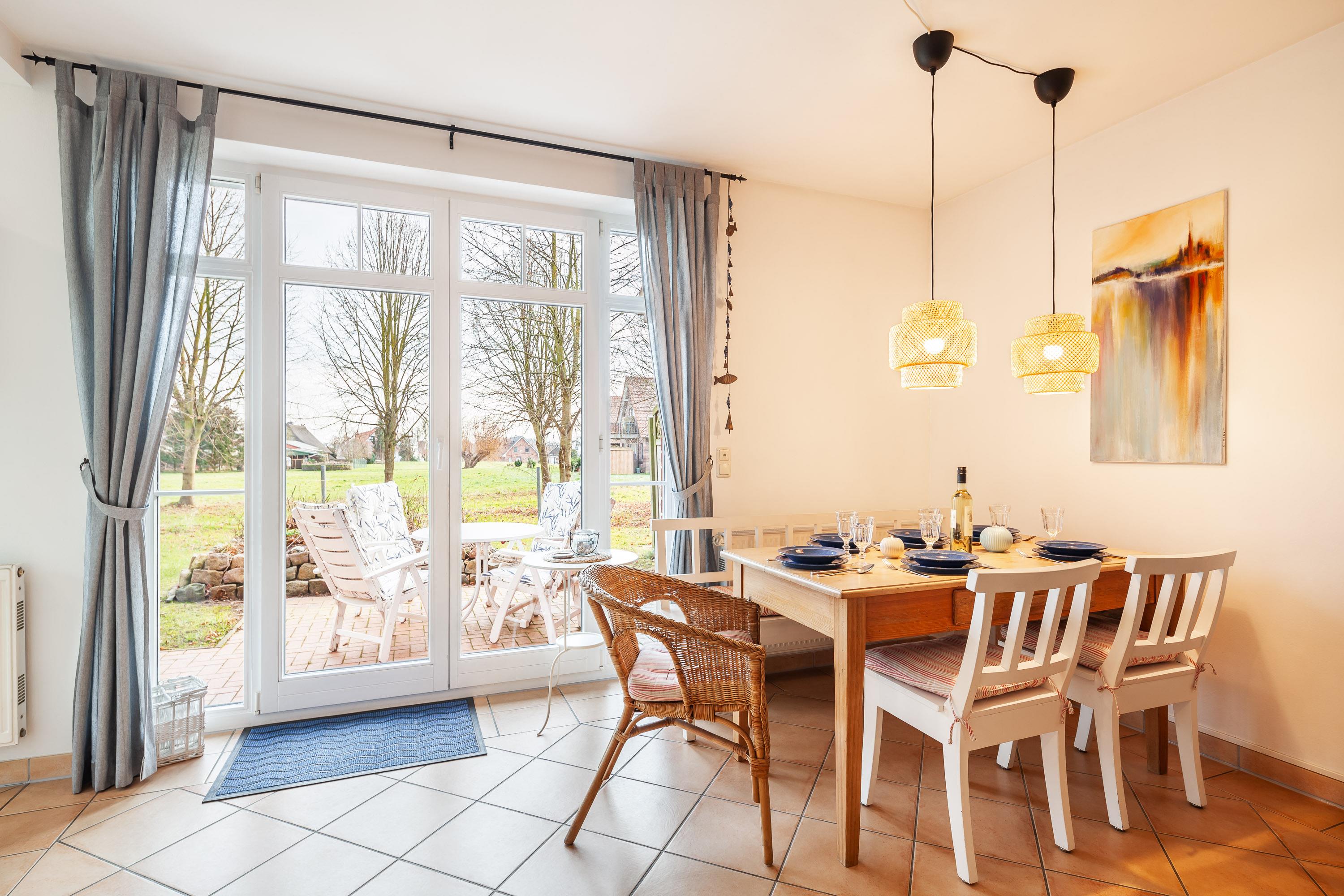 Ein schönes helles und offenes Wohn-und Esszimmer mit Zugang zur sonnigen Terrasse und Blick auf eine idyllischen Wiese sorgt für Urlaubsgenuss pur.