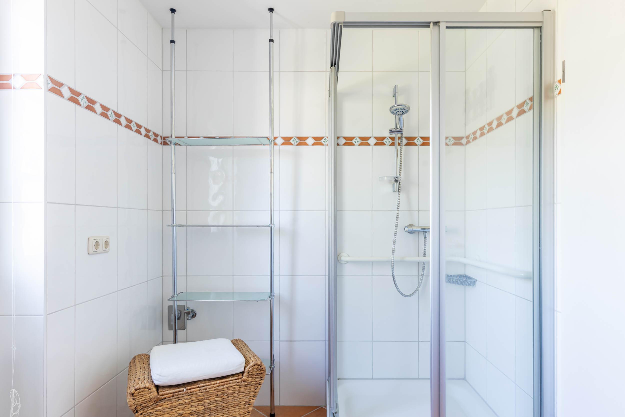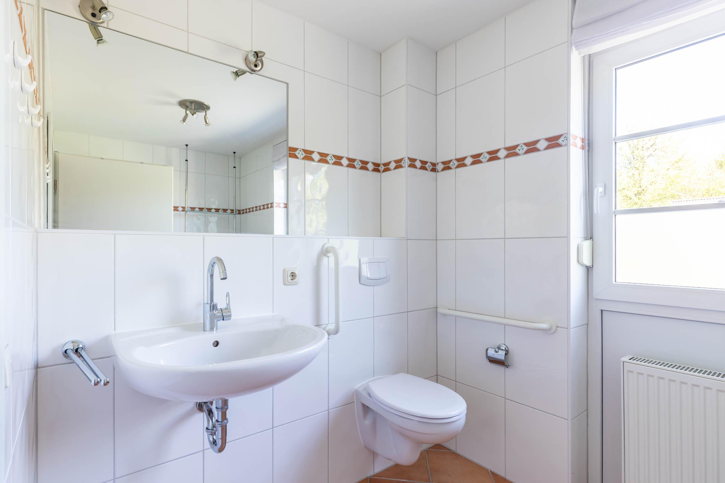 Auf dieser Etage befindet sich das zweite, etwas größere Badezimmer, welches ebenfalls mit Dusche und WC ausgestattet ist. Ebenso wie im Erdgeschoss gibt es auch in diesem Bad ein Fenster.