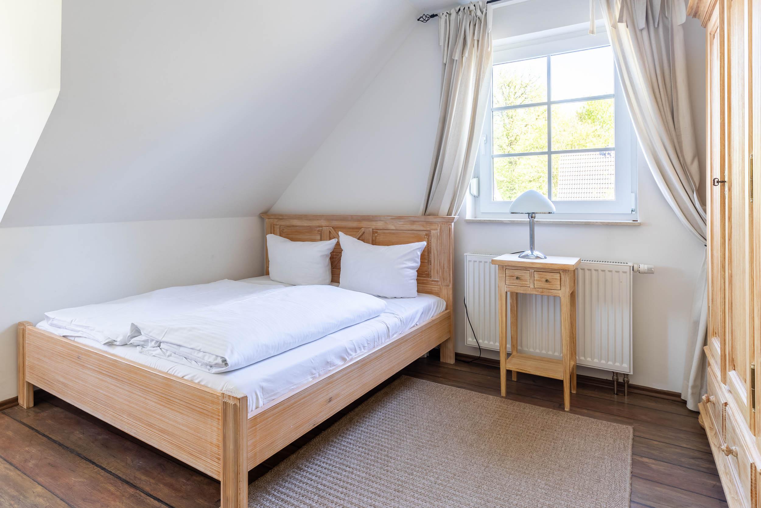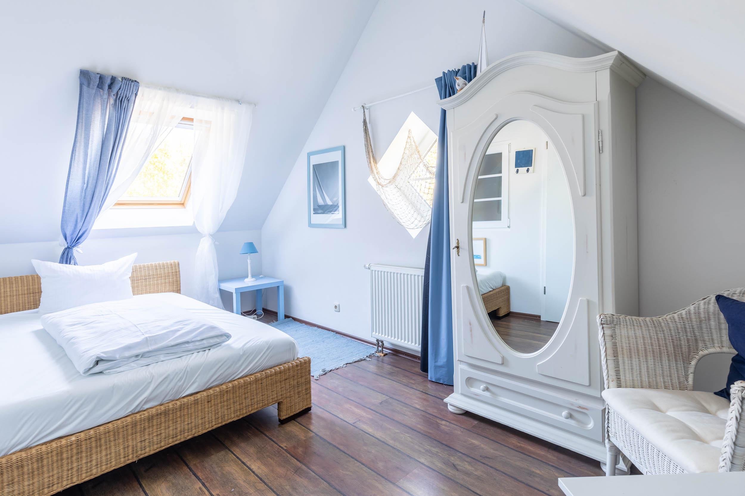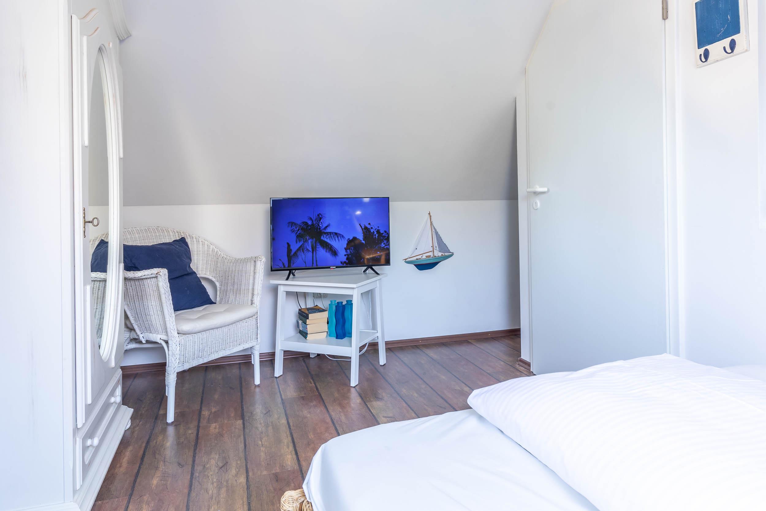 Das vierte Schlafzimmer liegt im Dachgeschoss, es ist mit einem französischen Doppelbett (140x200cm), einem kleinen Kleiderschrank sowie SAT-TV ausgestattet.