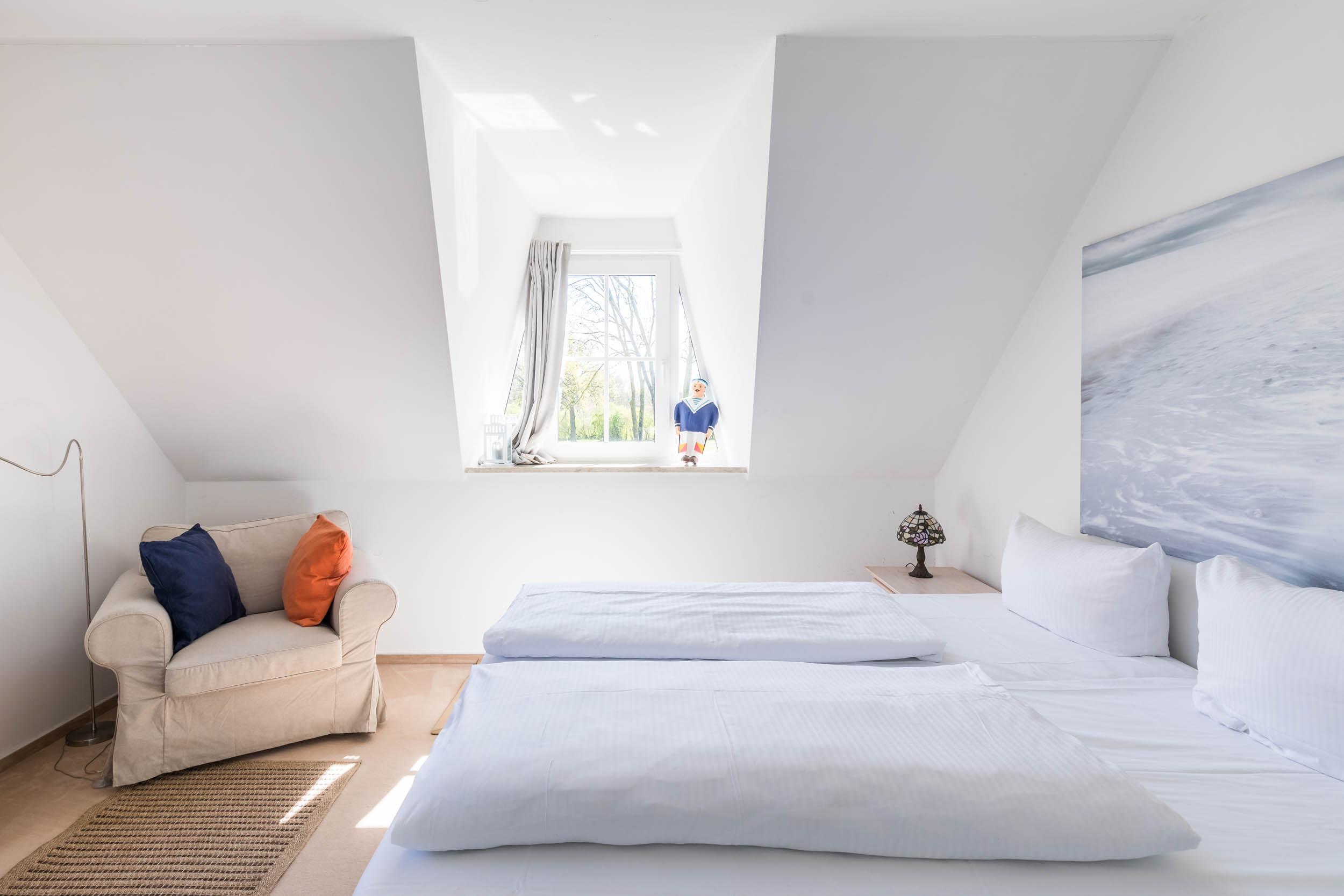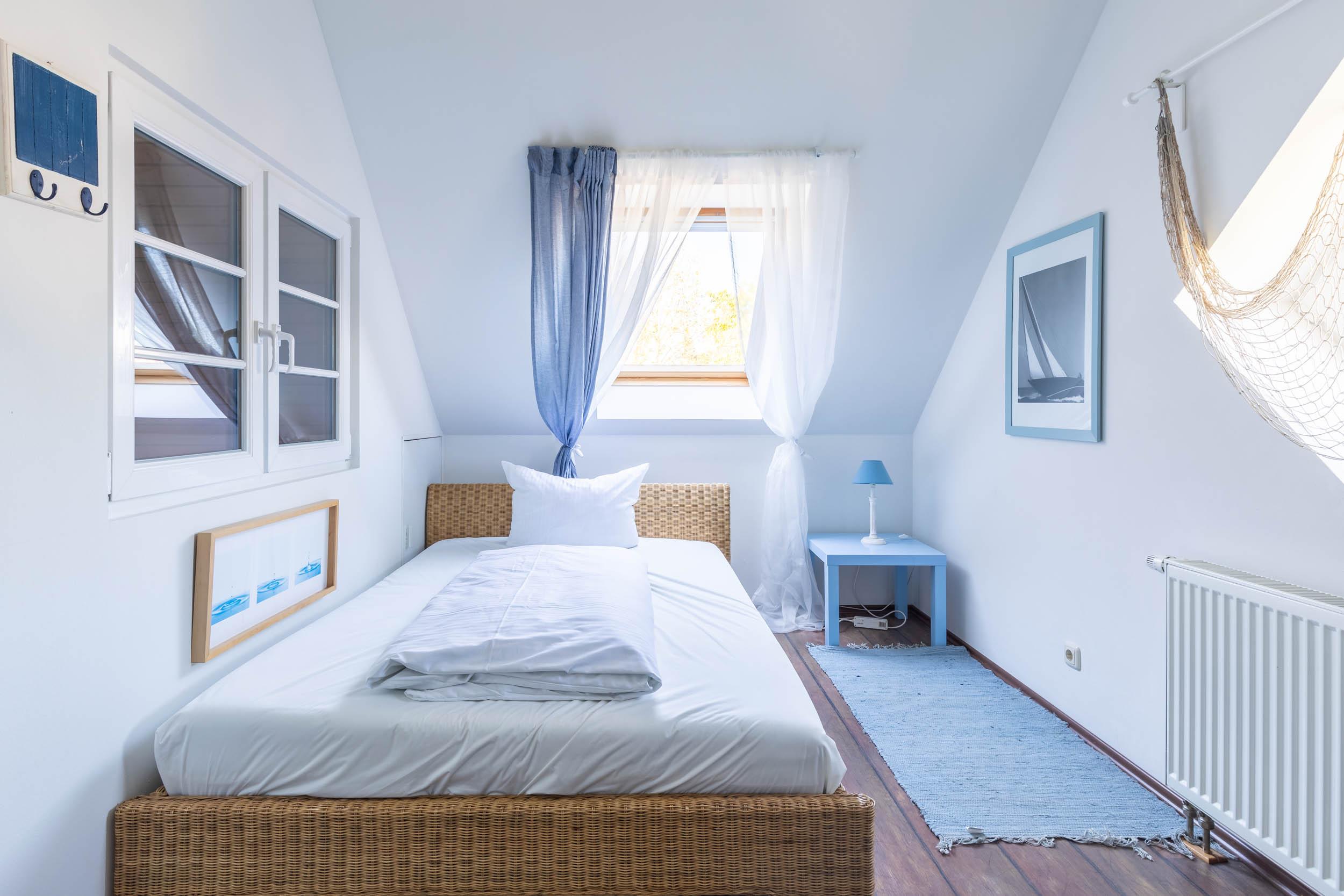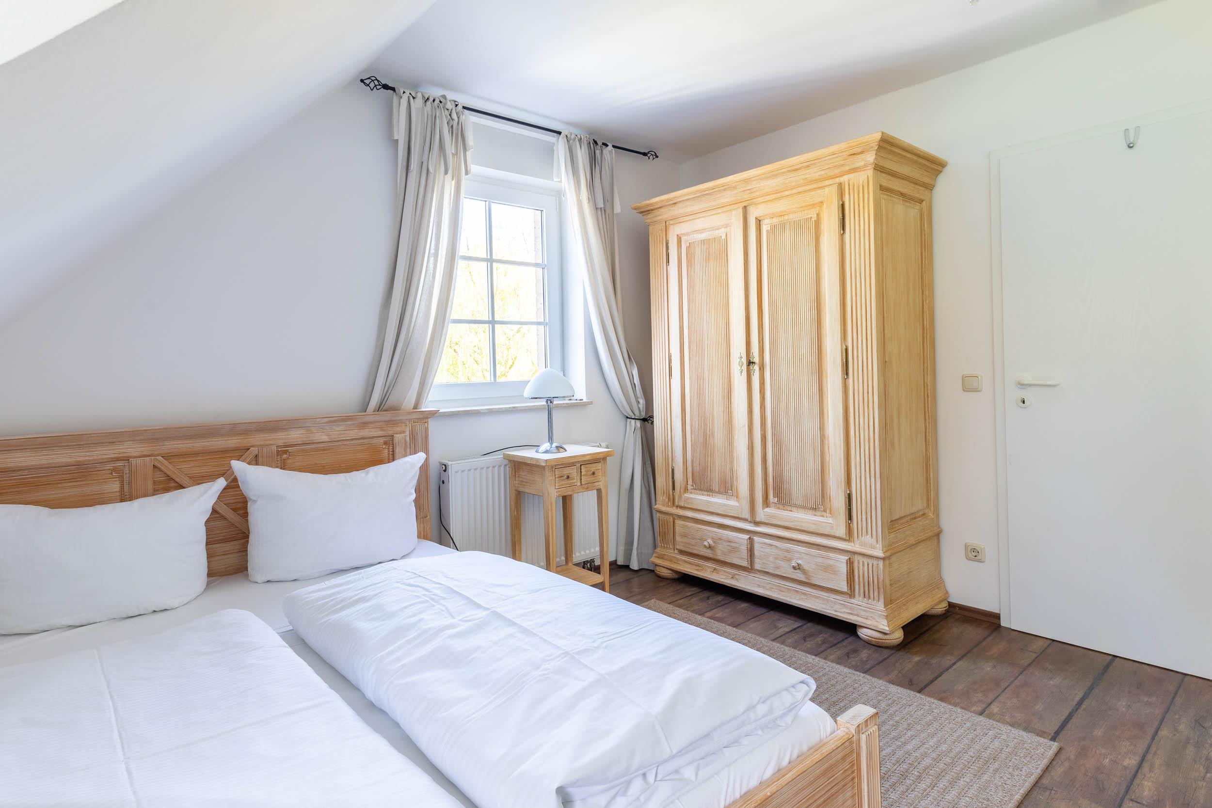Das vierte Schlafzimmer liegt im Dachgeschoss, es ist mit einem französischen Doppelbett (140x200cm), einem kleinen Kleiderschrank sowie SAT-TV ausgestattet.