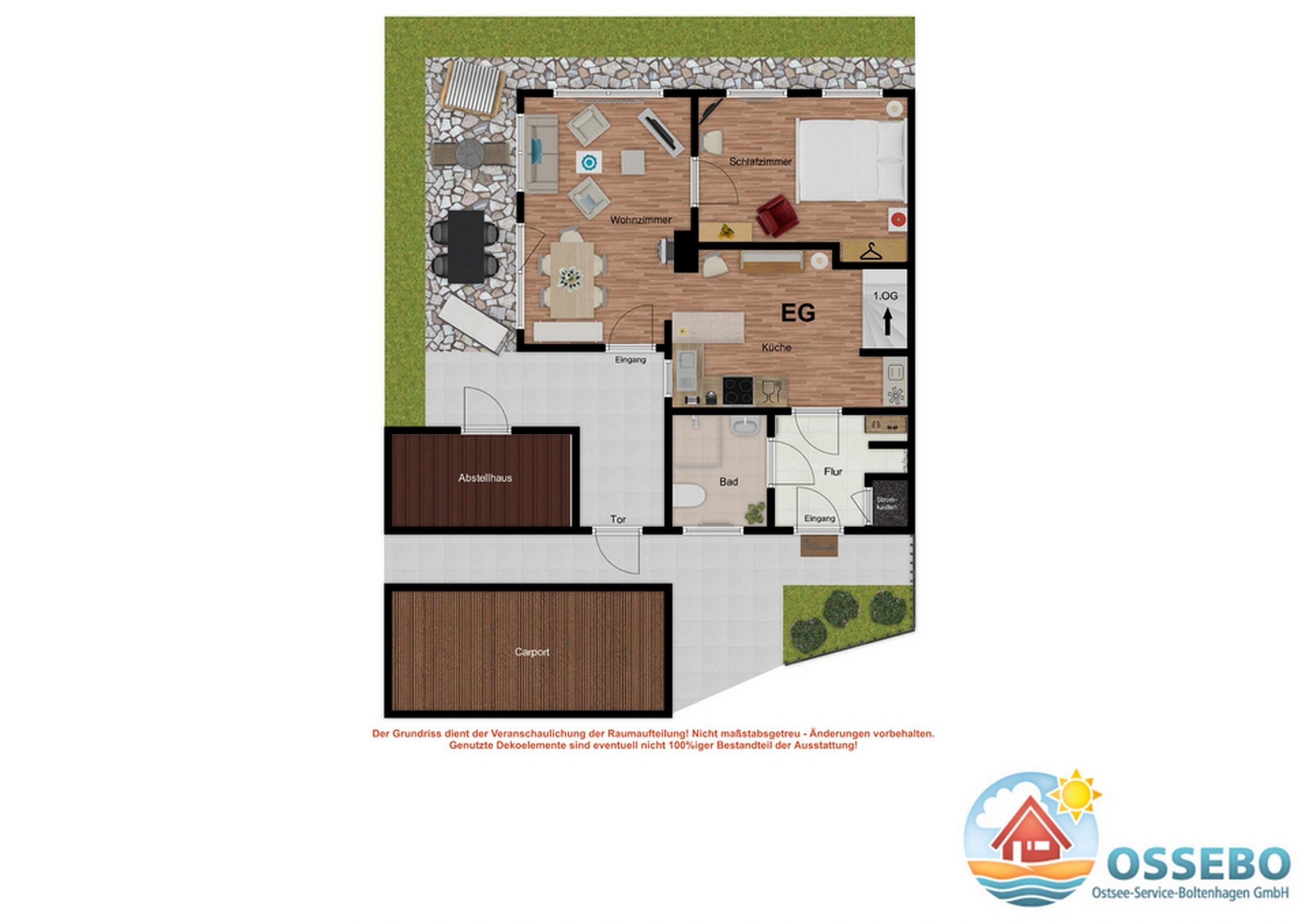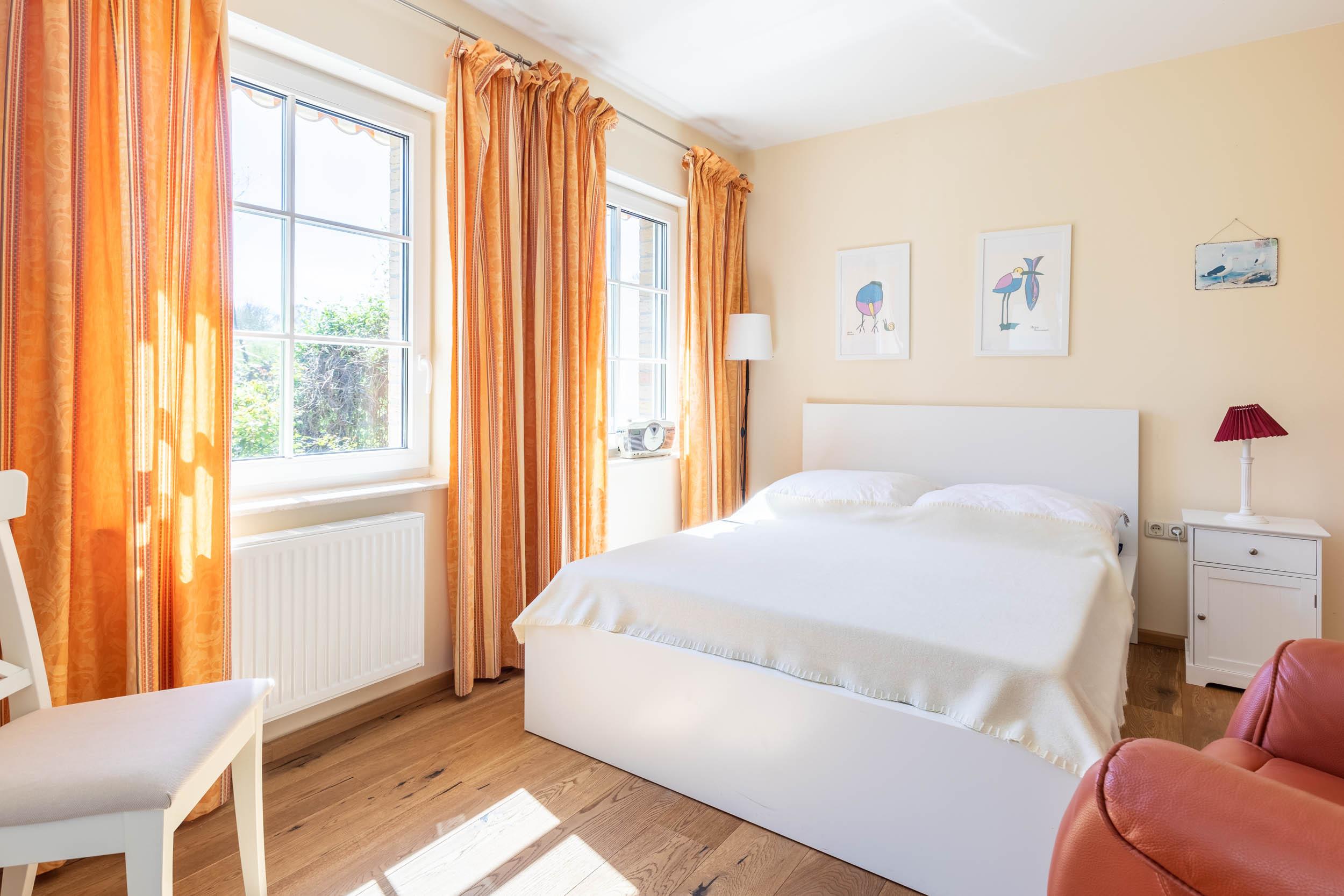Durch die ideale Raumaufteilung im Erdgeschoss hat neben dem Wohn- und Essbereich auch ein Schlafraum mit einem französischen Doppelbett (140x200cm), SAT-TV, Kleiderschrank und Kommode einen Platz gefunden.