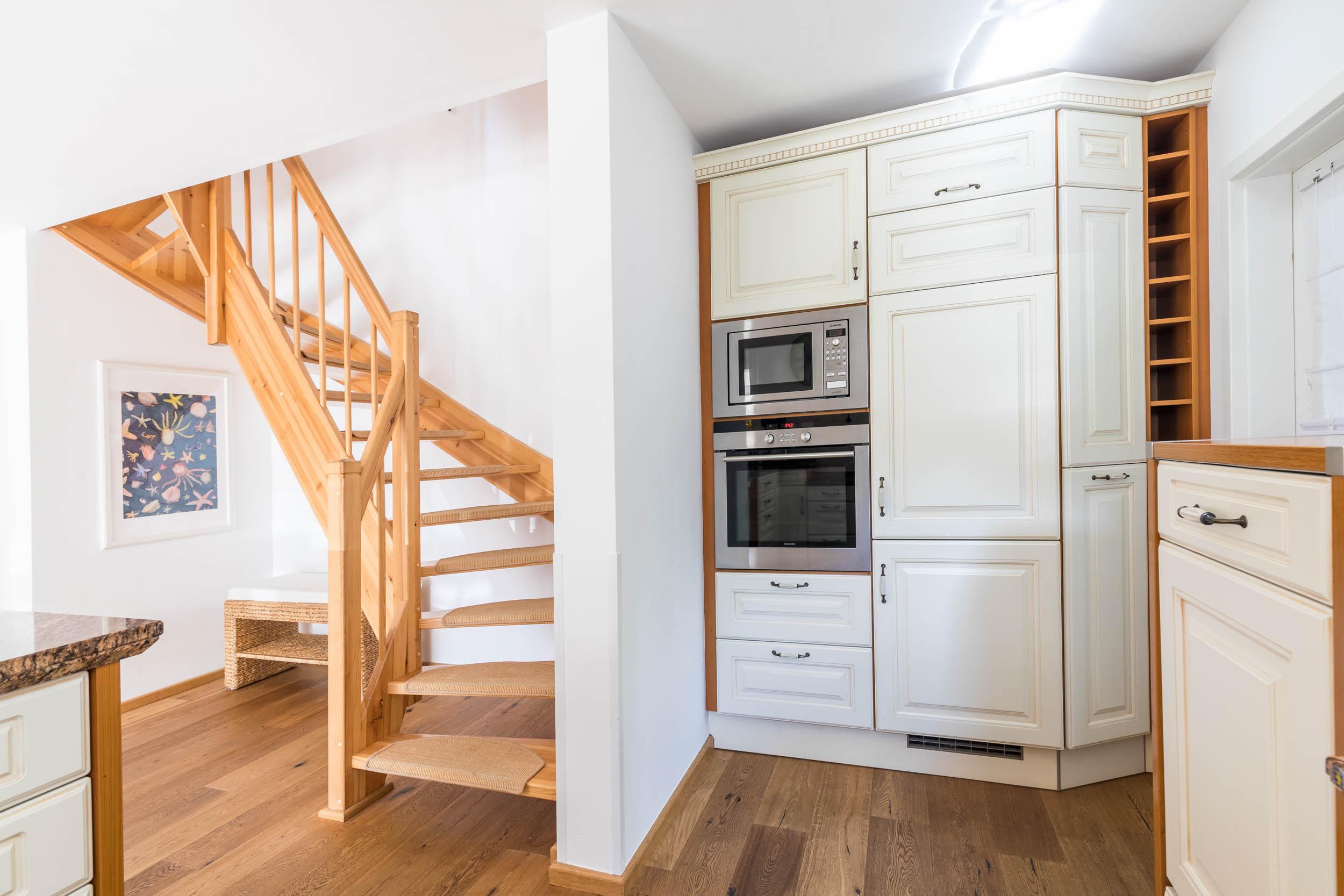 Durch die Küchenzeile mit gehobenem Standard ist das Haus für die Selbstversorgung bestens geeignet. Dort findet man alle Küchengeräte. Neben einem Kühlschrank inklusive Gefrierfach ist ein Herd mit Backofen, eine praktische Spülmaschine, eine Mikrowelle, ein Toaster, ein Wasser- und Eierkocher sowie eine Kaffeemaschine und ein Mixer vorhanden.