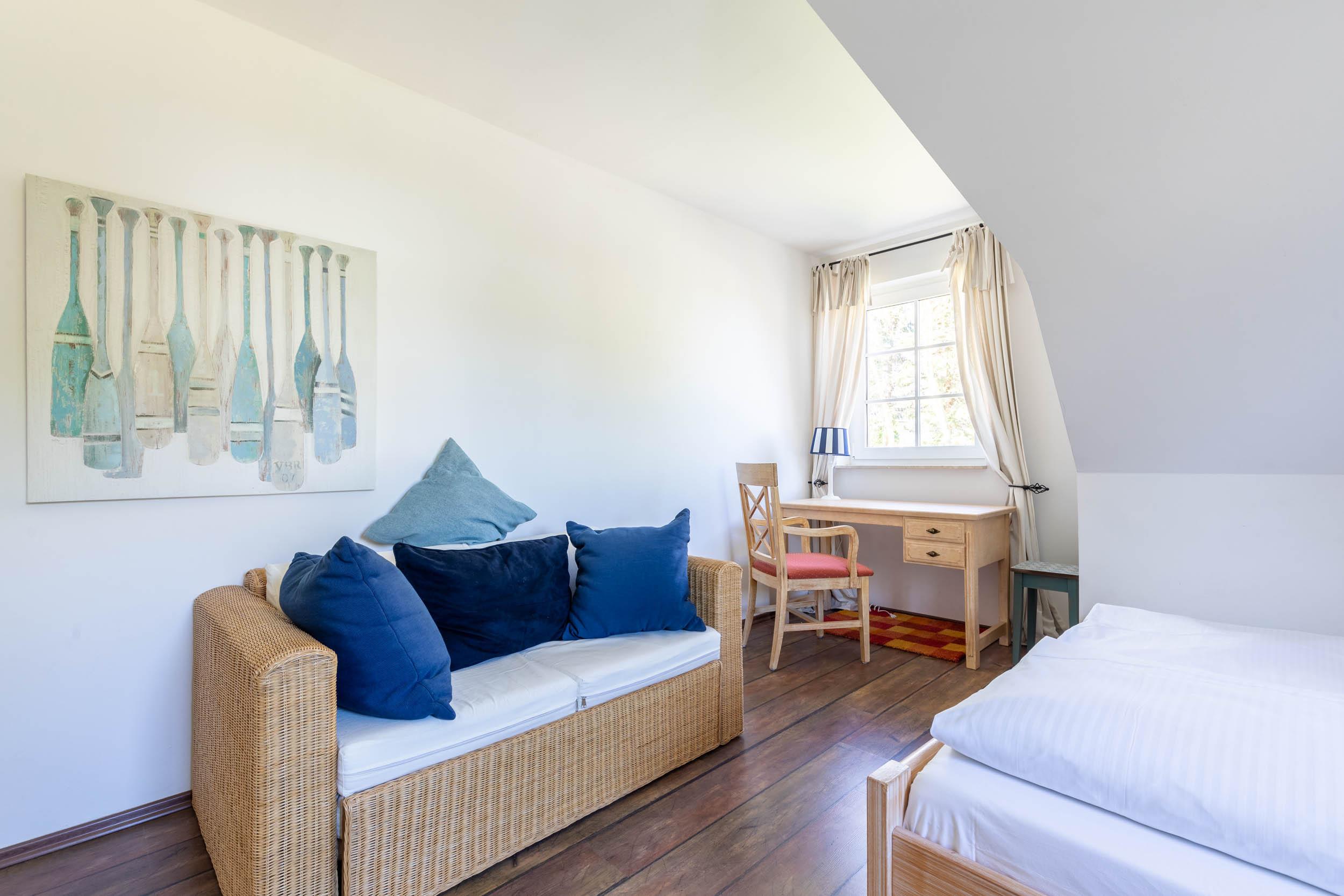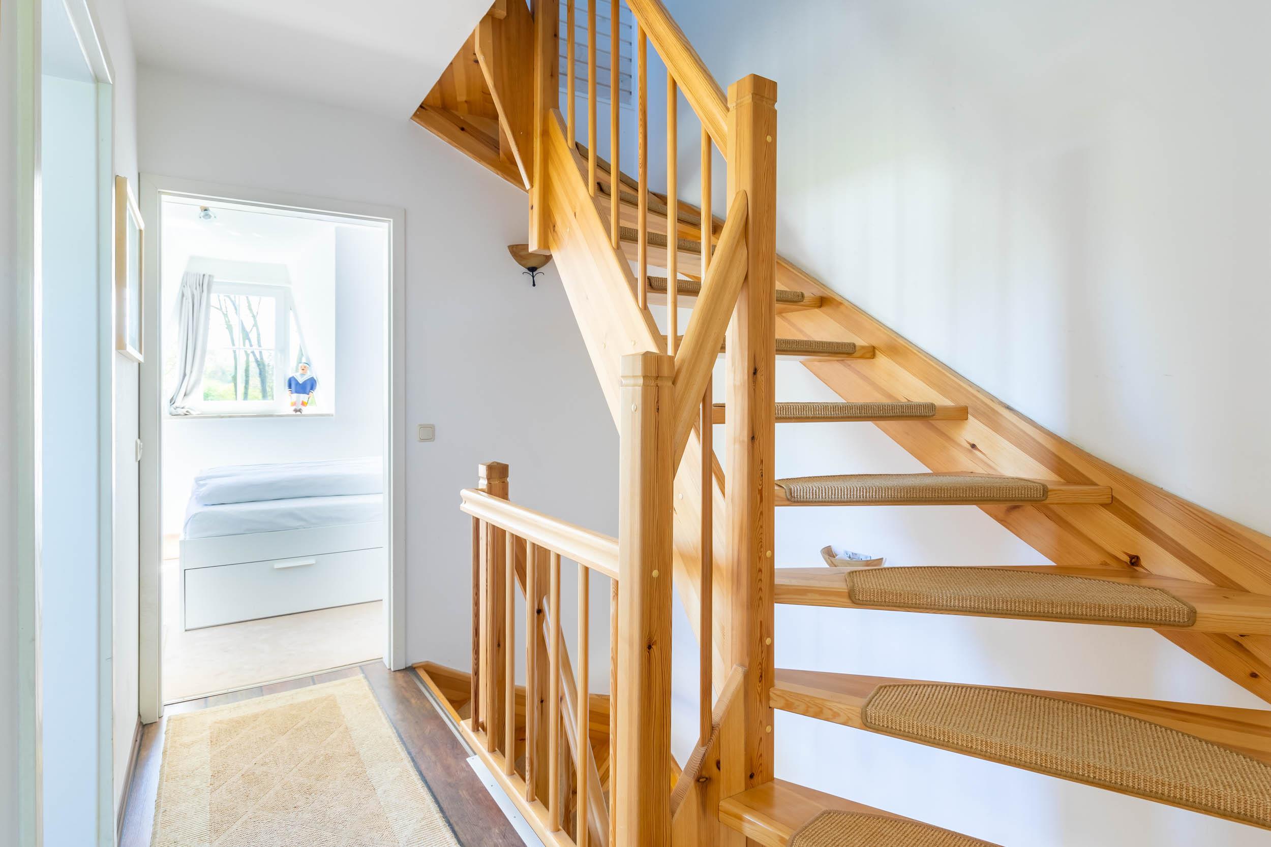 Im 1. Obergeschoss finden Sie zwei weitere Schlafräume mit jeweils einem Doppelbett (1 x 155x200cm sowie 1 x 180x200cm), Kleiderschrank und Sitzmöbel. Weiterhin befindet sich in einem dieser Schlafräume ein Schreibtisch.