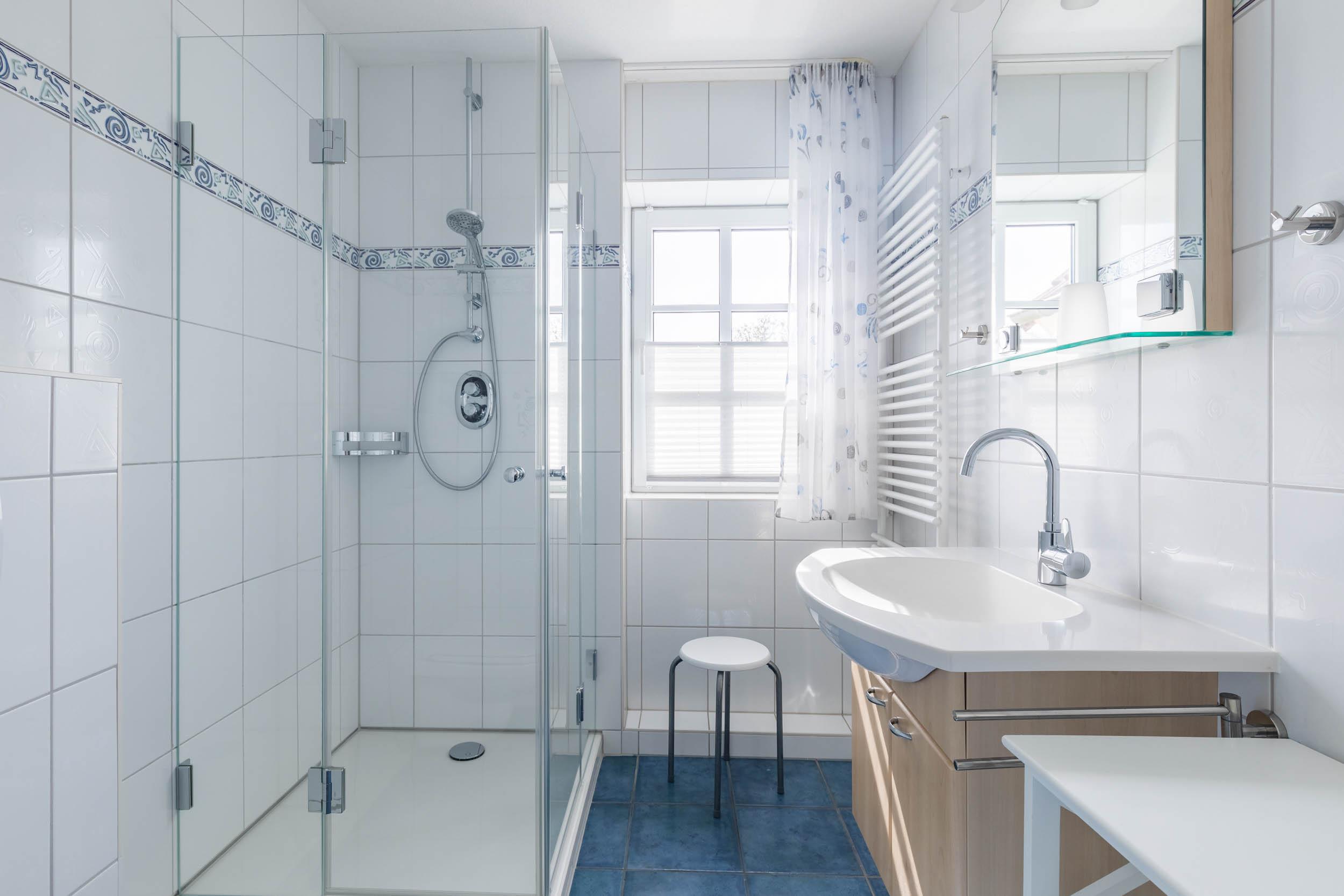 Ein Bad mit Dusche und WC vervollständigt die Ferienwohnung auf dieser Etage. Fenster, Fußbodenheizung und eine gebührenfreie Waschmaschine finden Sie im Badezimmer ebenfalls vor.