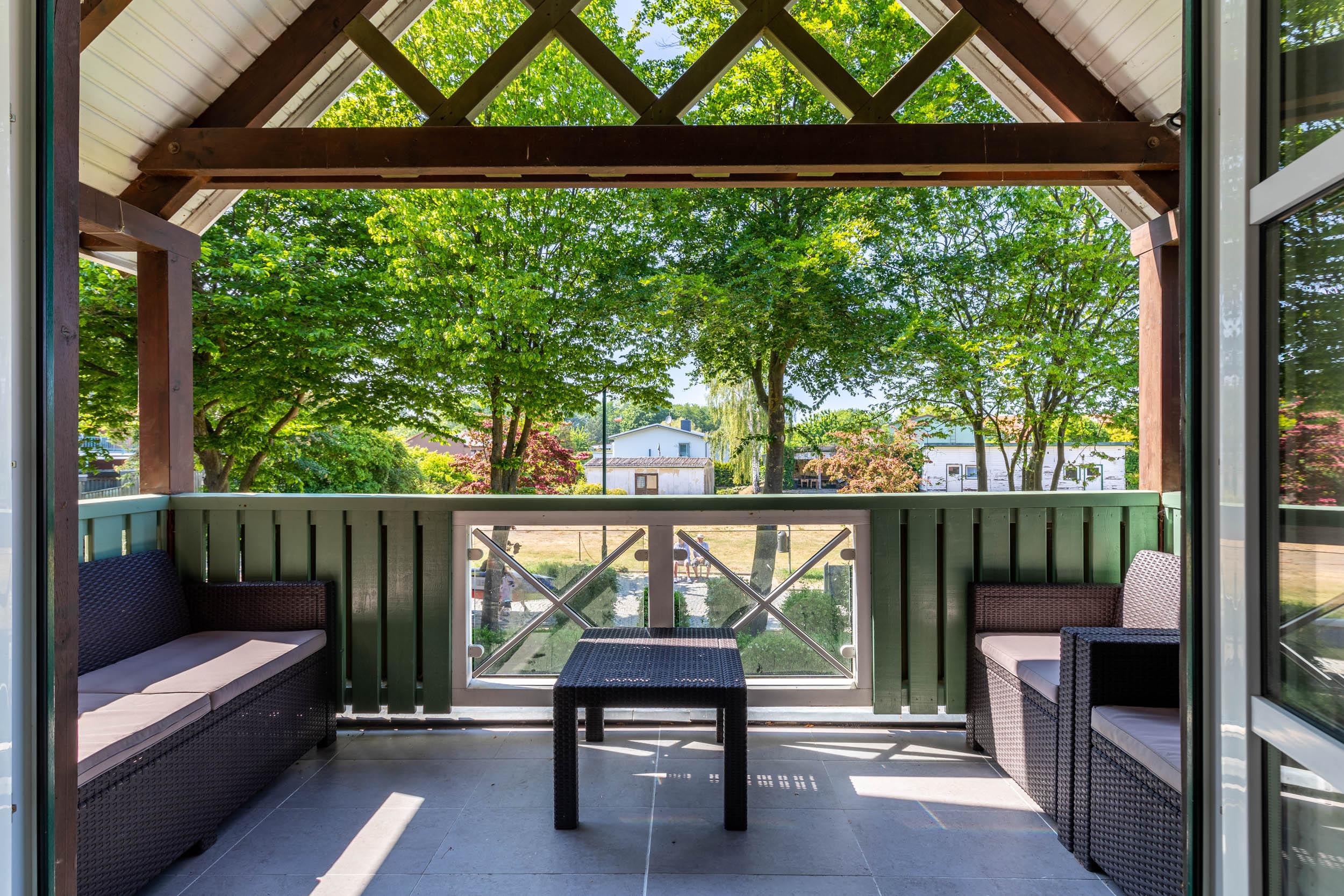 Vom Wohnbereich betreten Sie den möblierten Nordwest-Balkon, auf dem die frische Ostseeluft und der Blick im Winter aufs Meer durch die Bäume genossen werden können.