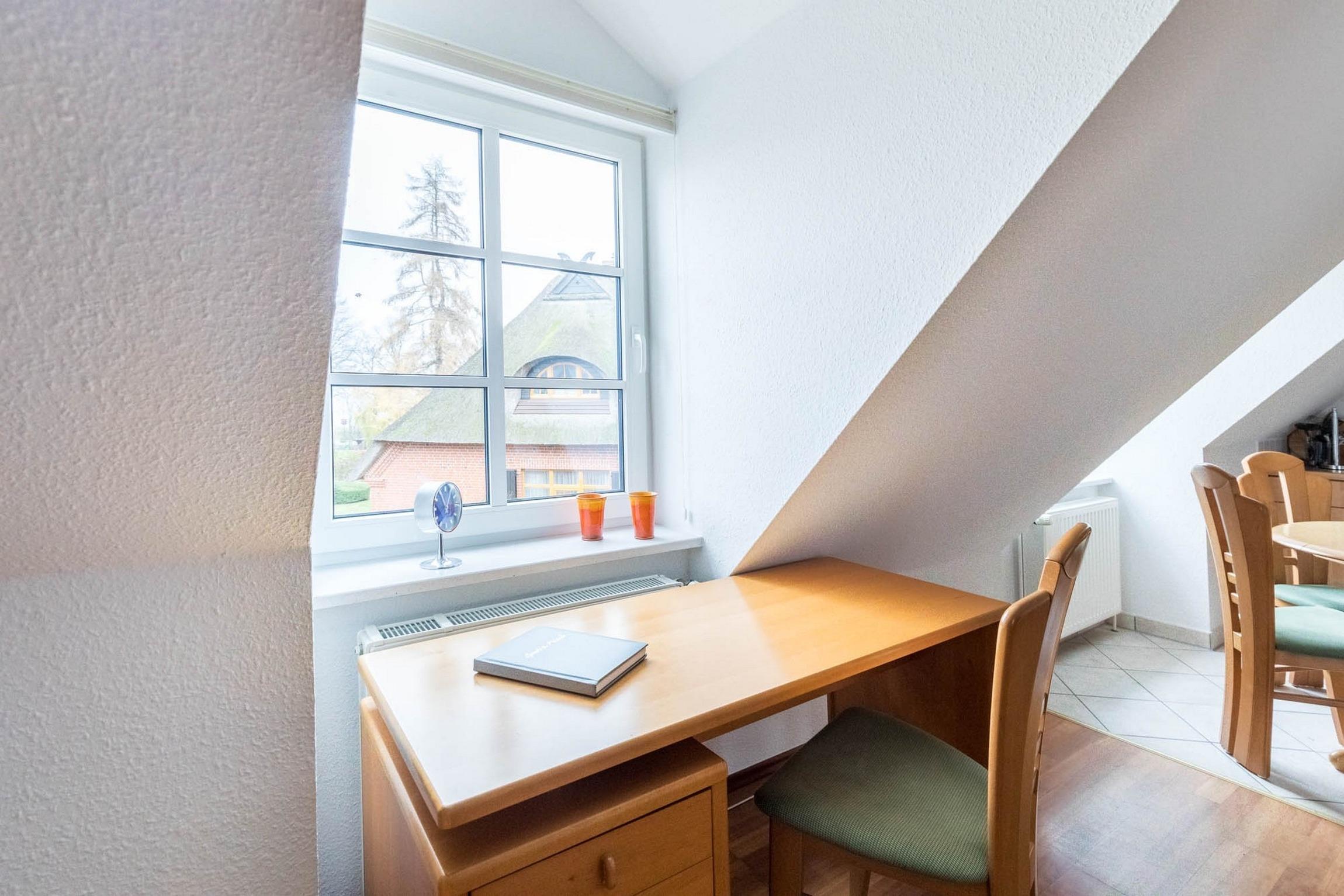 Die räumlich abgeteilte, aber offene Küche verfügt über einen Backofen, ein Cerankochfeld, eine Mikrowelle sowie über eine Kaffeemaschine. Es Esstisch mit Fenster können Sie bequem sitzen.