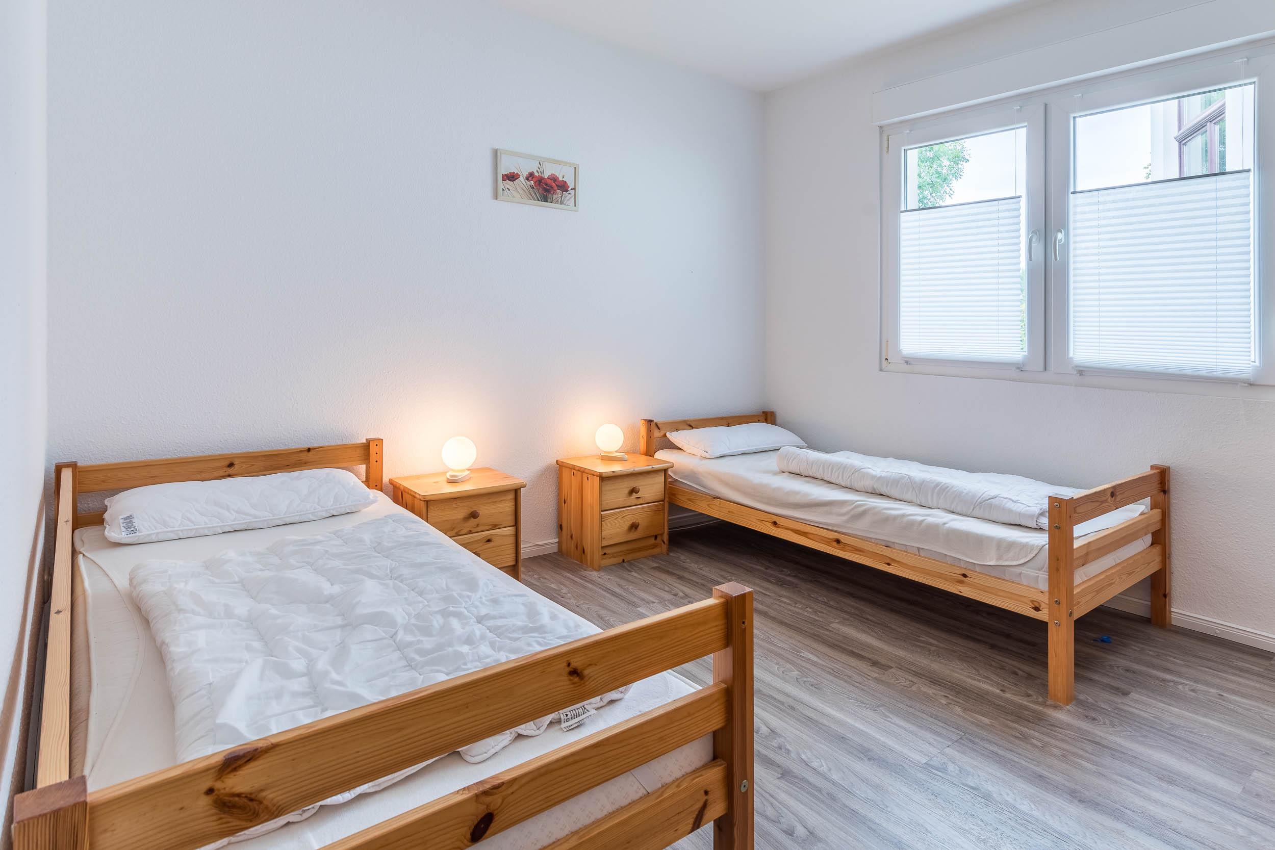 Die Wohnung bietet familienfreundliche Schlafmöglichkeiten: ein Schlafzimmer mit Doppelbett und Kleiderschrank sowie ein Gäste-/ Kinderzimmer mit 2 Einzelbetten, einer Kommode und einem Fernseher.