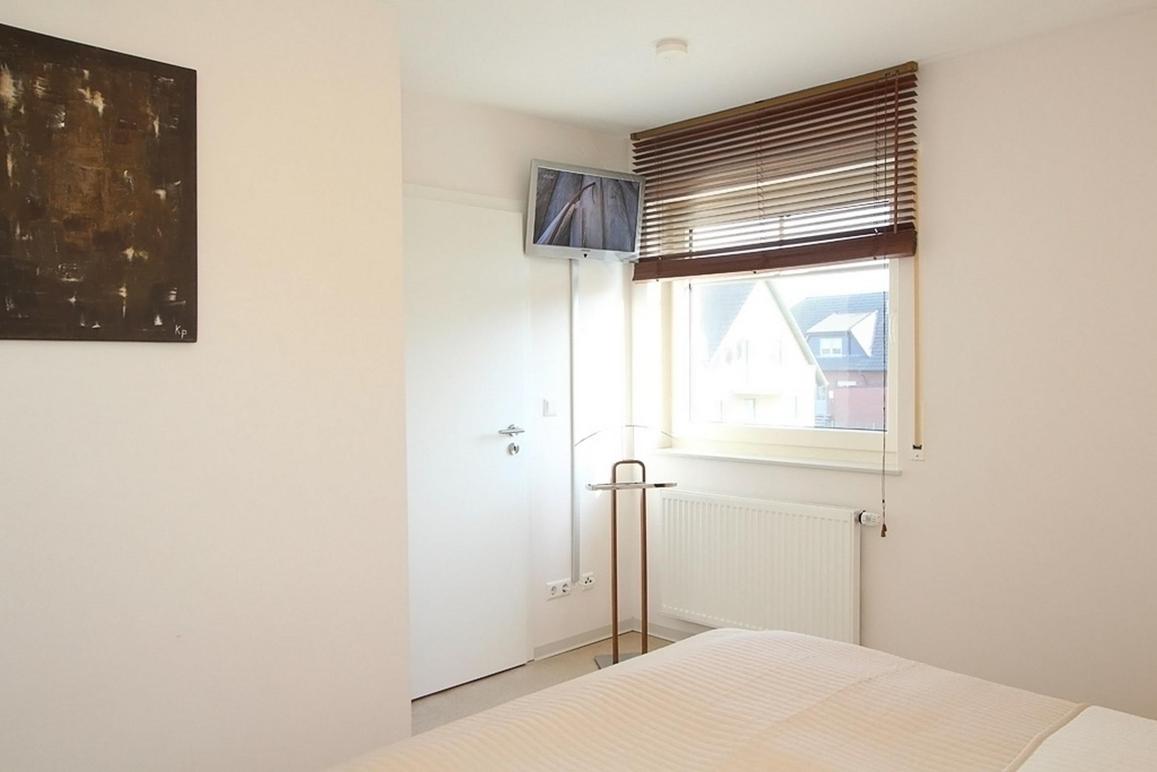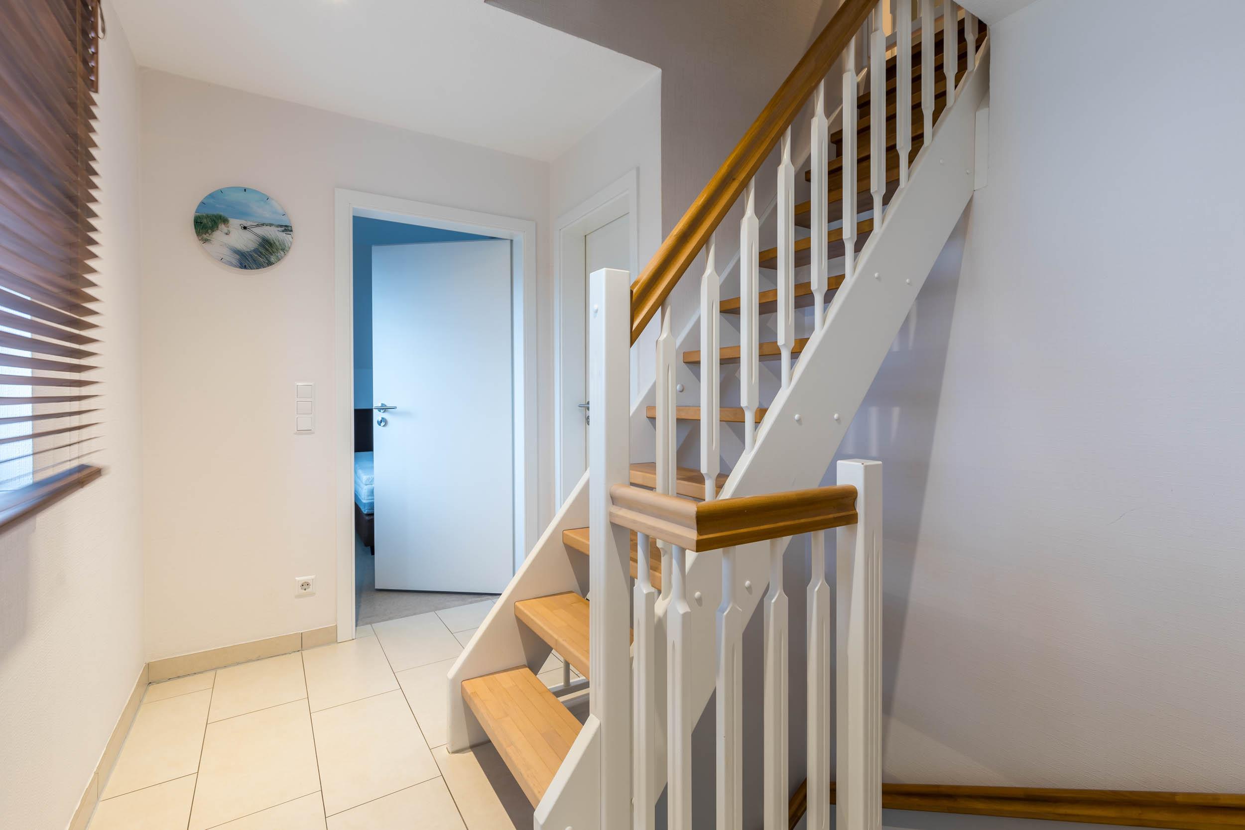 Im 1. Obergeschoss, welche Sie über eine geflieste Treppe erreichen, befindet sich ein Schlafzimmer mit Boxspringbett (180x200cm) und geräumigem Kleiderschrank sowie ebenfalls SAT-TV.