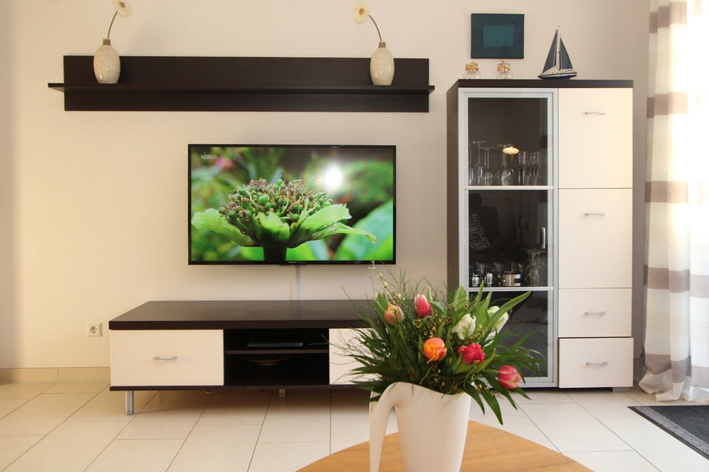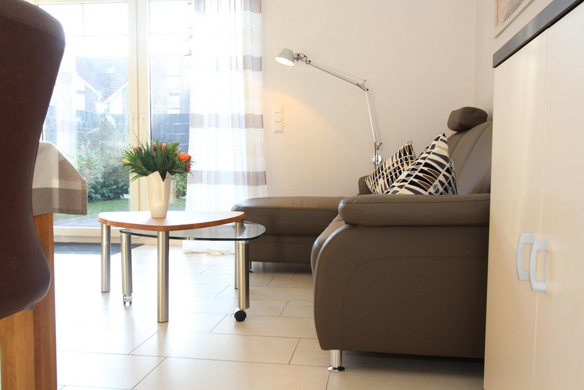 Im Erdgeschoss befindet sich neben einer mit hochwertigen Elektrogeräten und sämtlichem Zubehör ausgestatteten Küche inklusive Essecke ein gemütlicher Wohnbereich mit einem 50 Zoll Flachbildfernseher mit WLAN, DVD-Player und Stereoanlage. Auch ein Reisebettchen könnte hier bei Bedarf aufgestellt werden.