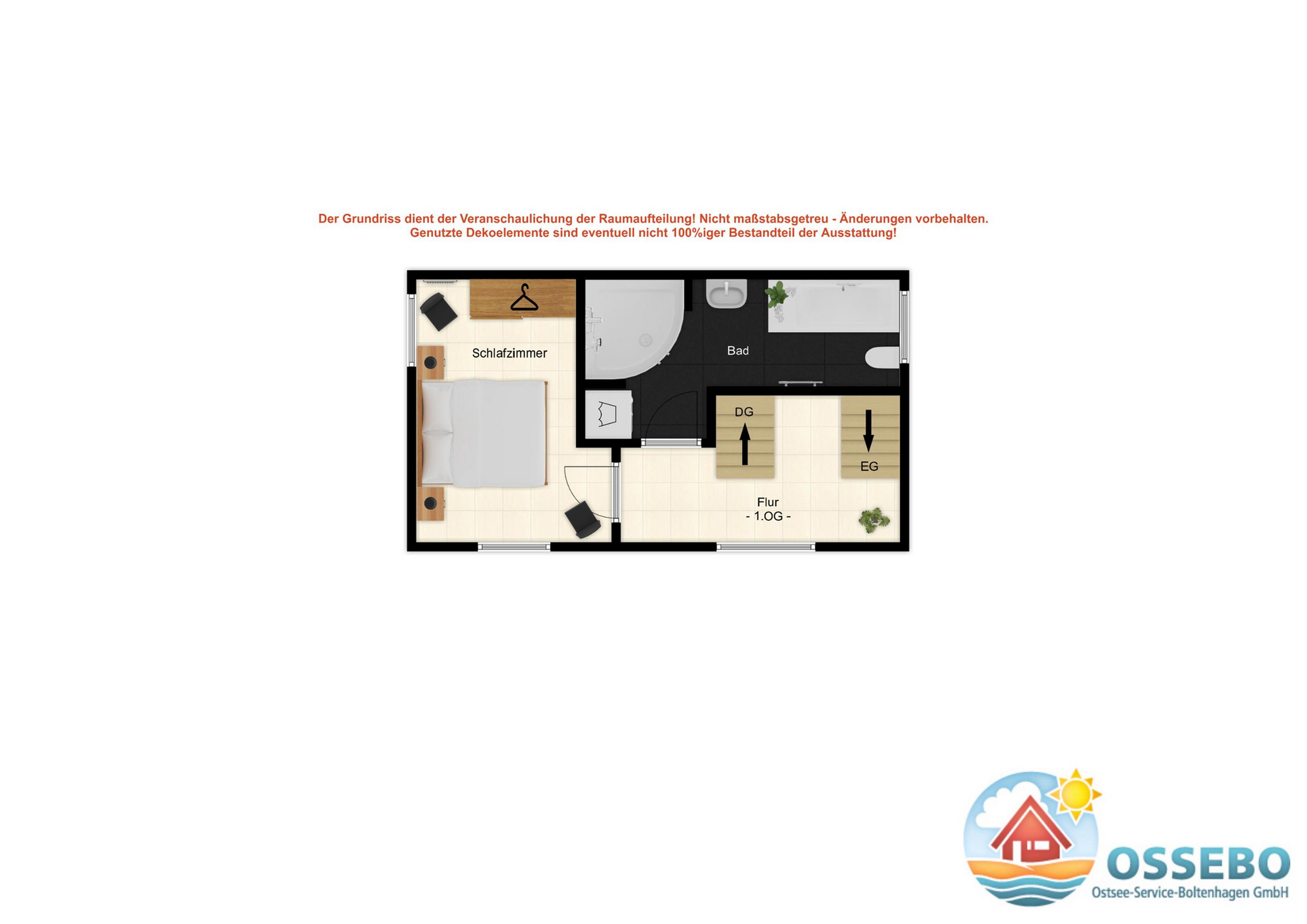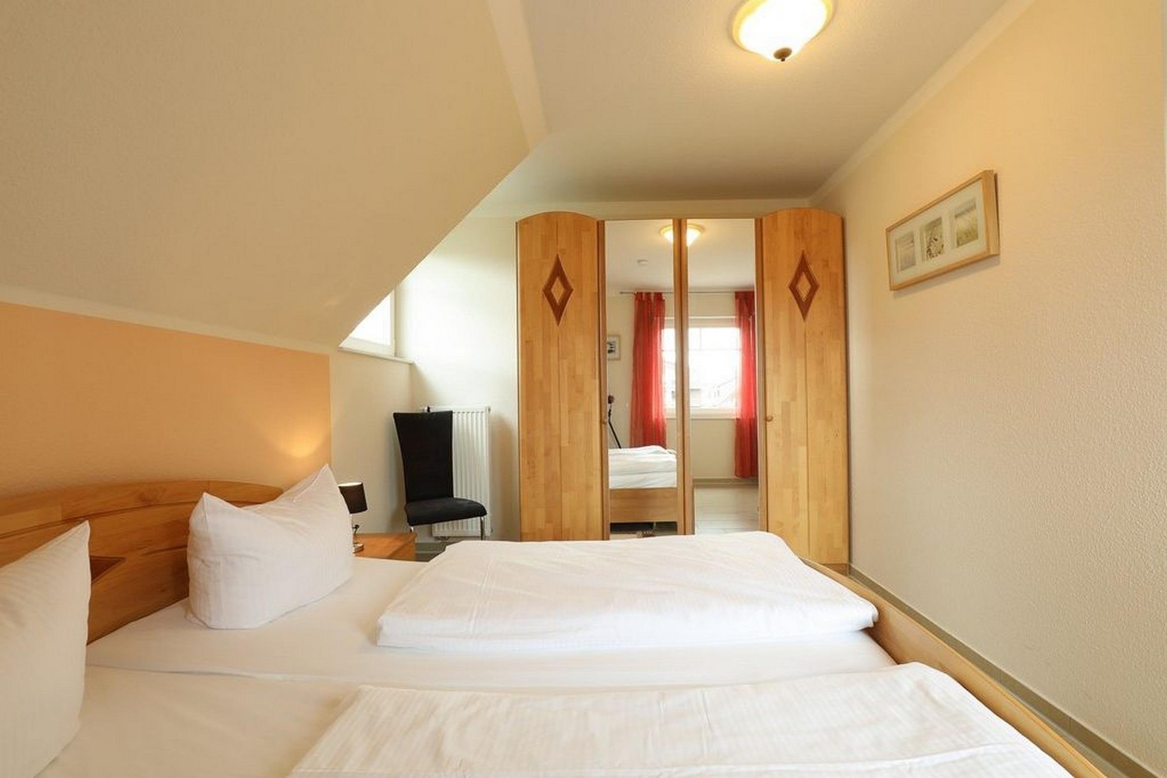 Im 1.OG, welche Sie über eine geflieste Treppe erreichen, ist ein Schlafzimmer mit einem bequemen Doppelbett (180x200cm) und großem Kleiderschrank eingerichtet. In diesem Zimmer könnte ebenfalls noch zusätzlich ein Reisebettchen aufgestellt werden.