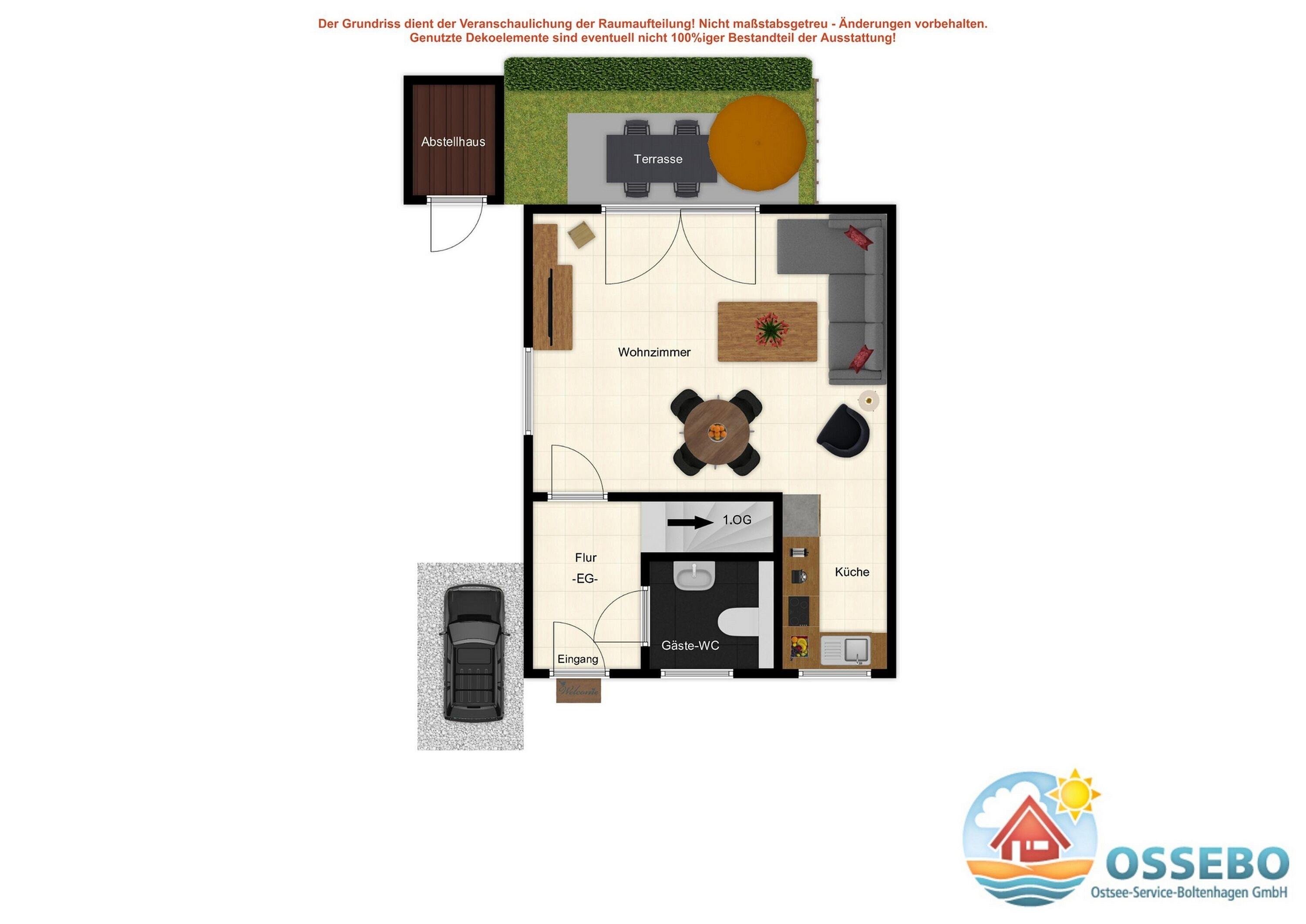 Im Erdgeschoss befinden sich das Wohnzimmer mit offener Küchenzeile, ein Gäste-WC und die möblierte Südwest-Terrasse, auf welcher Sie auch gern grillen dürfen.