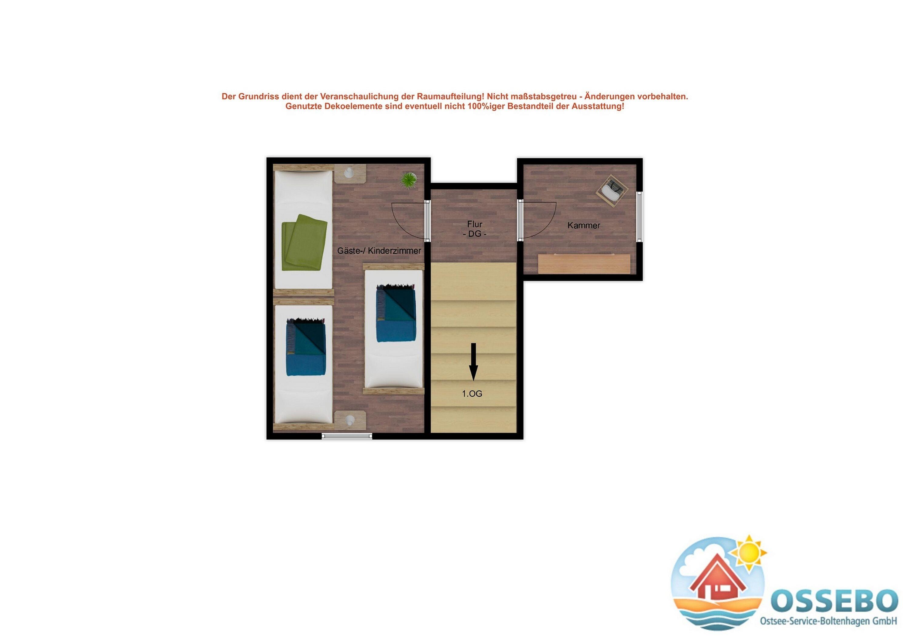 Im Dachgeschoss, welches Sie über eine offene Holztreppe erreichen, befindet sich das Kinder-/ Gästezimmer mit 3 Einzelbetten (je 90x200cm).