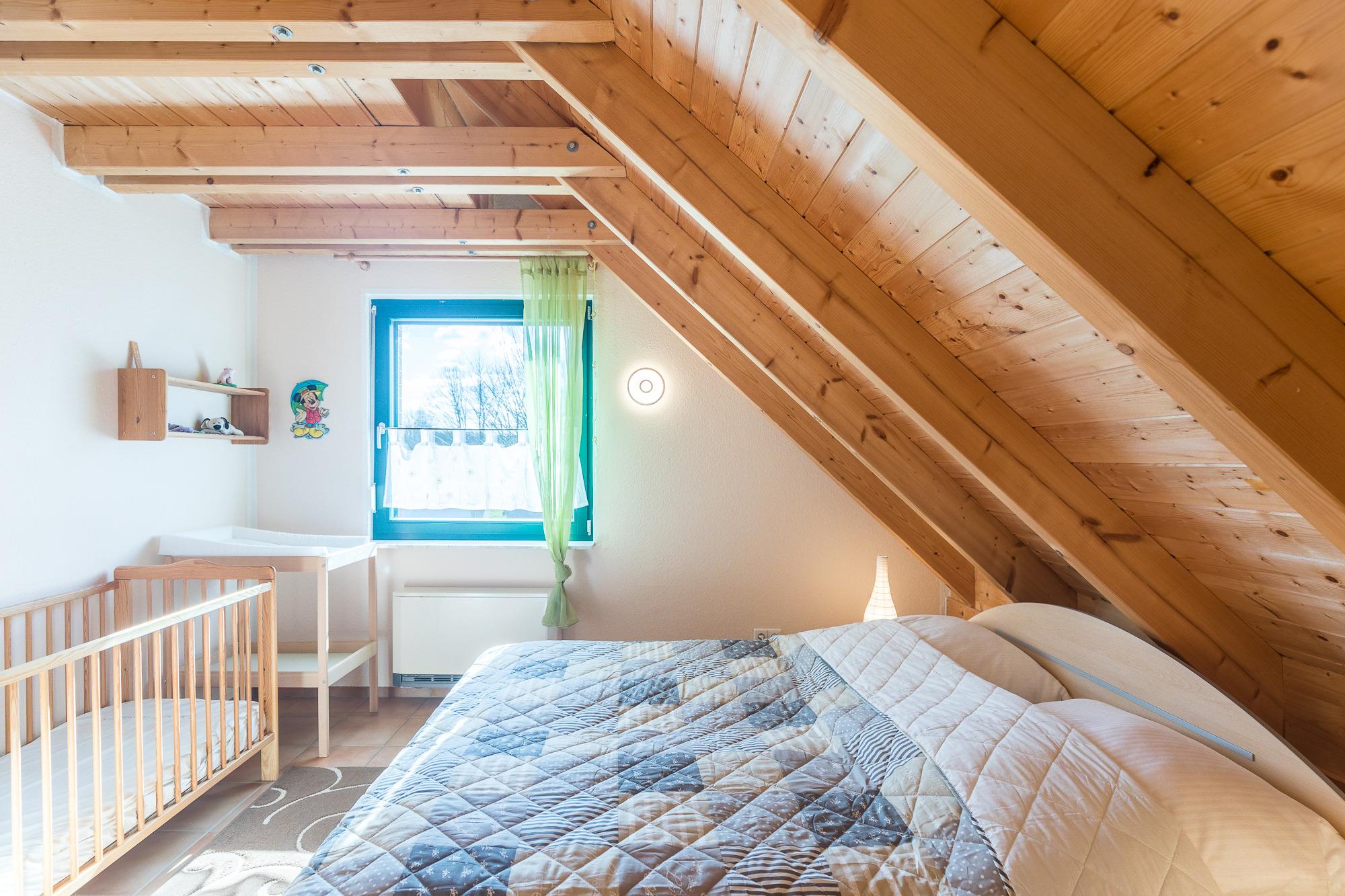 Vom Flur aus führt eine Treppe ins 1.Obergeschoss. Hier sind 2 Schlafzimmer mit jeweils einem Doppelbett und Kleiderschrank eingerichtet. In einem dieser Schlafzimmer befindet sich weiterhin ein festes Holz-Gitterbett und ein Wickeltisch, in dem Anderen gibt es einen Flatscreen-TV und eine Kommode als weitere Ablagemöglichkeit.