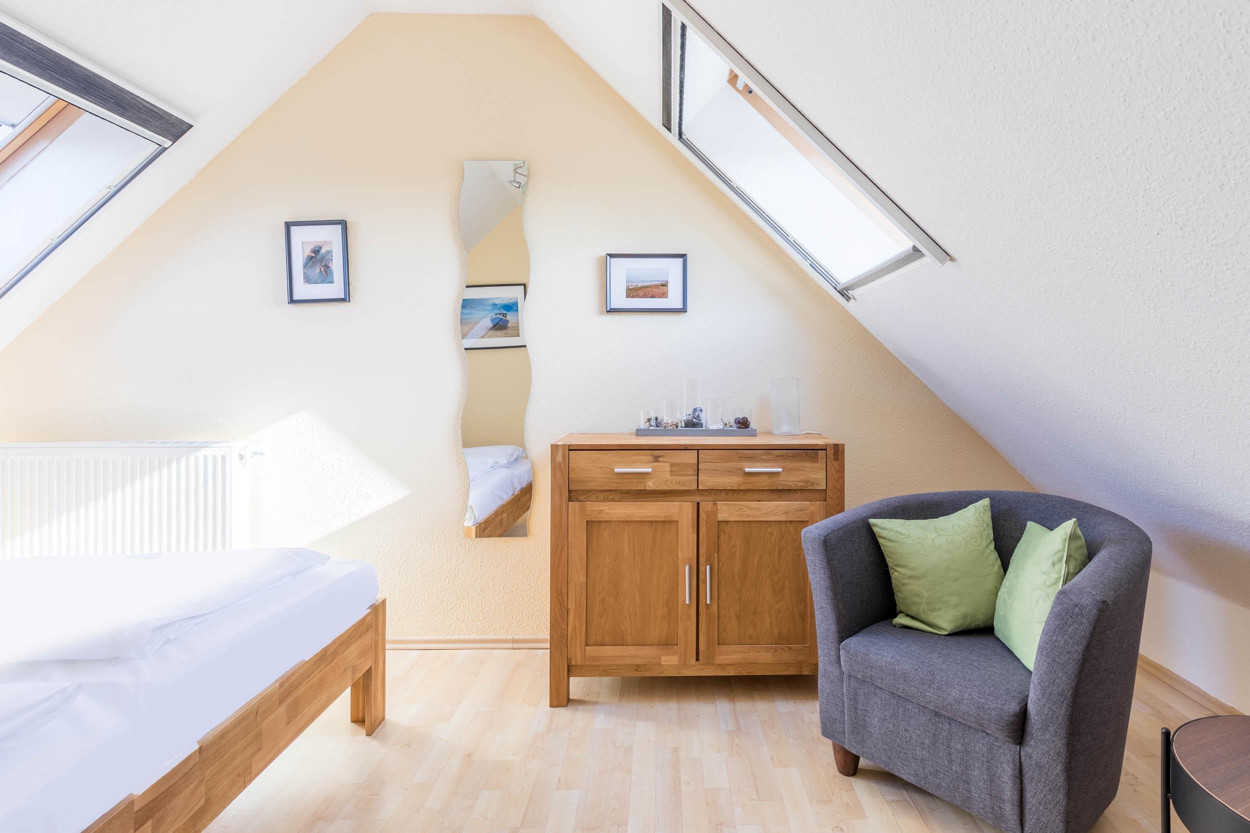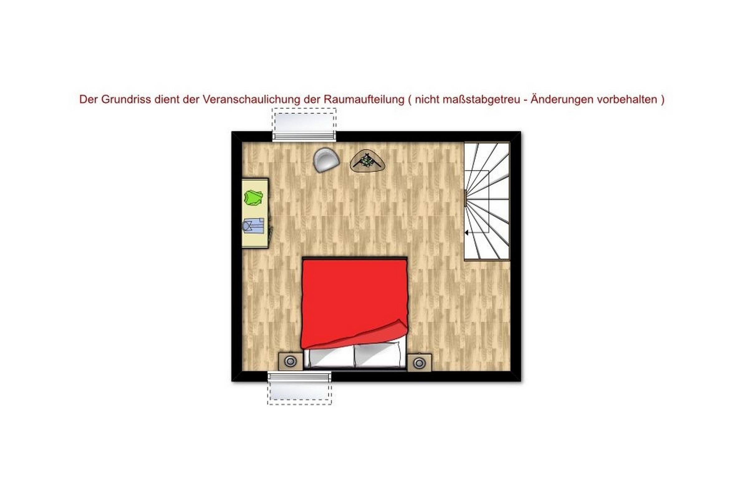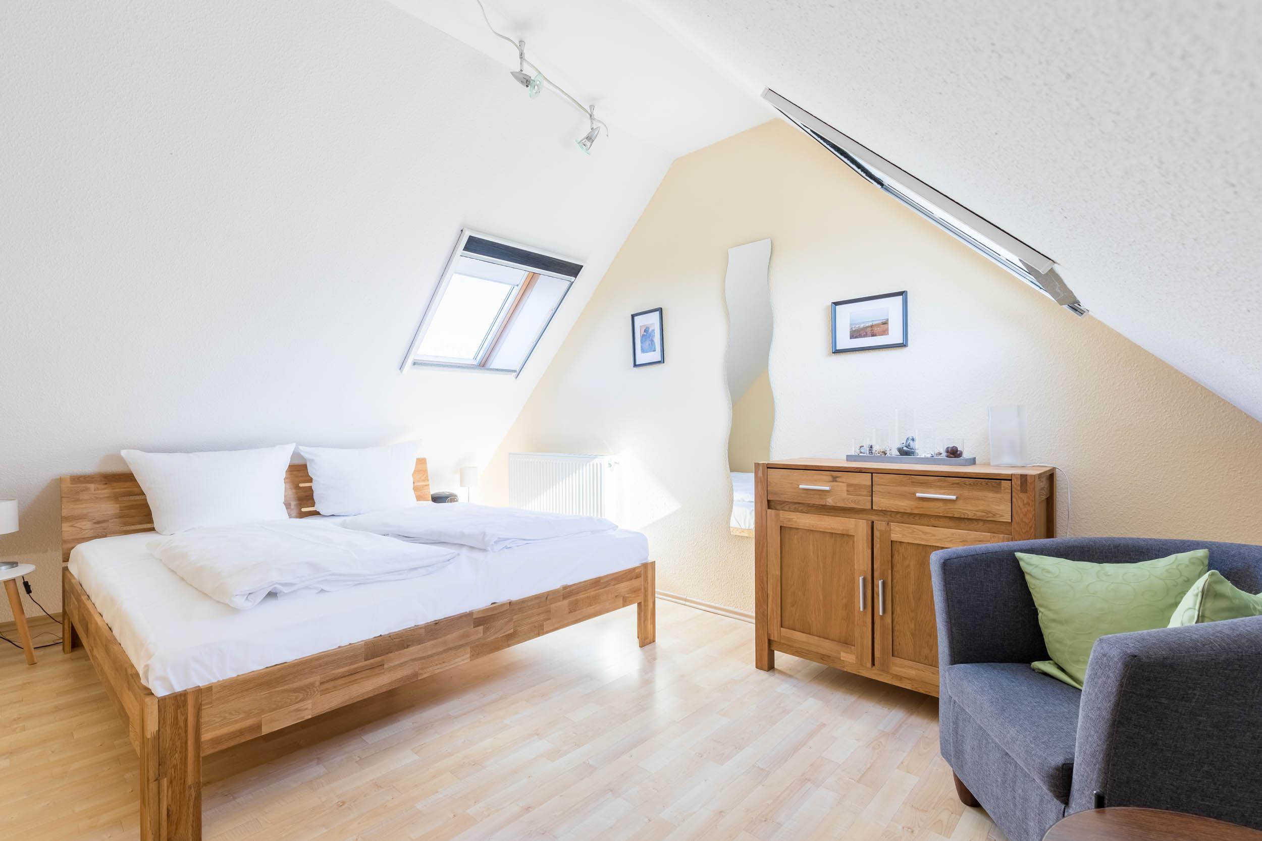 Vom Flur aus führt die Treppe weiter ins Dachgeschoss. In dieser Etage gibt es ein weiteres Schlafreich. Wer Ruhe braucht, ist hier bestens aufgehoben! Auch in diesem Zimmer sorgt ein großes Doppelbett für erholsamen Schlaf.